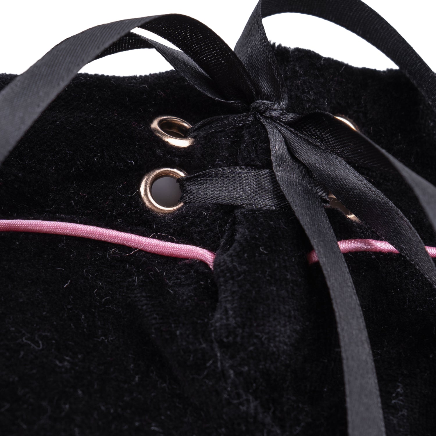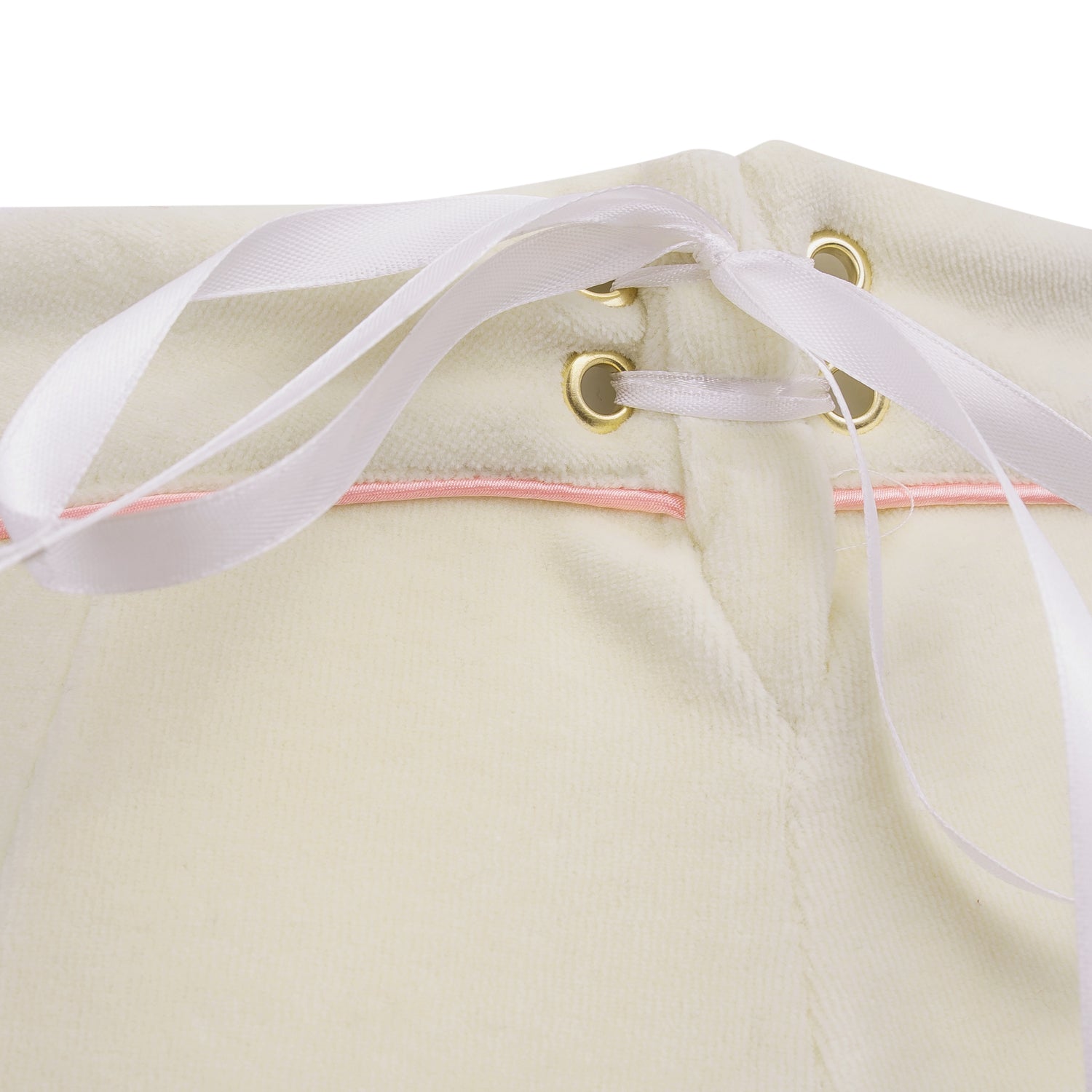High-waisted model, fastened with a button and zip, with an additional waist tie finished with metal eyelets and a satin ribbon.