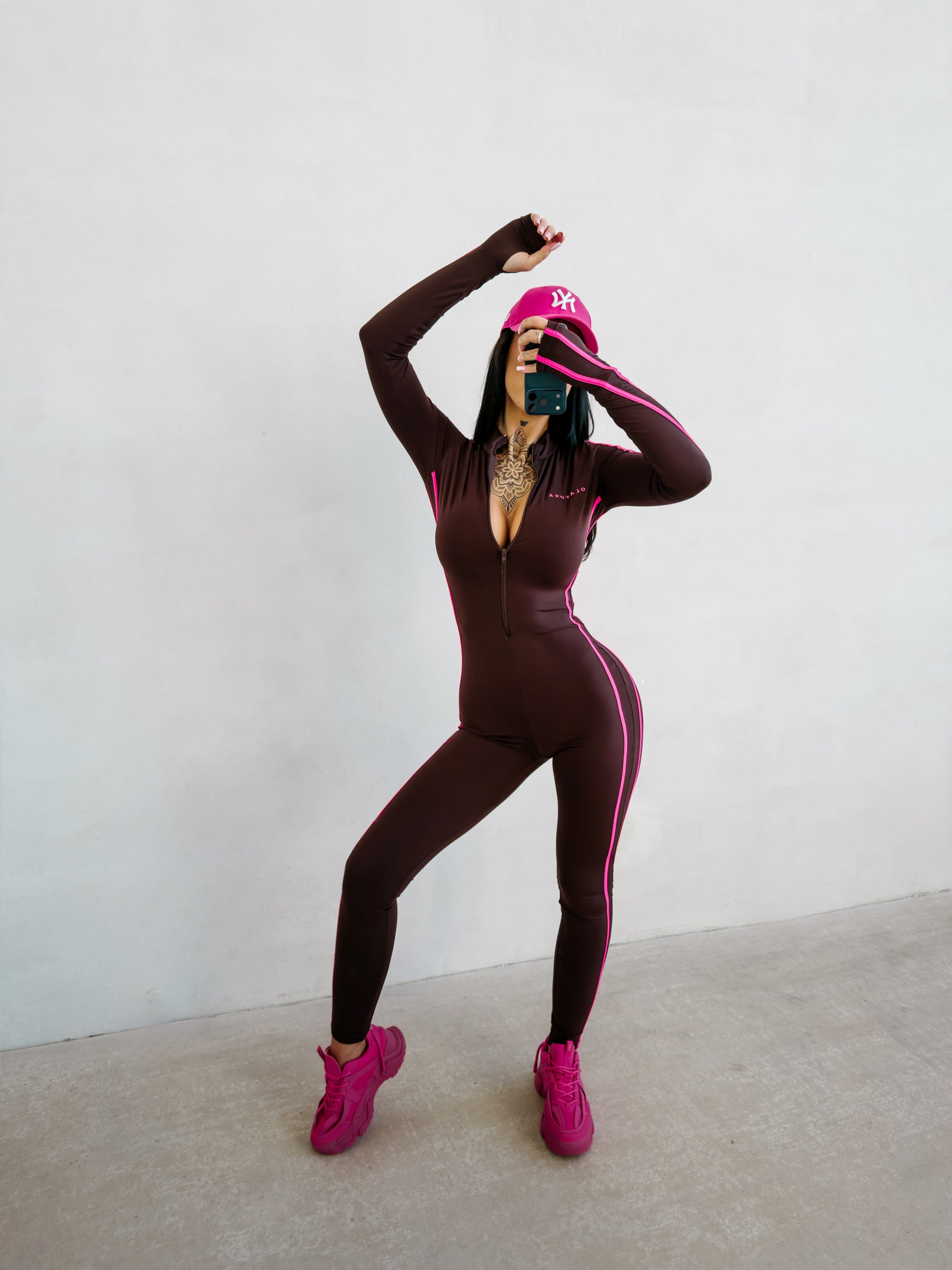 Fitted, body-shaping jumpsuit made from high-quality elastic fabric. Long sleeve design with a high collar fastened with a zip. Contrast side stripes along the sleeves and legs. Subtle OLAVOGA logo on the front.