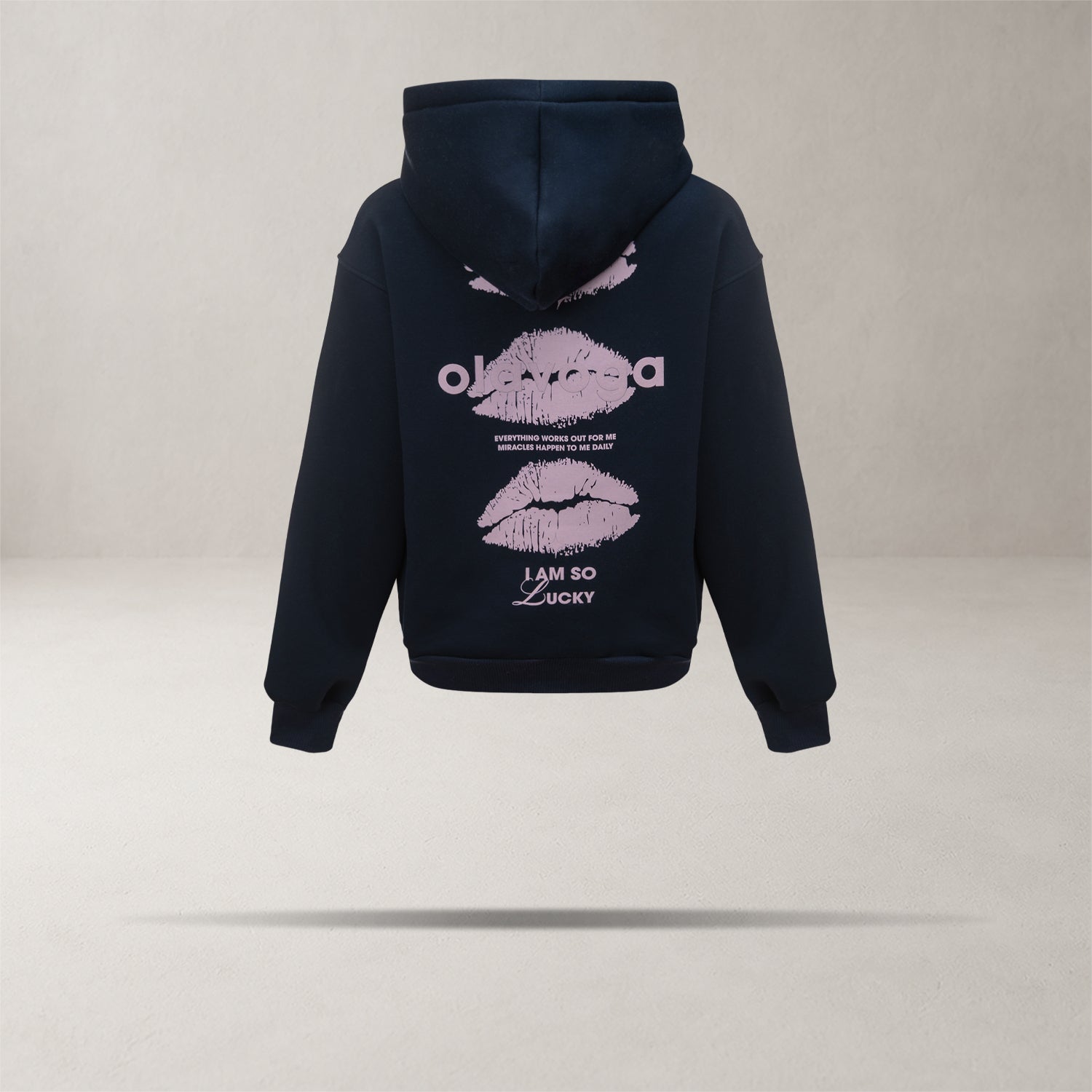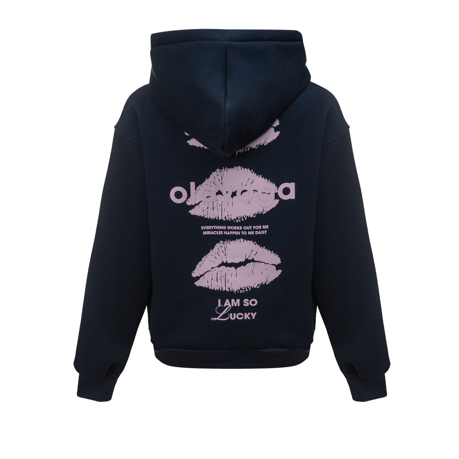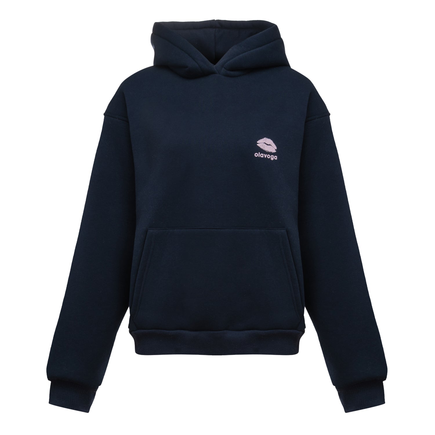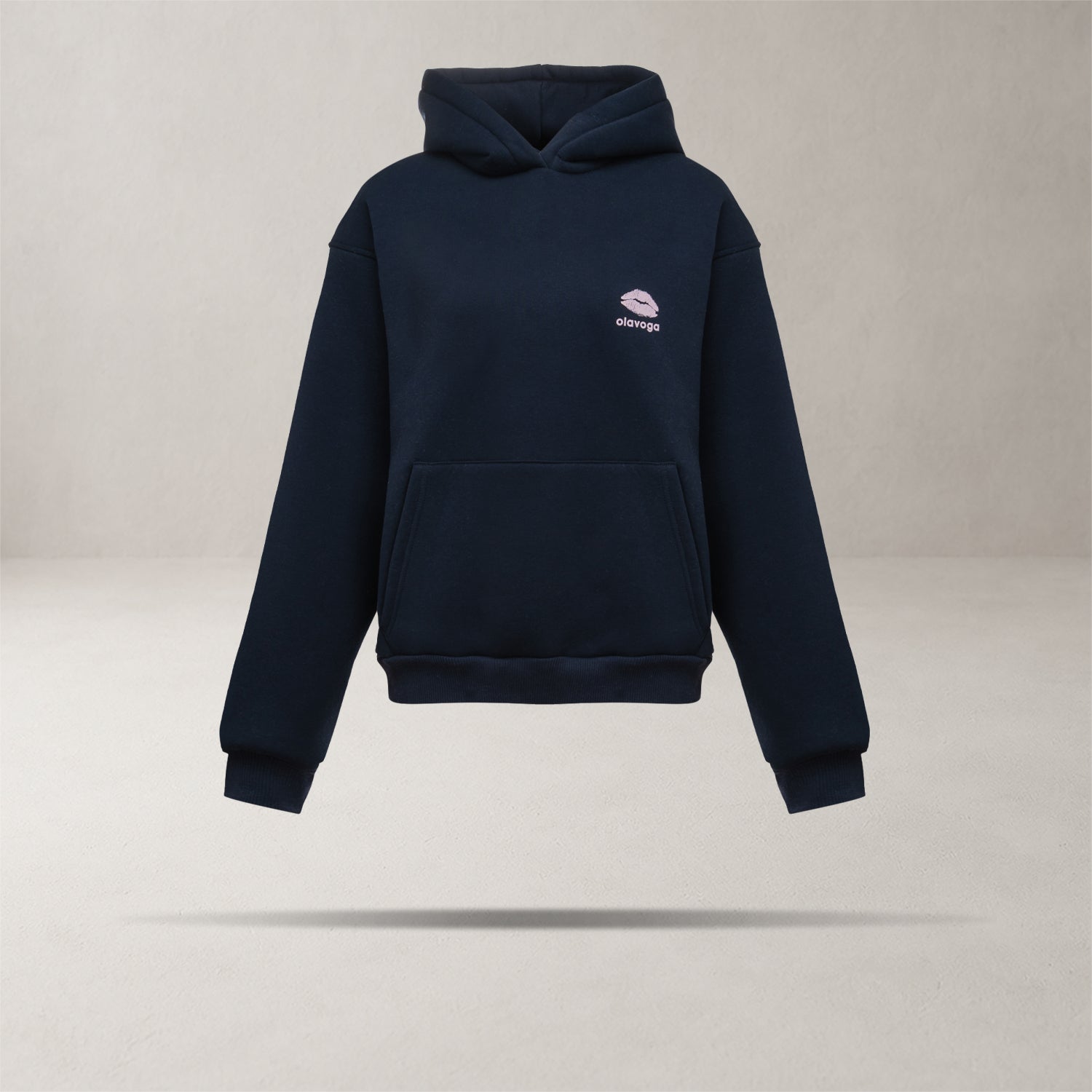 Key features: hood, comfortable fit, soft knit fabric, lips graphic on the back, slogan print, OLAVOGA branding, casual statement style.