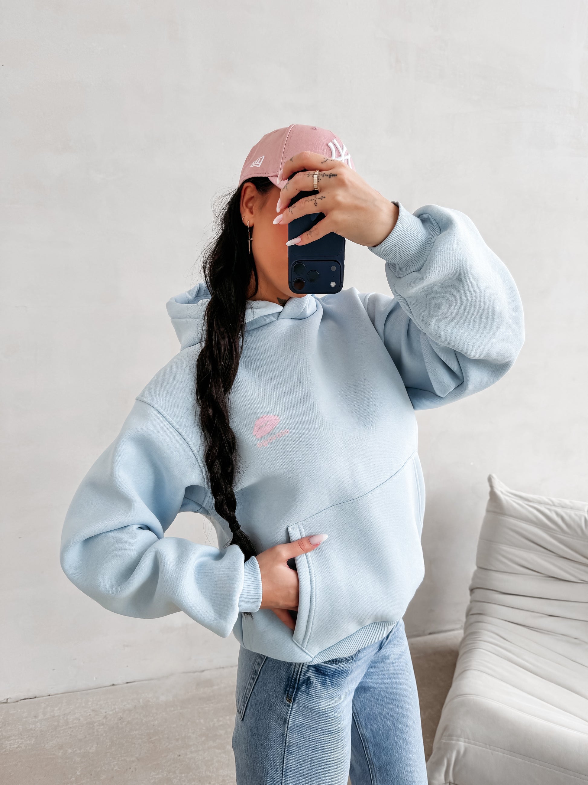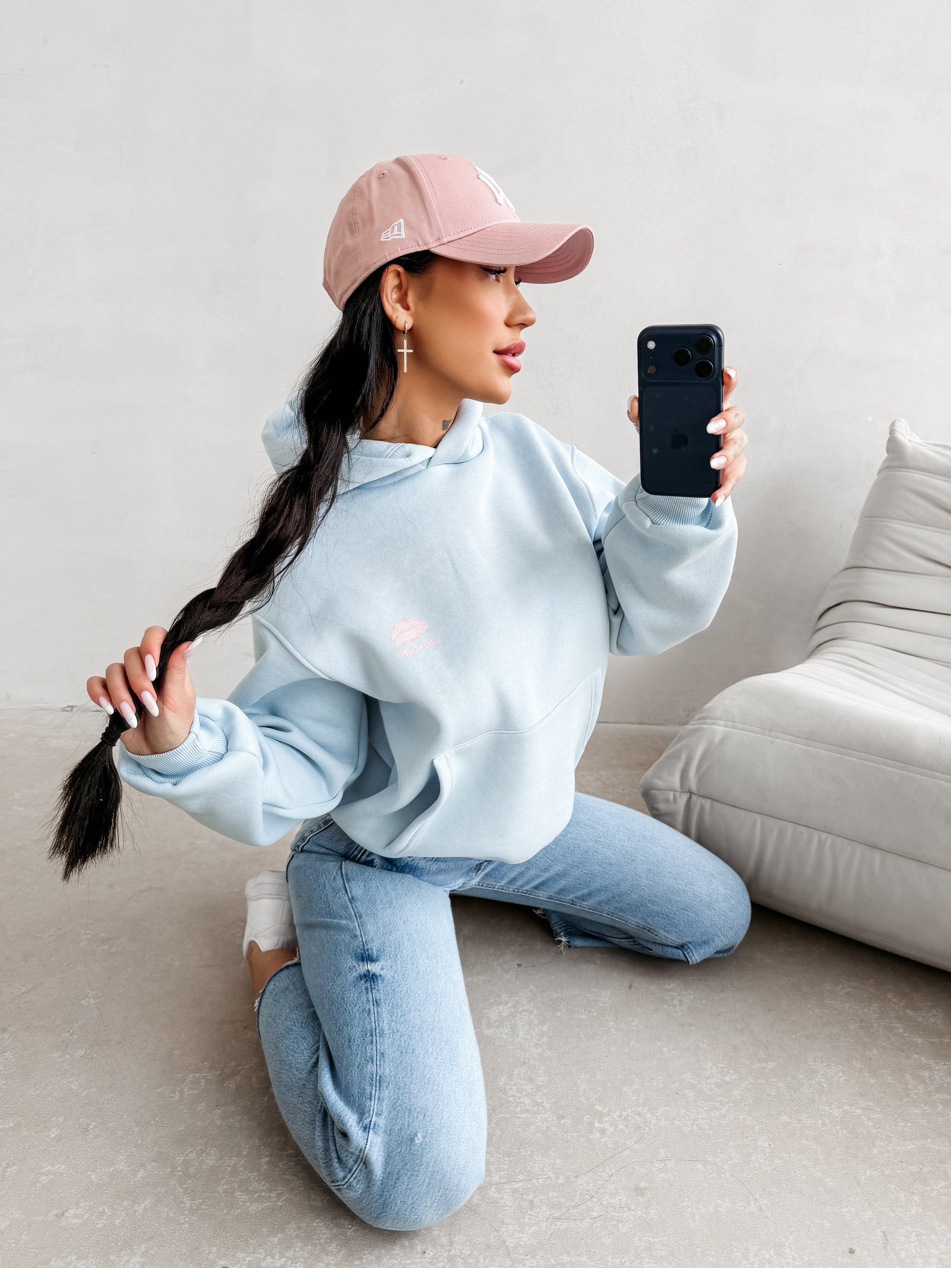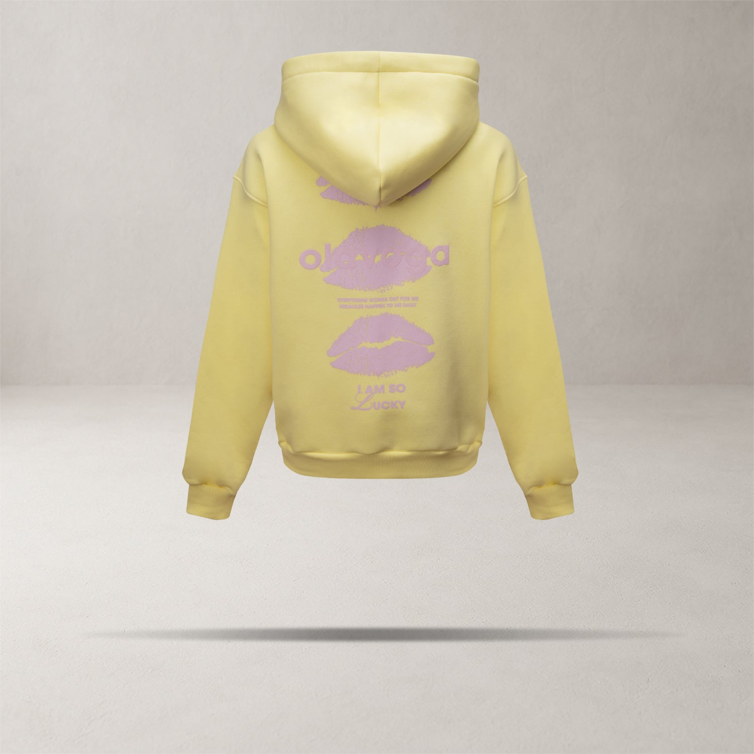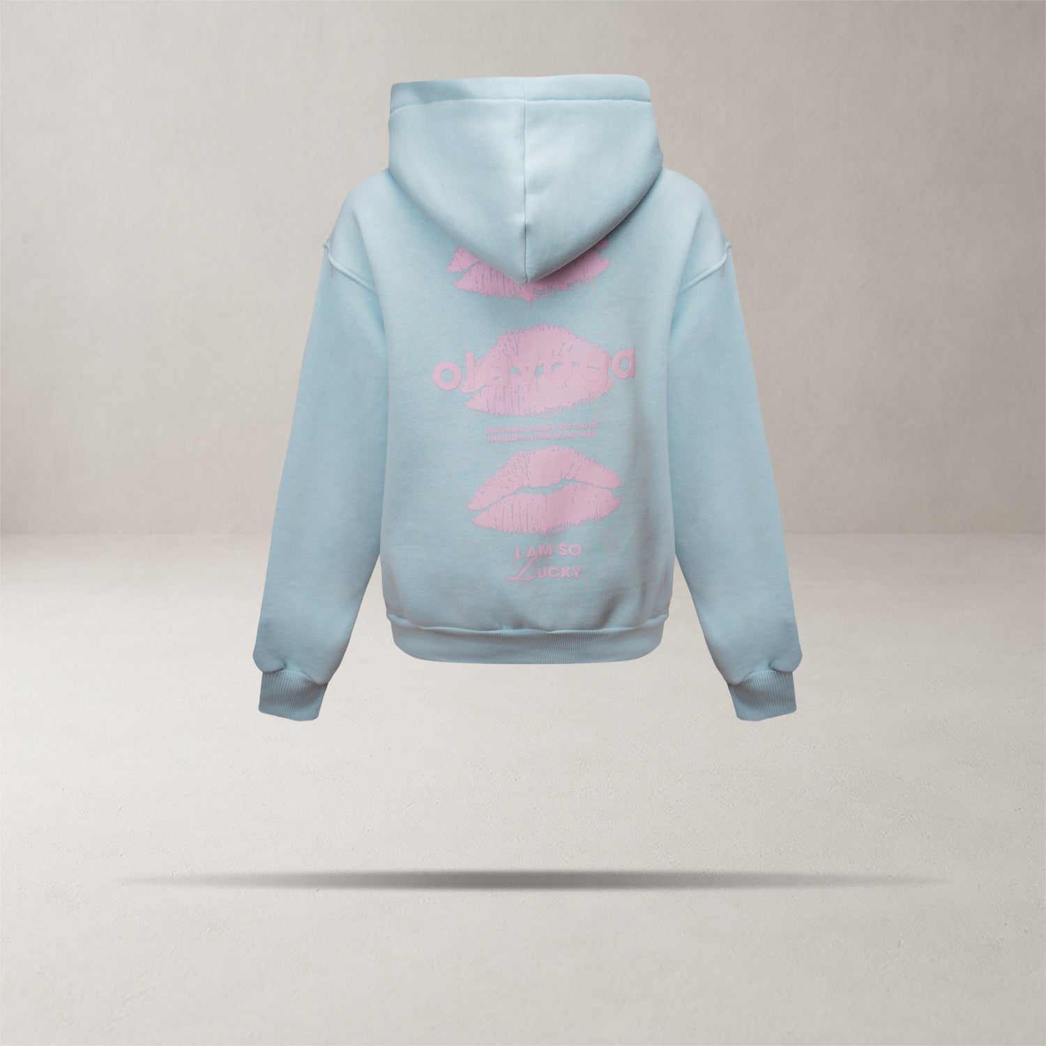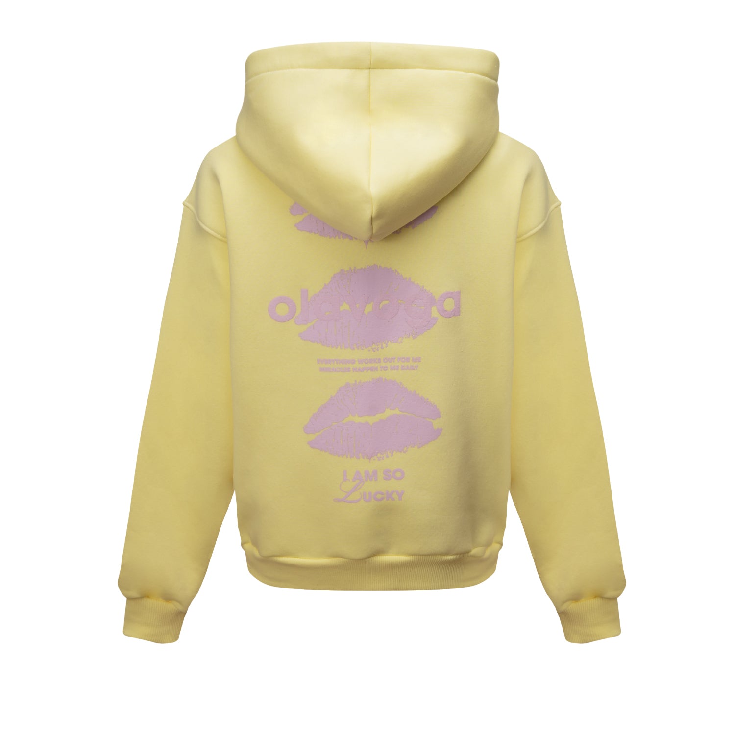 Key features: hood, comfortable fit, soft knit fabric, lips graphic on the back, slogan print, OLAVOGA branding, casual statement style.