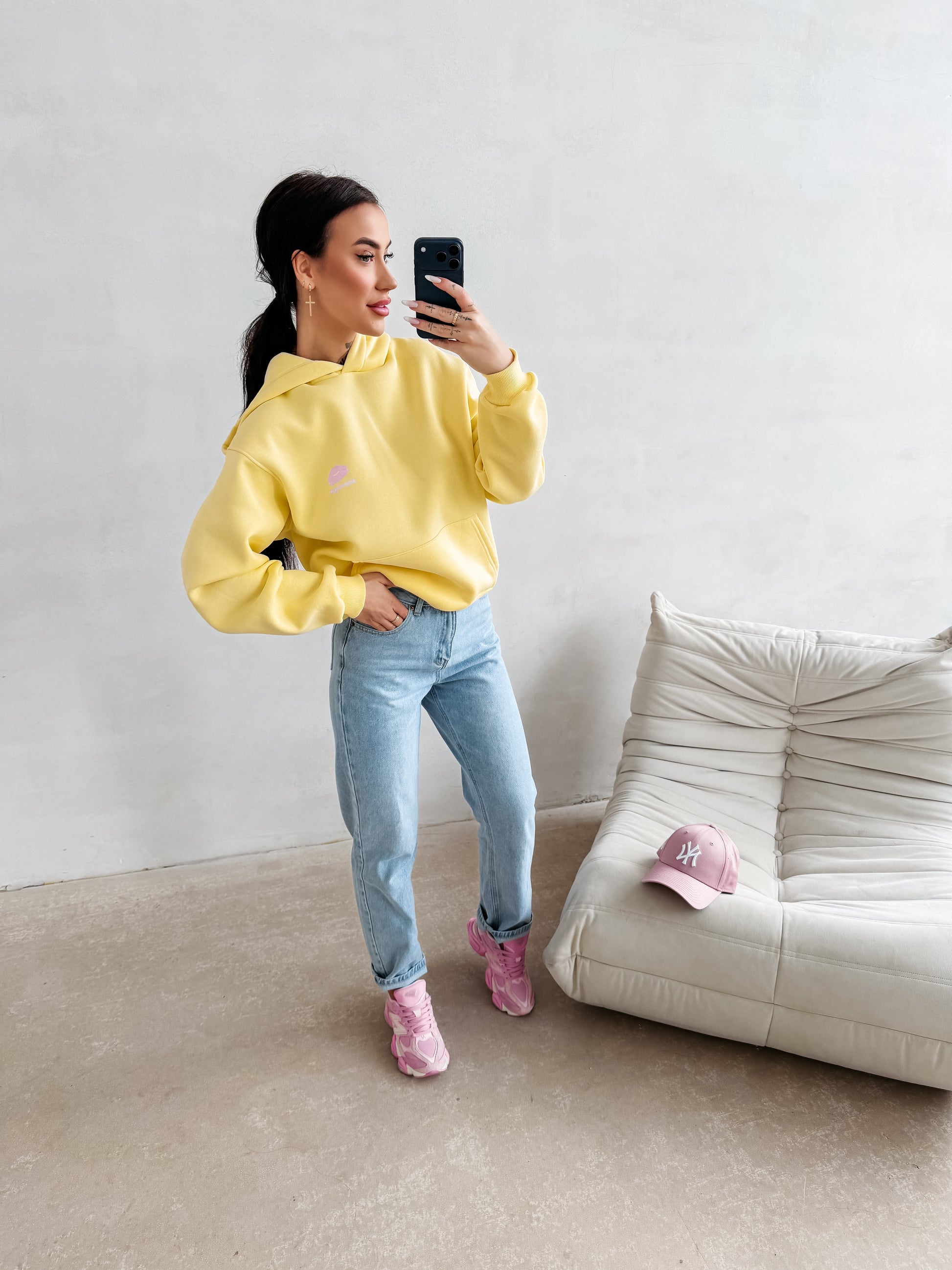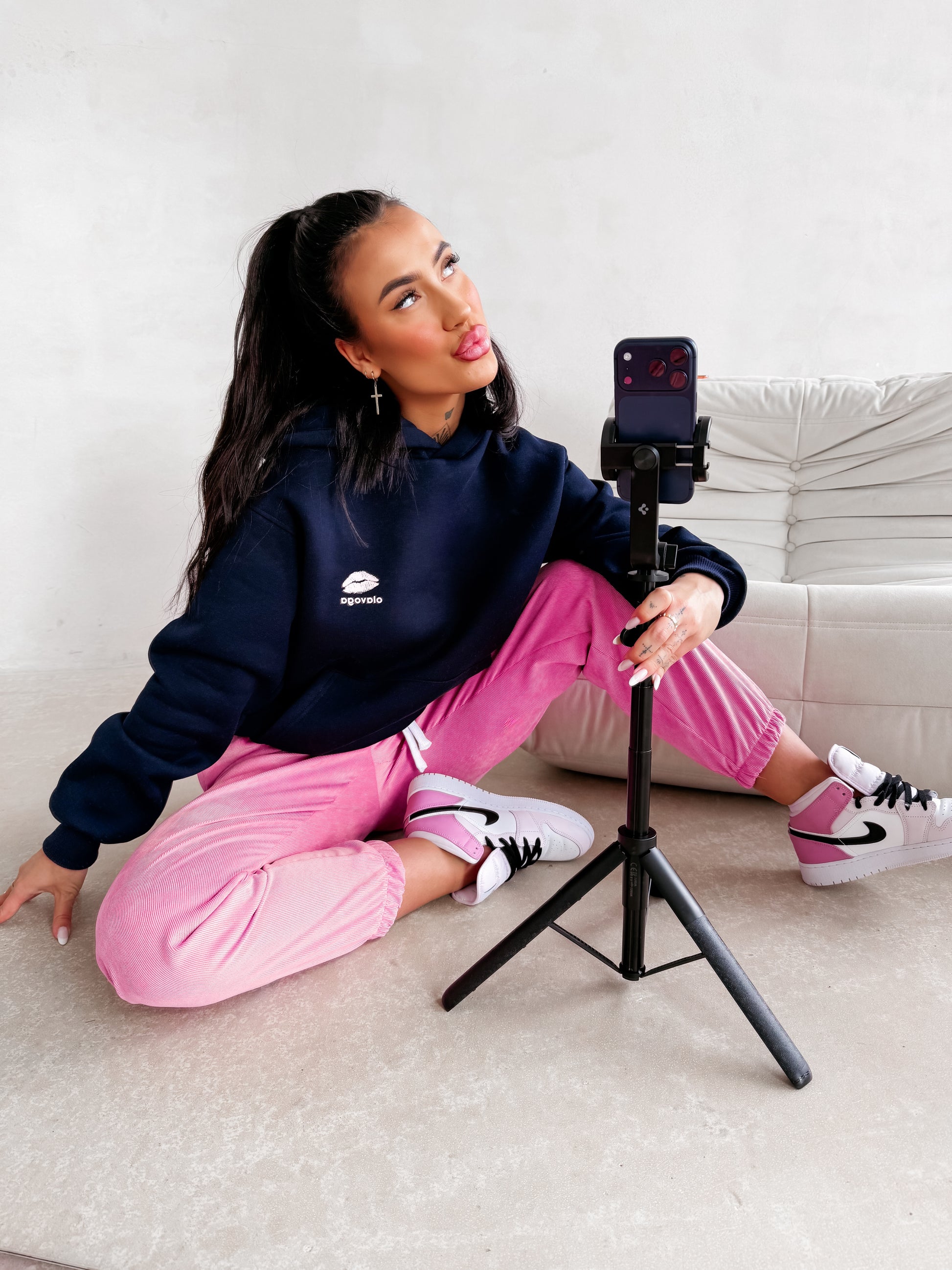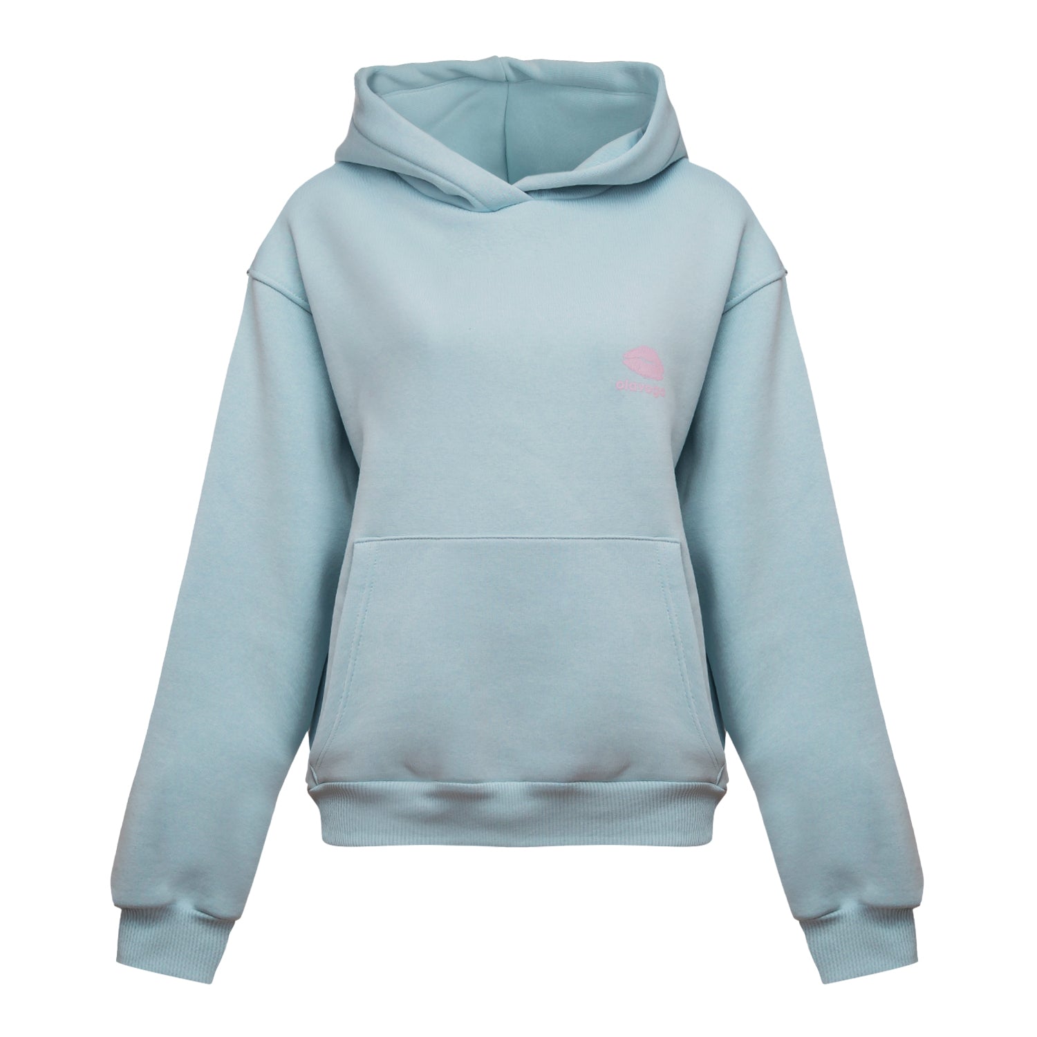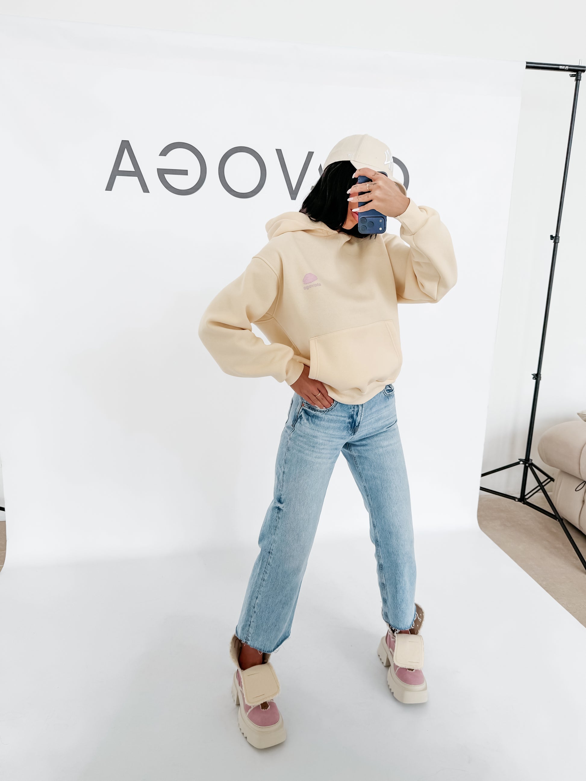 Key features: hood, comfortable fit, soft knit fabric, lips graphic on the back, slogan print, OLAVOGA branding, casual statement style.