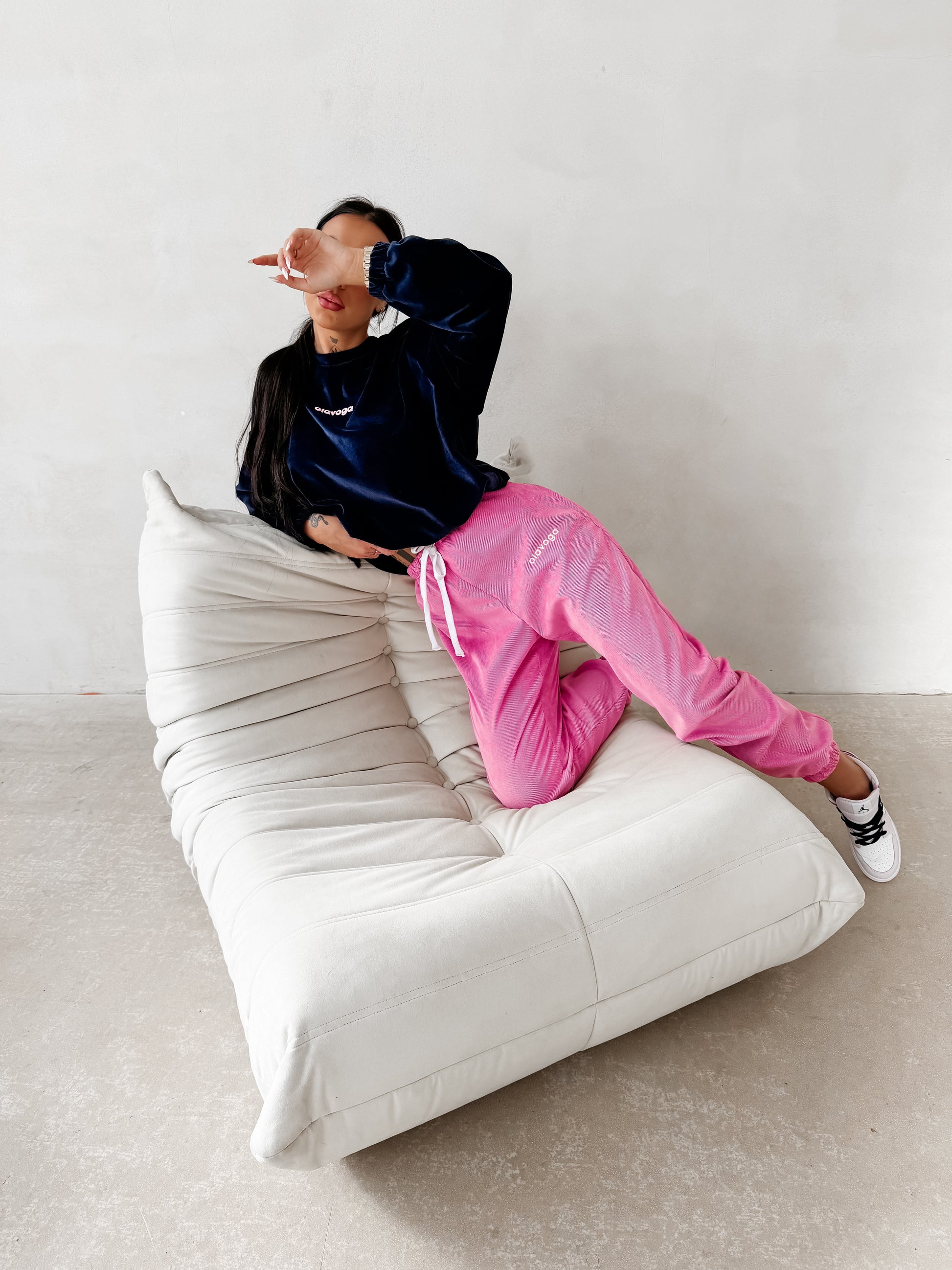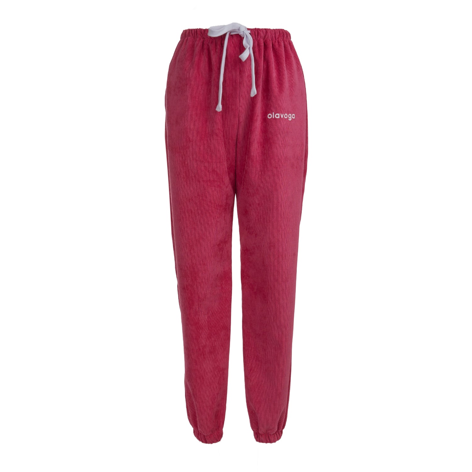 Key features: comfortable fit, elastic waistband with drawstring, soft velour-finish knit fabric, elastic cuffs at the ankles, OLAVOGA embroidery, casual sporty style.