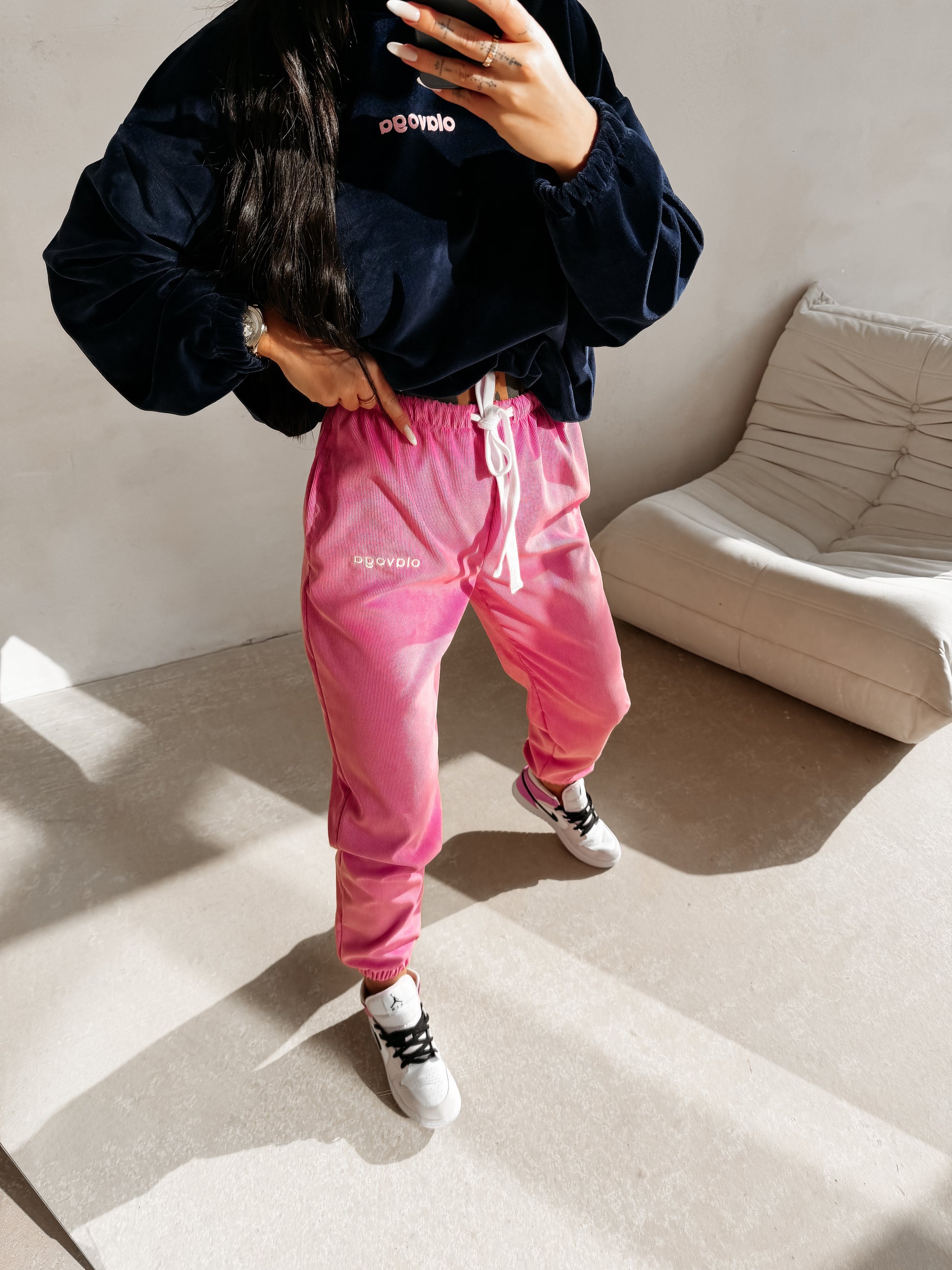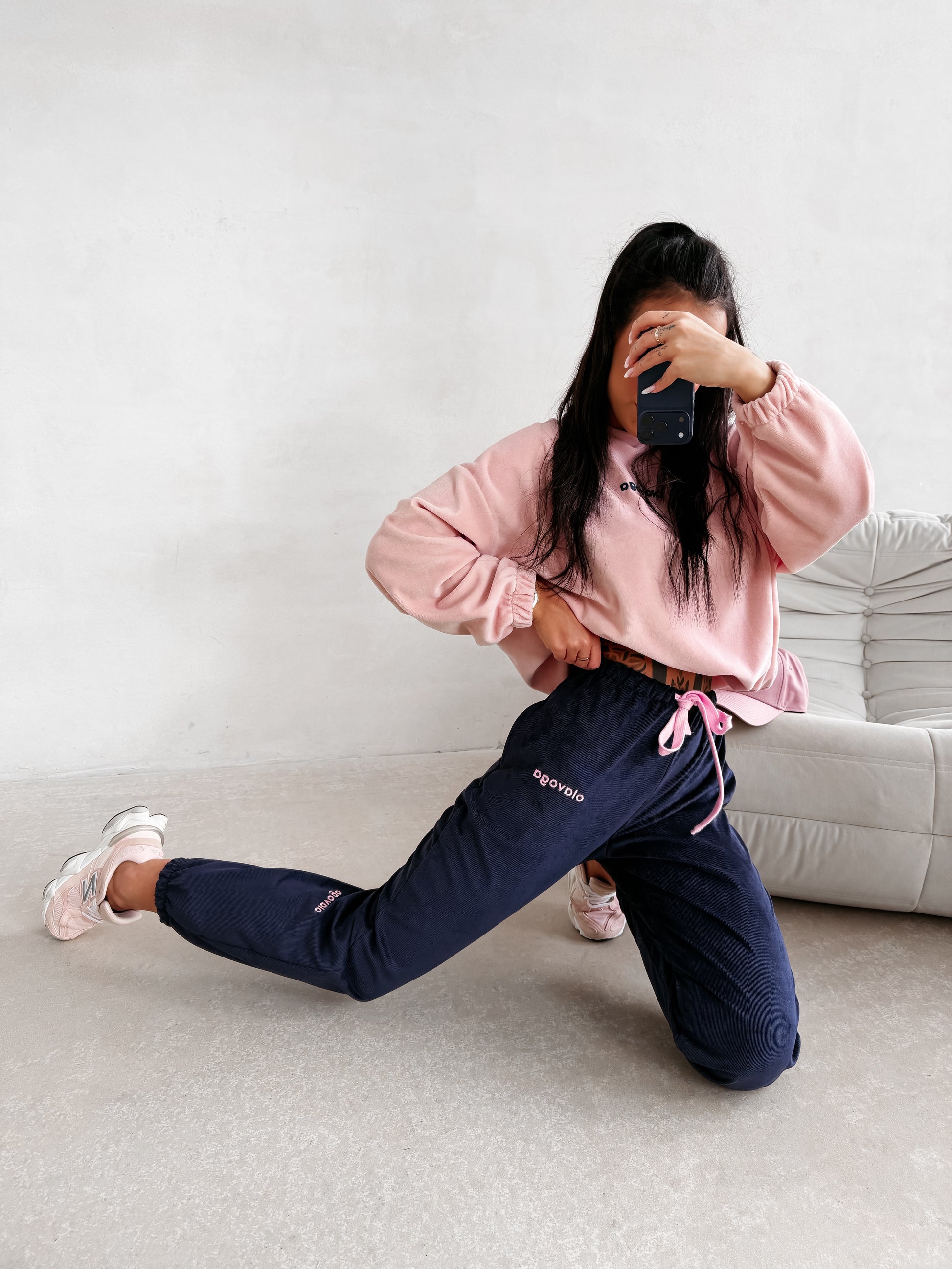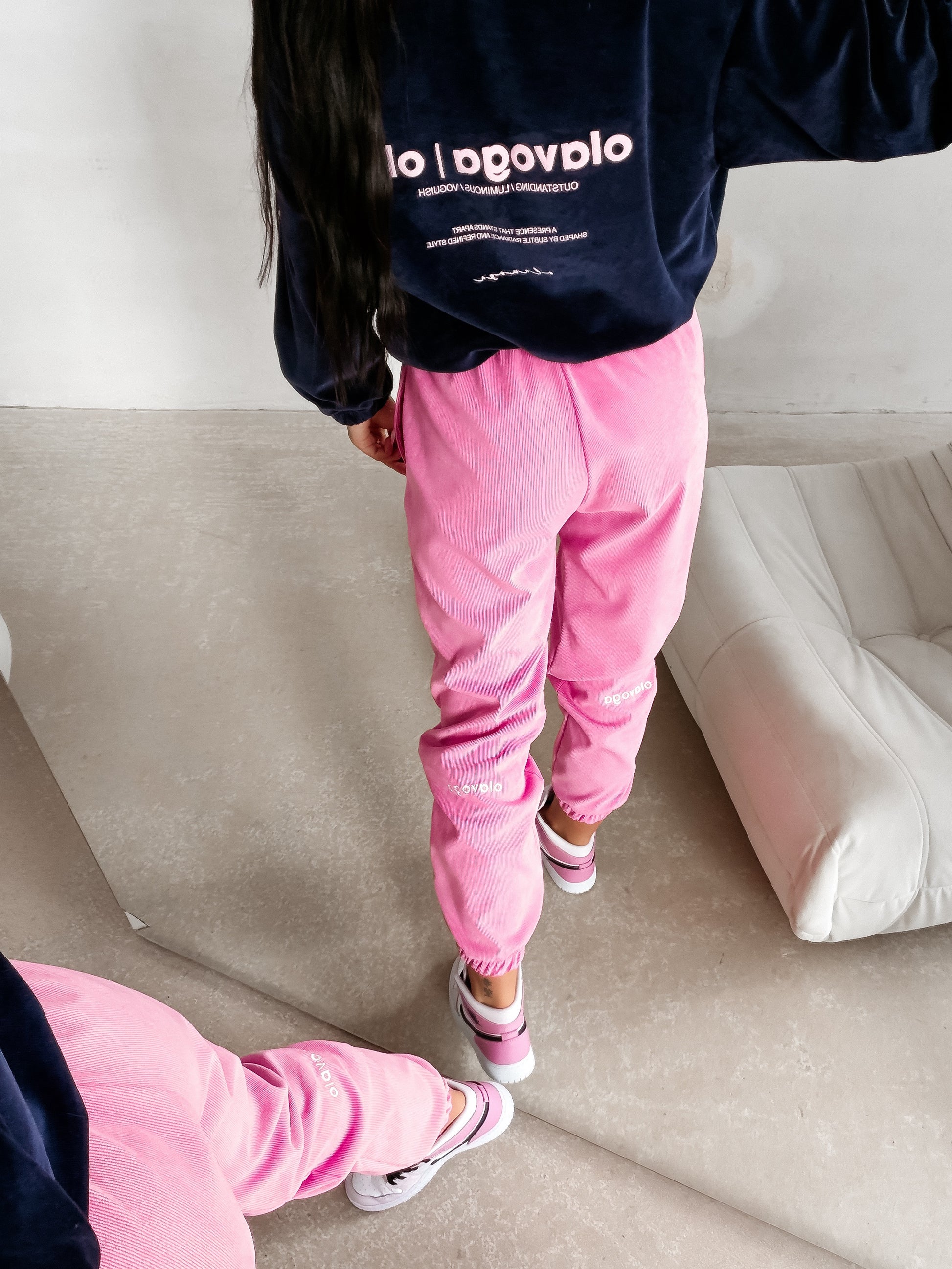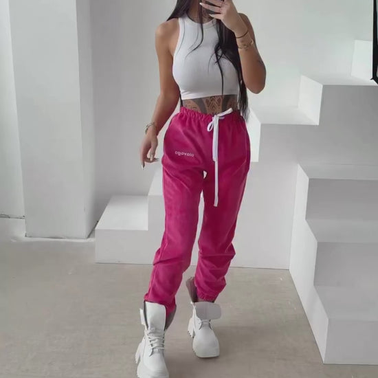 Sporty trousers with a comfortable fit, featuring an elastic waistband with adjustable drawstring fastening. Made from soft, pleasant-to-touch knit fabric with a subtle velour texture, ensuring comfort and a premium casual look. The legs are finished with elastic cuffs and decorated with a delicate OLAVOGA embroidered logo.