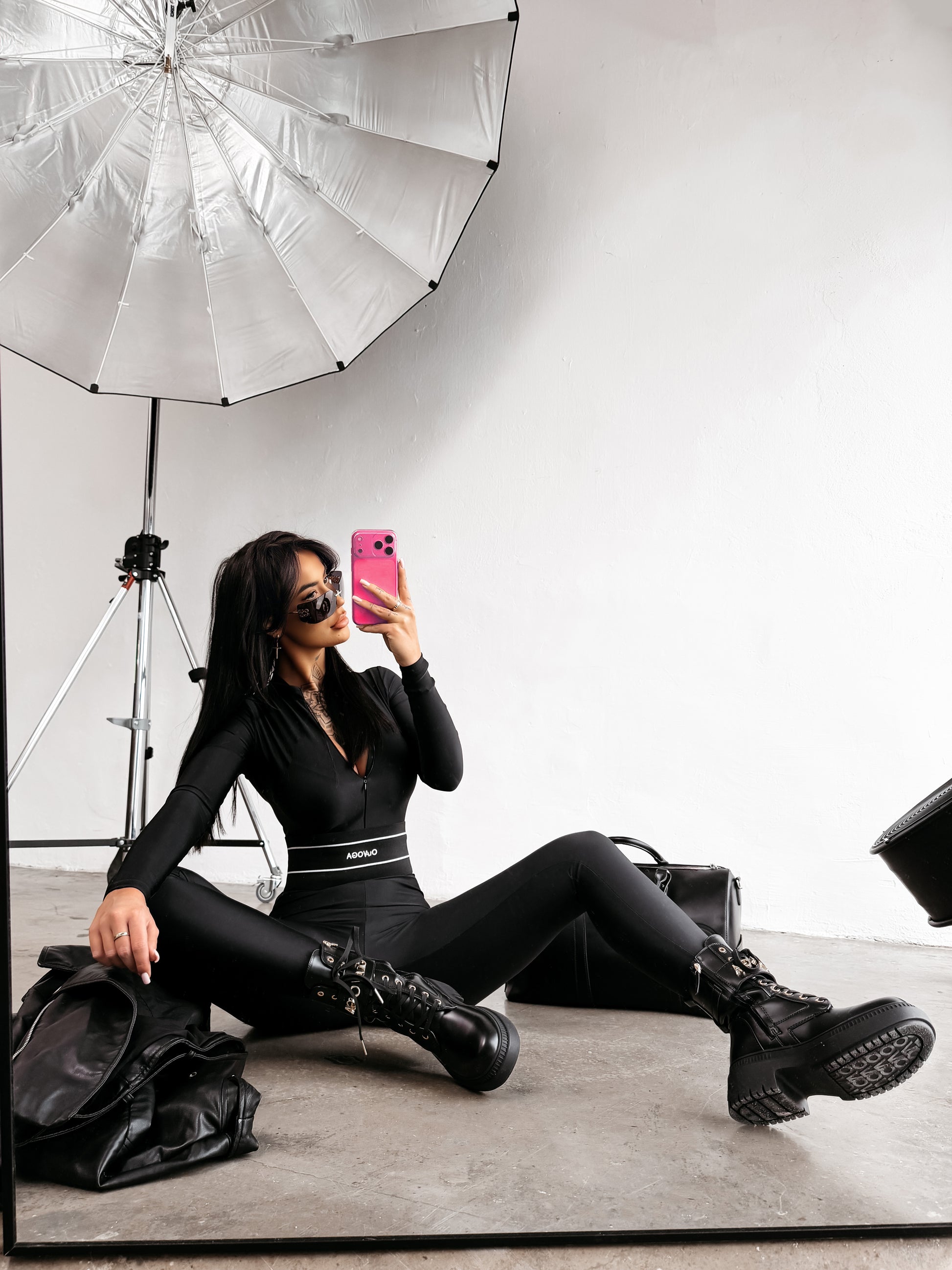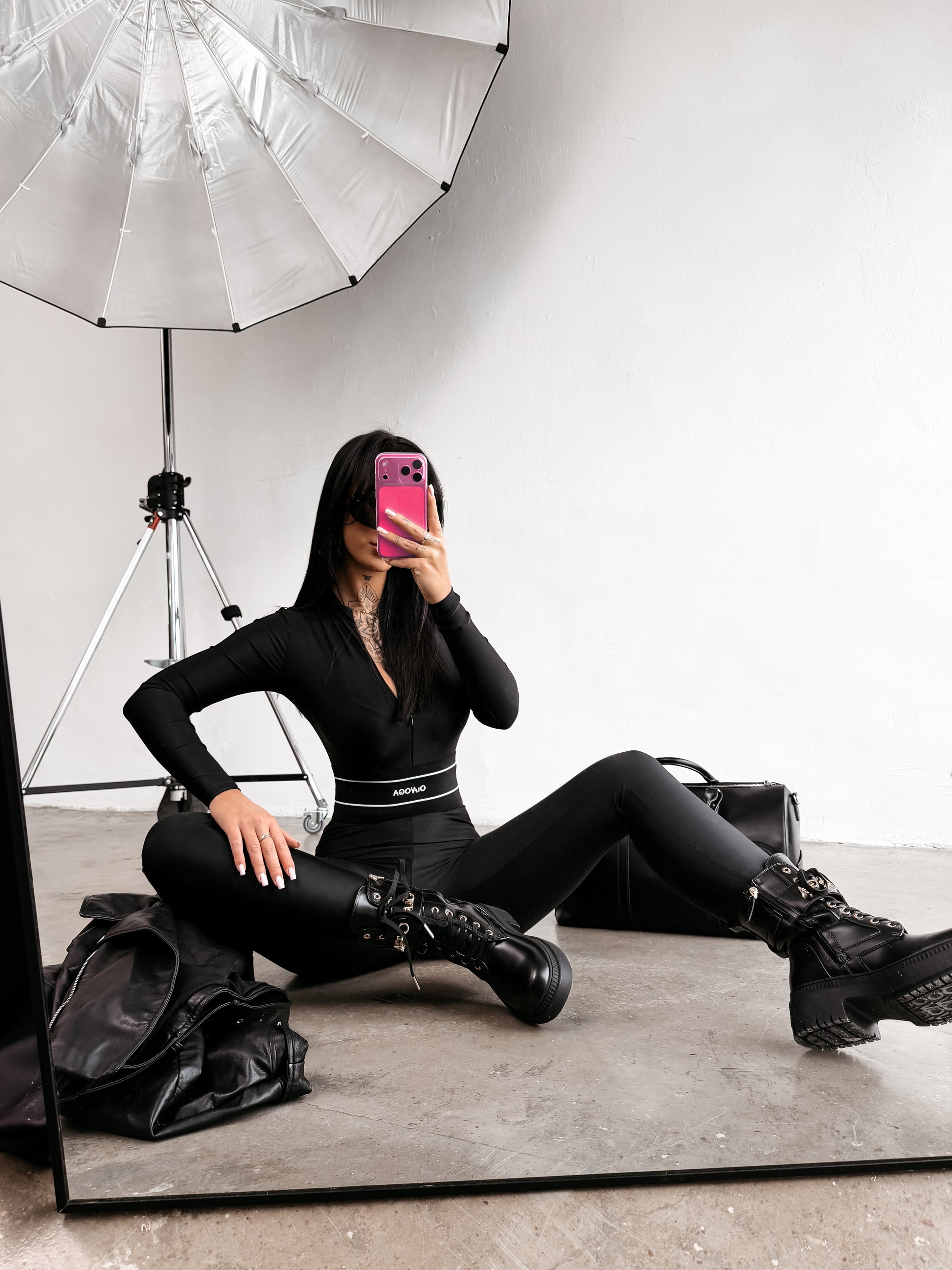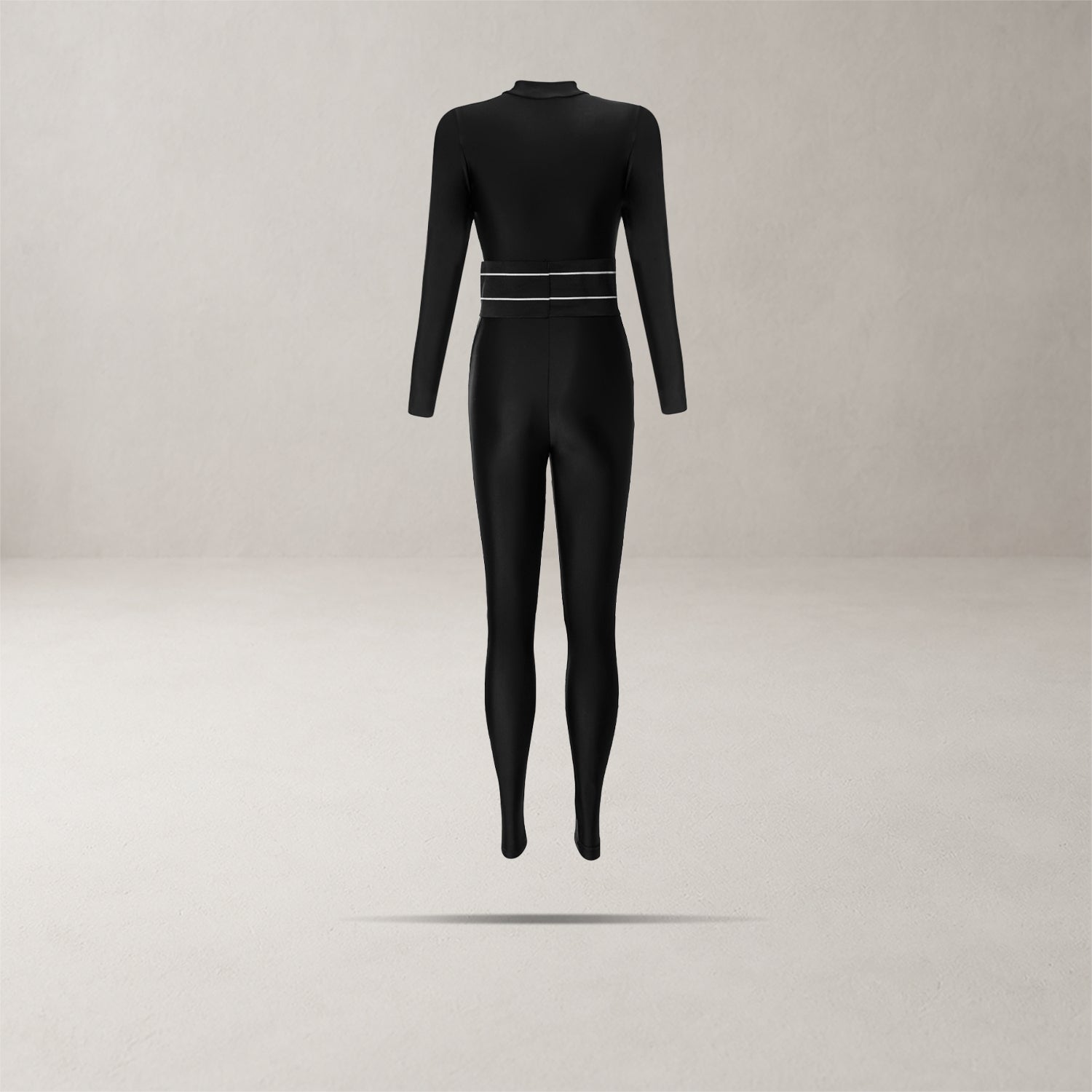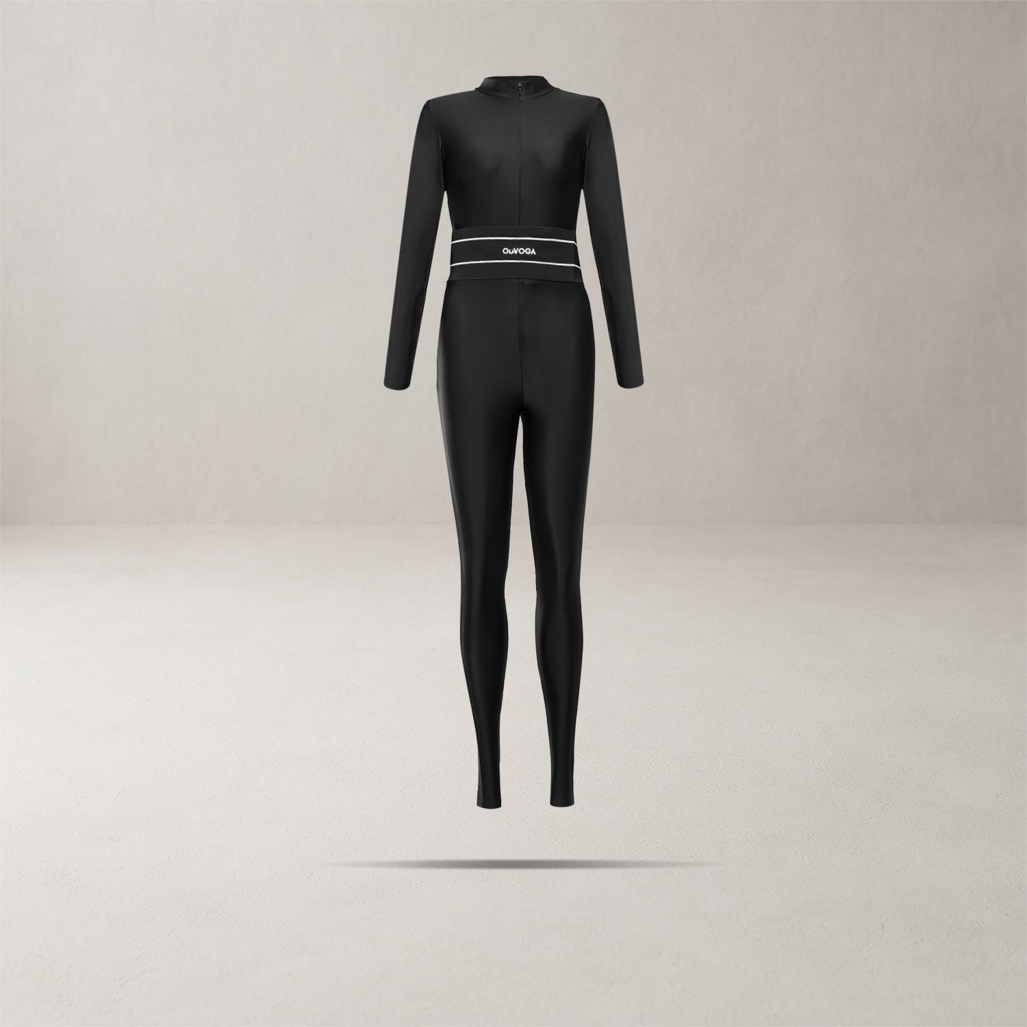 A fitted jumpsuit with a modern, figure-enhancing silhouette. Made from elastic, smooth knit fabric with a soft and comfortable finish. The model features long sleeves, a stand-up collar and an adjustable zip neckline. The waist is finished with an elasticated band featuring contrasting lines and a subtle OLAVOGA embroidery.