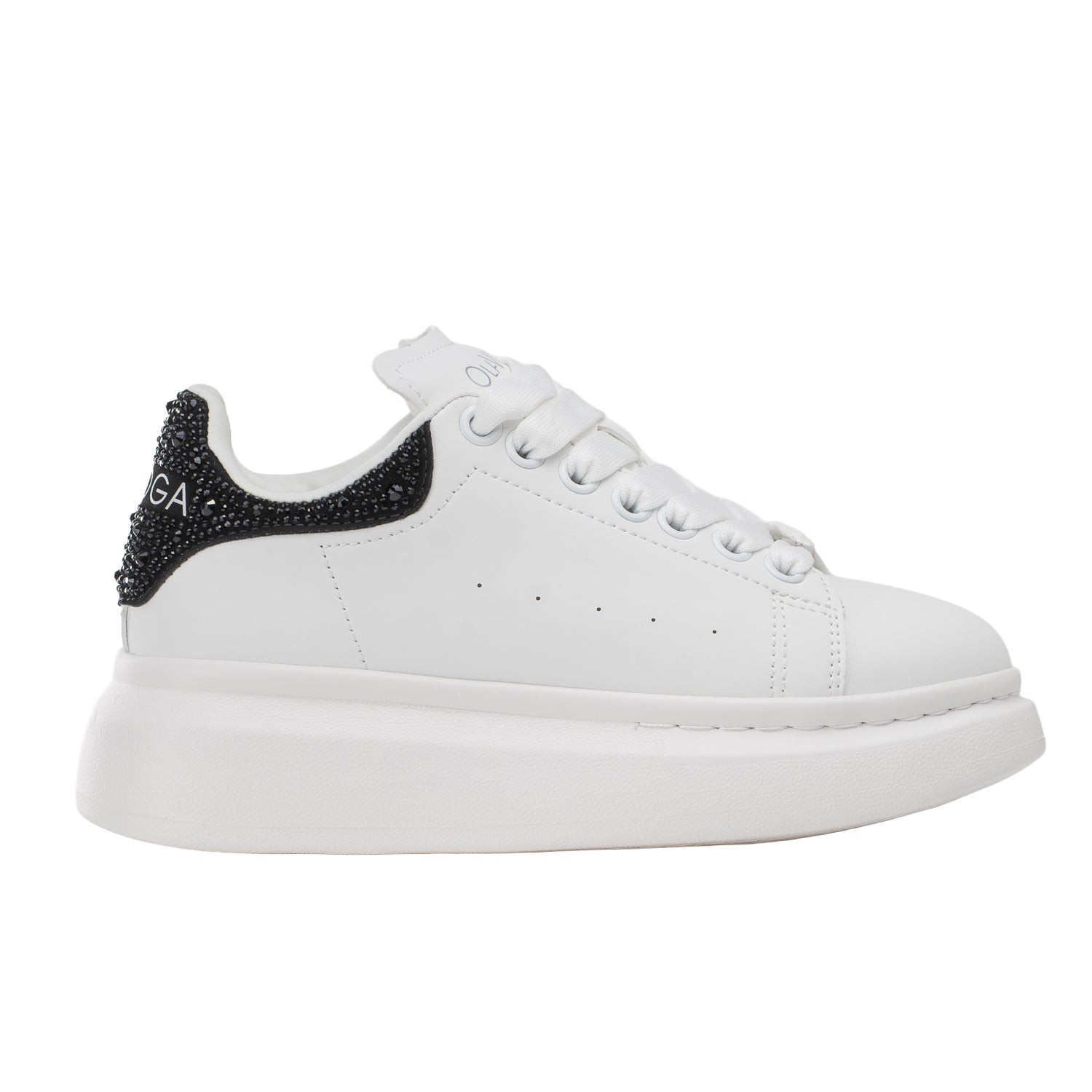 Sneakers with a modern, minimalist design set on a chunky platform sole. Made from smooth material with an elegant finish. The model features classic lace fastening and a decorative heel detail embellished with sparkling elements and OLAVOGA branding.