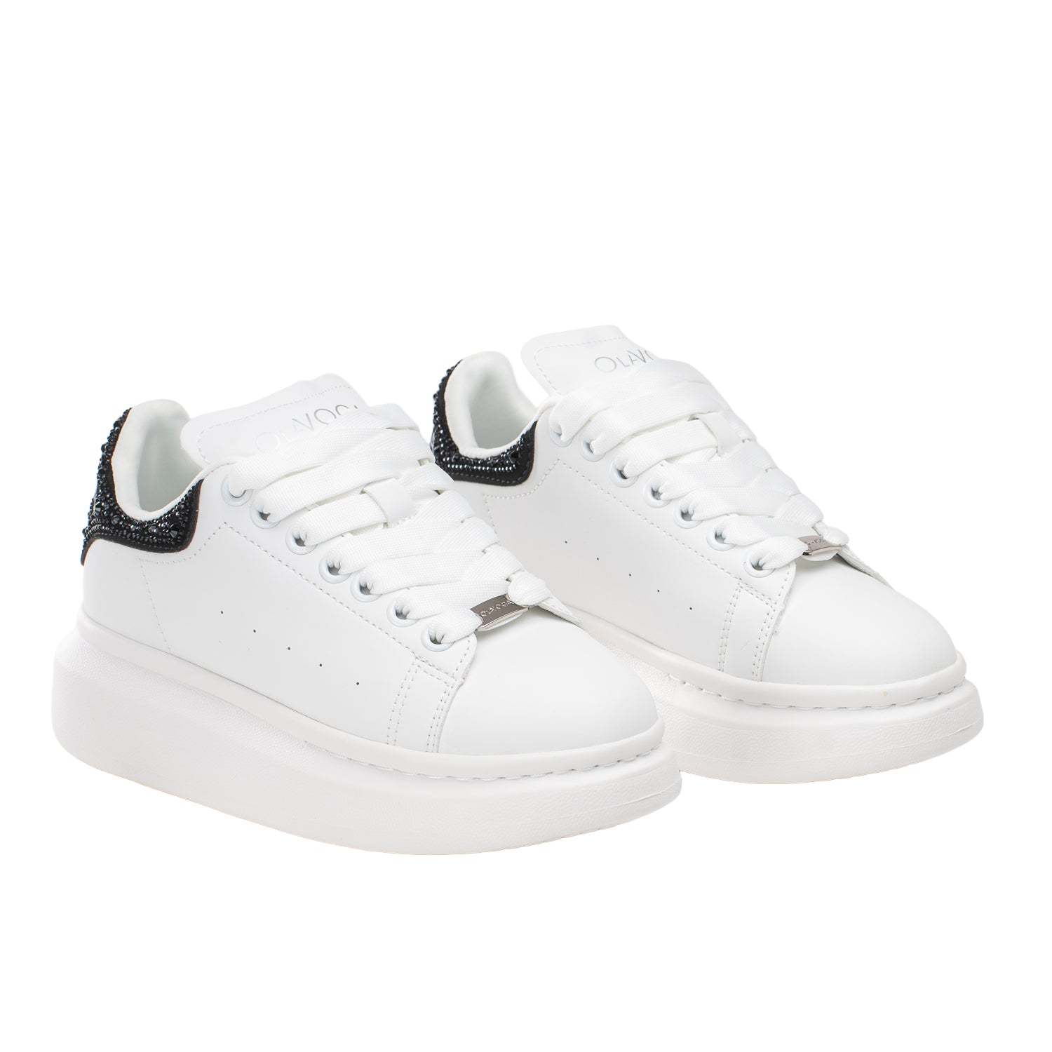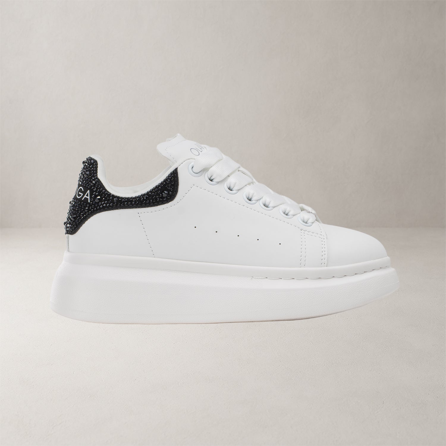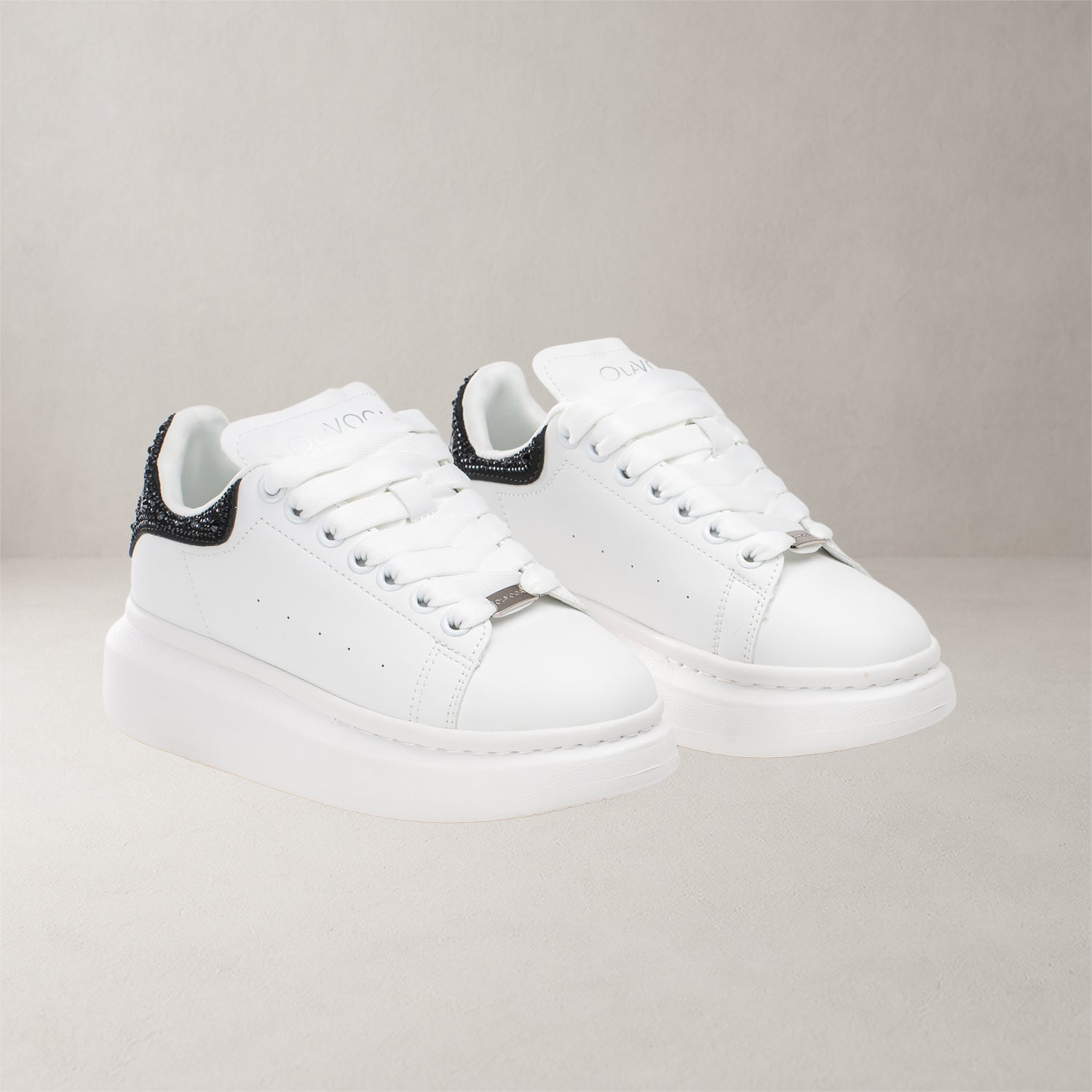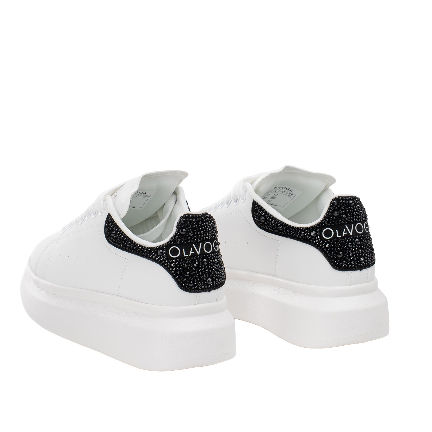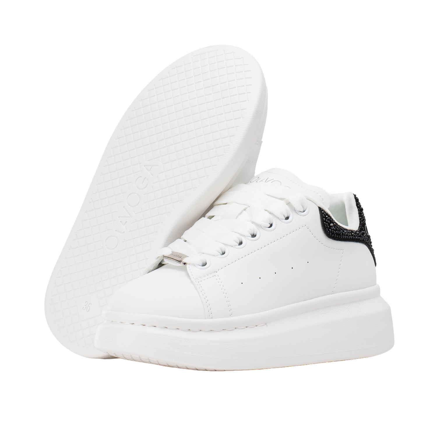 Key features: platform sole, minimalist silhouette, classic lace fastening, comfortable construction, decorative heel with crystals, OLAVOGA branding, modern style.