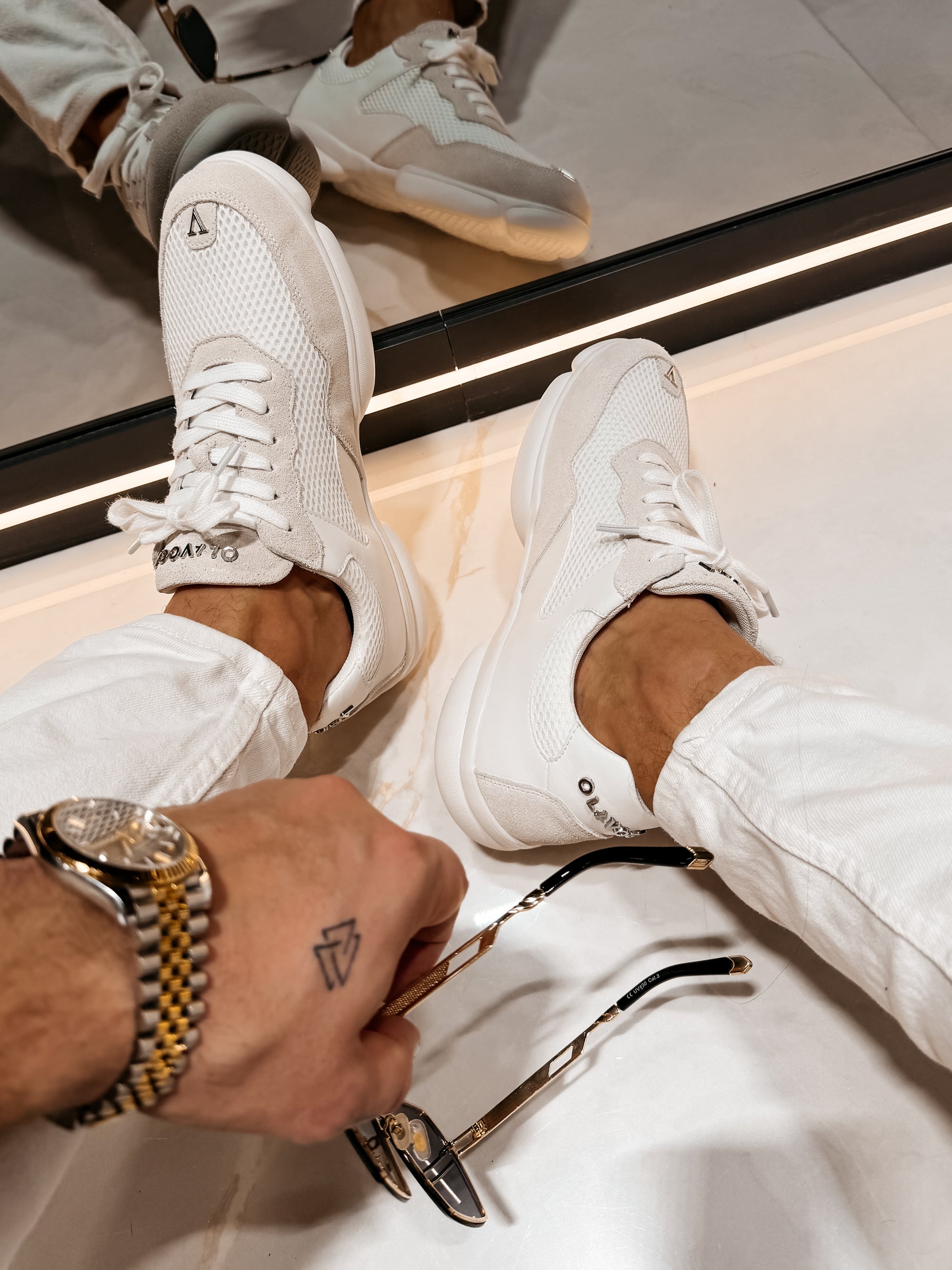 Sneakers with a modern, sporty-luxury character. Made from breathable mesh combined with soft inserts featuring a suede finish. The model features classic lace fastening and subtle OLAVOGA branding, set on a flexible, cushioning sole.