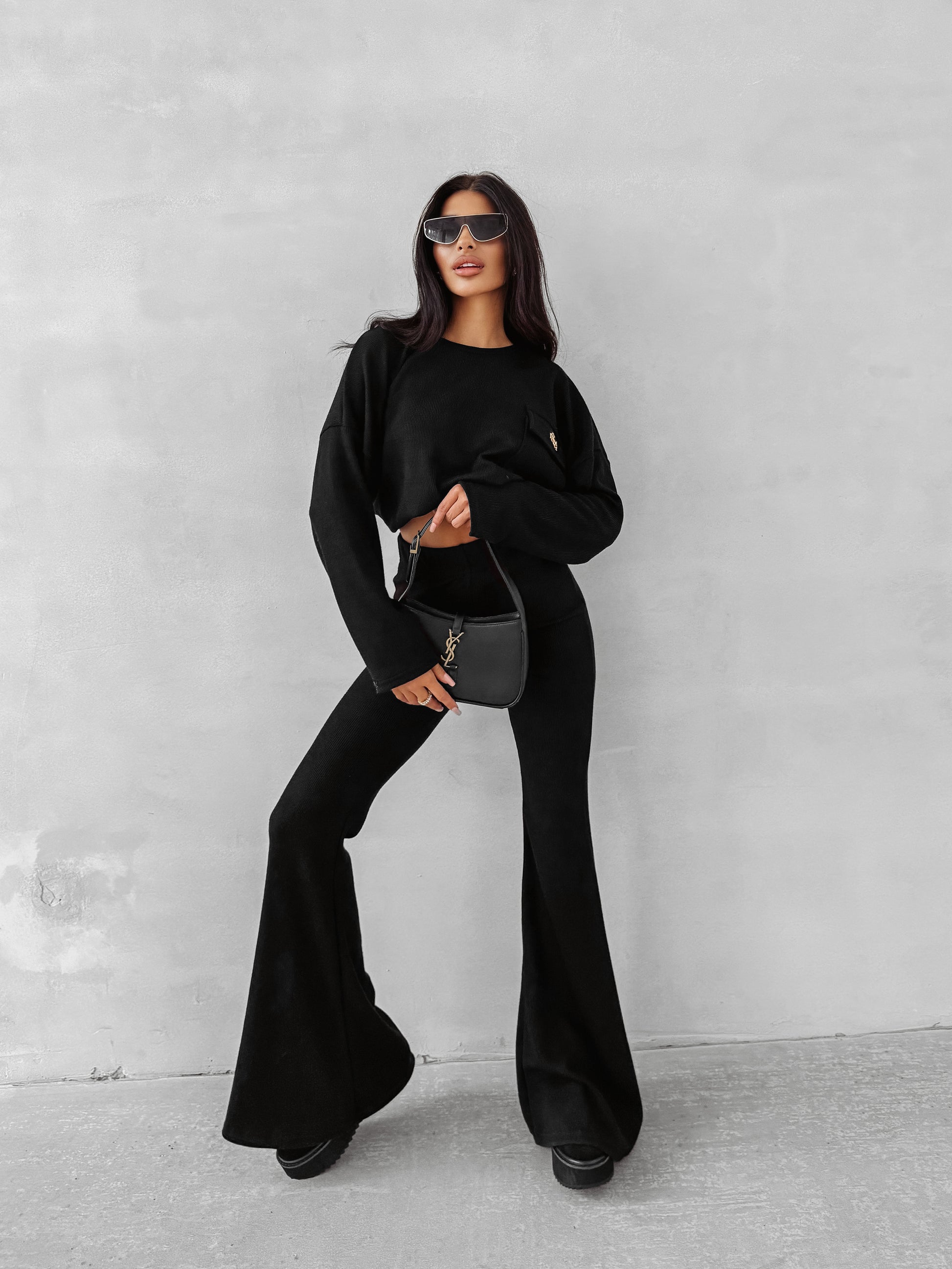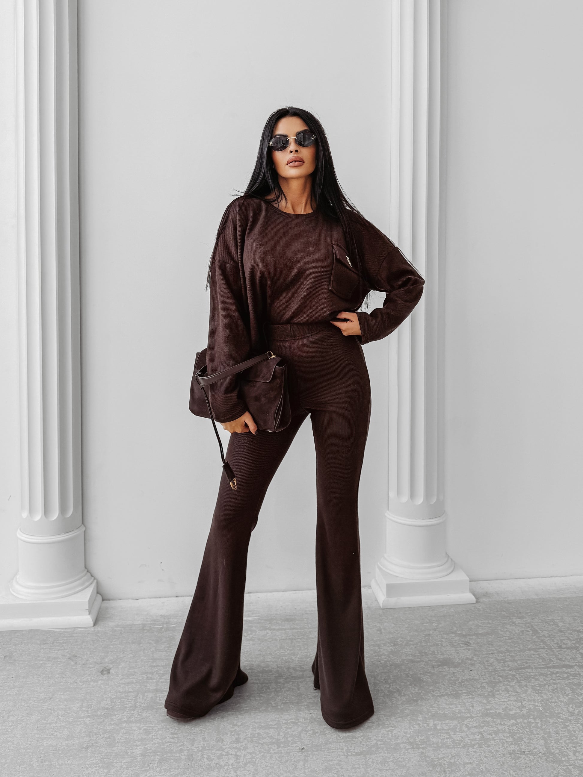 Bottoms: High-waisted trousers with flared legs that elongate the figure. Designed to combine comfort and sophistication in one timeless piece.