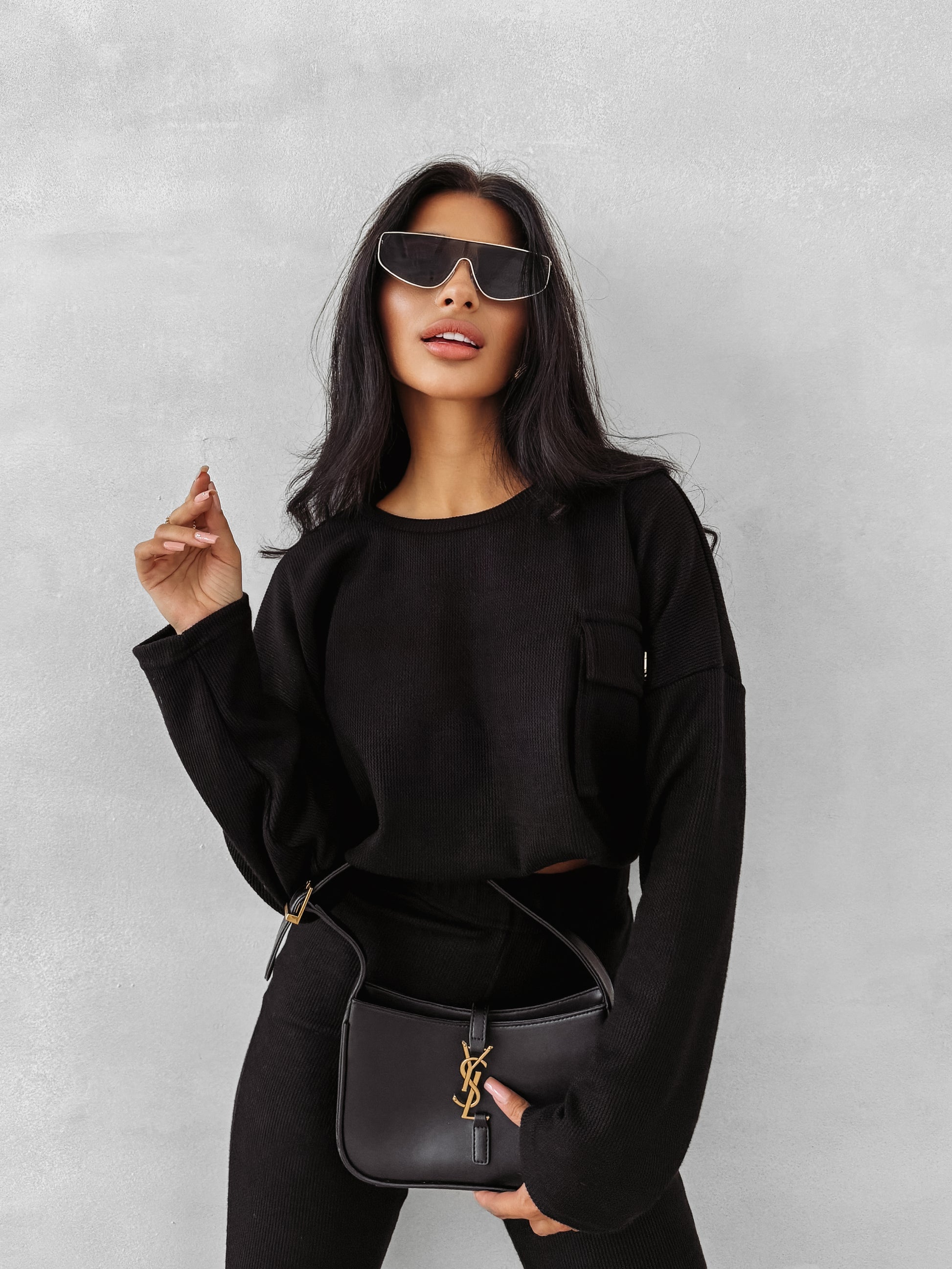 Top: Slightly oversized sweatshirt with dropped shoulders and a relaxed silhouette. Front pocket adorned with a gold metal OLAVOGA plaque for a luxurious touch.