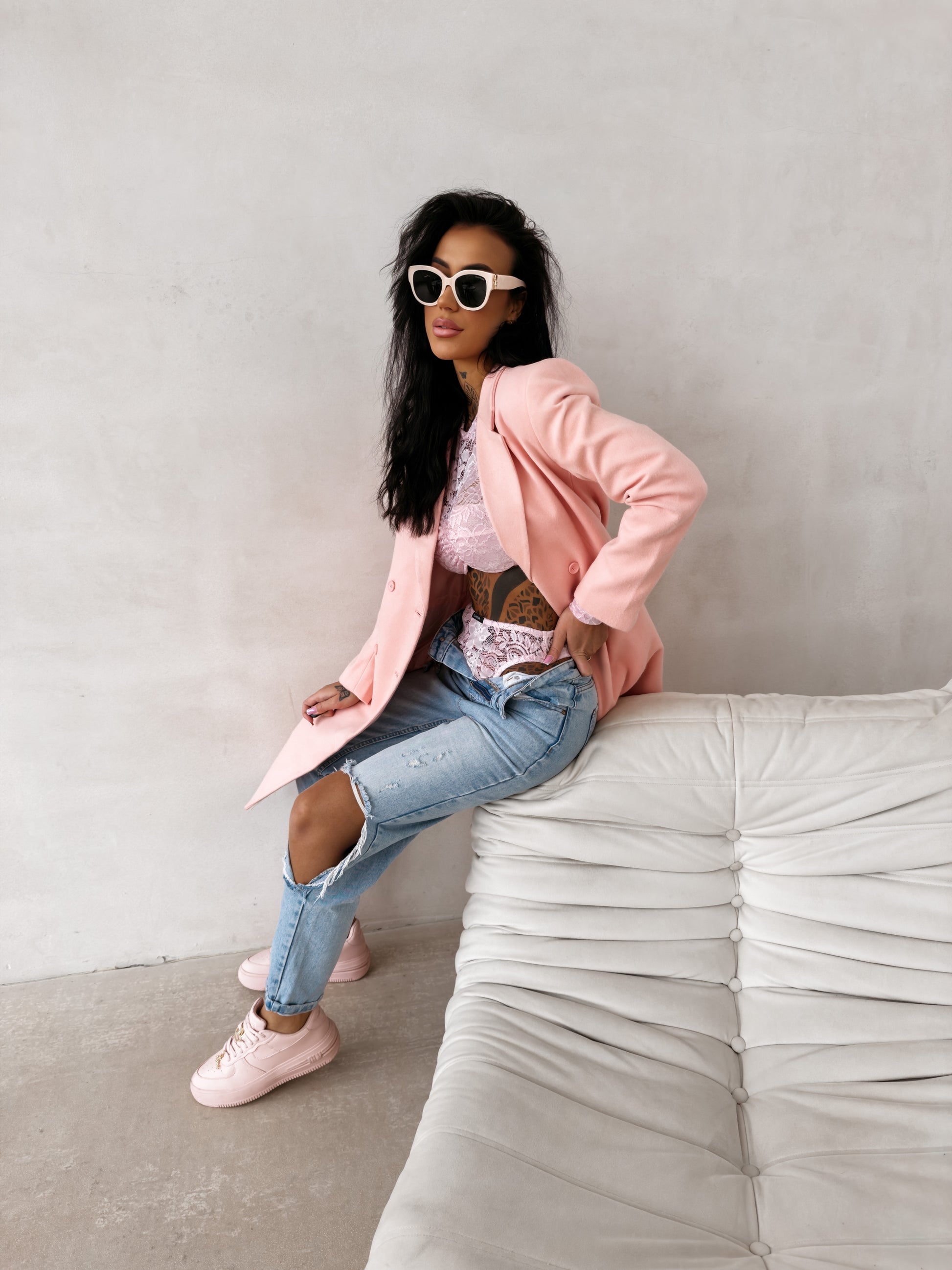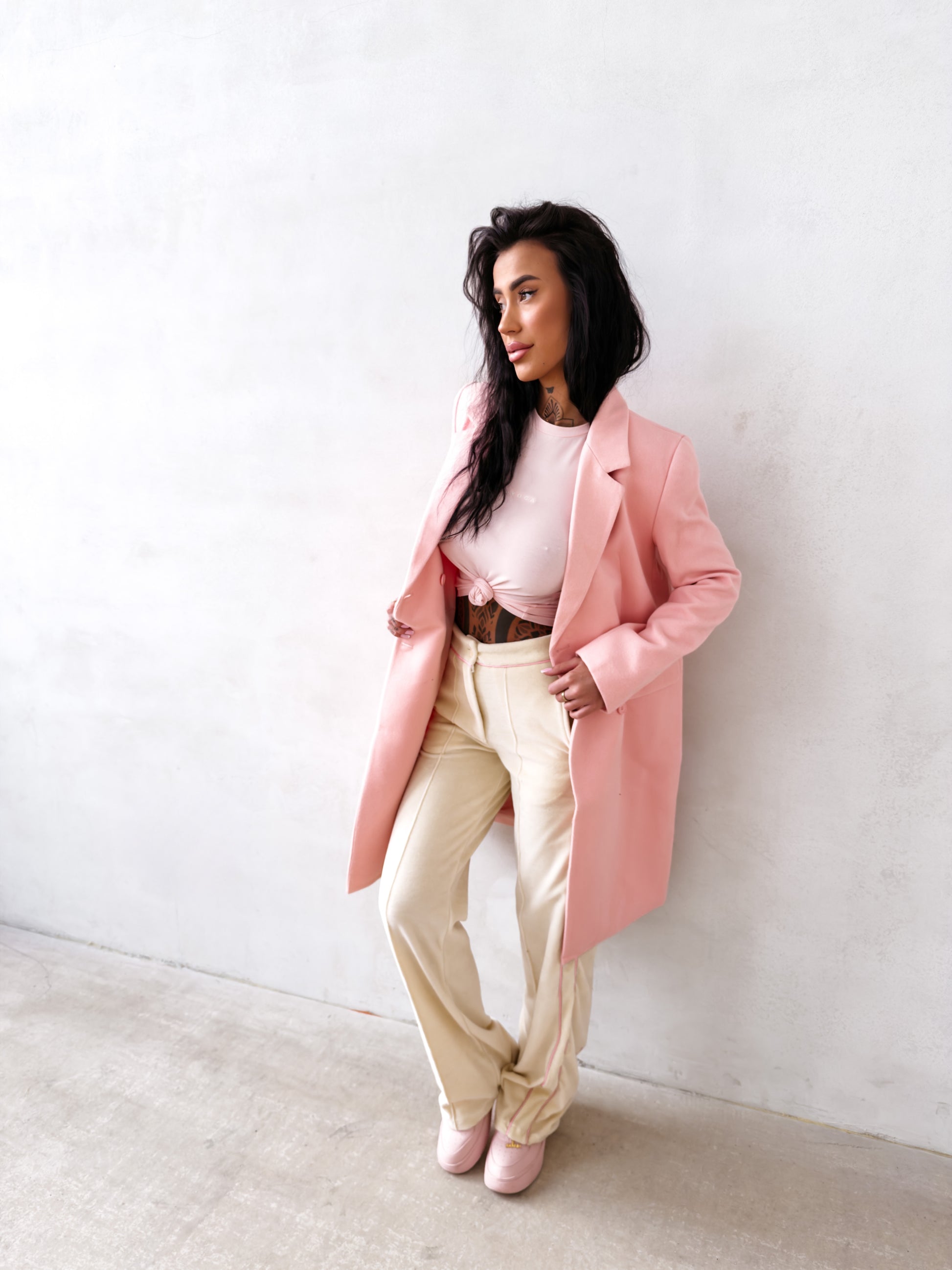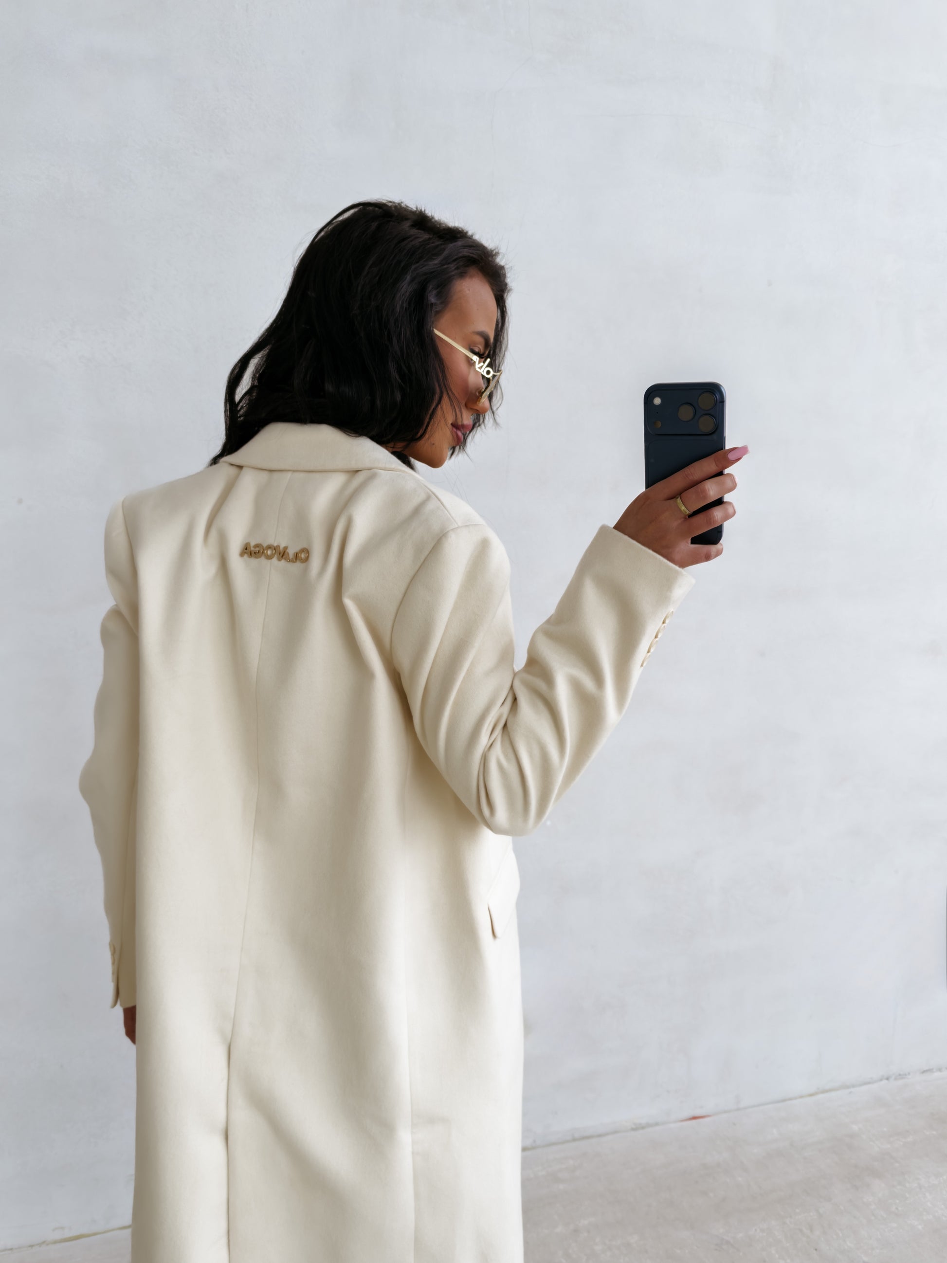 A women’s coat with a classic, straight cut. Crafted from high-quality, soft fabric with a smooth structure. The model is button-fastened and features an elegant collar and long sleeves. The back is finished with a subtle gold OLAVOGA logo. Practical side pockets complete the design.