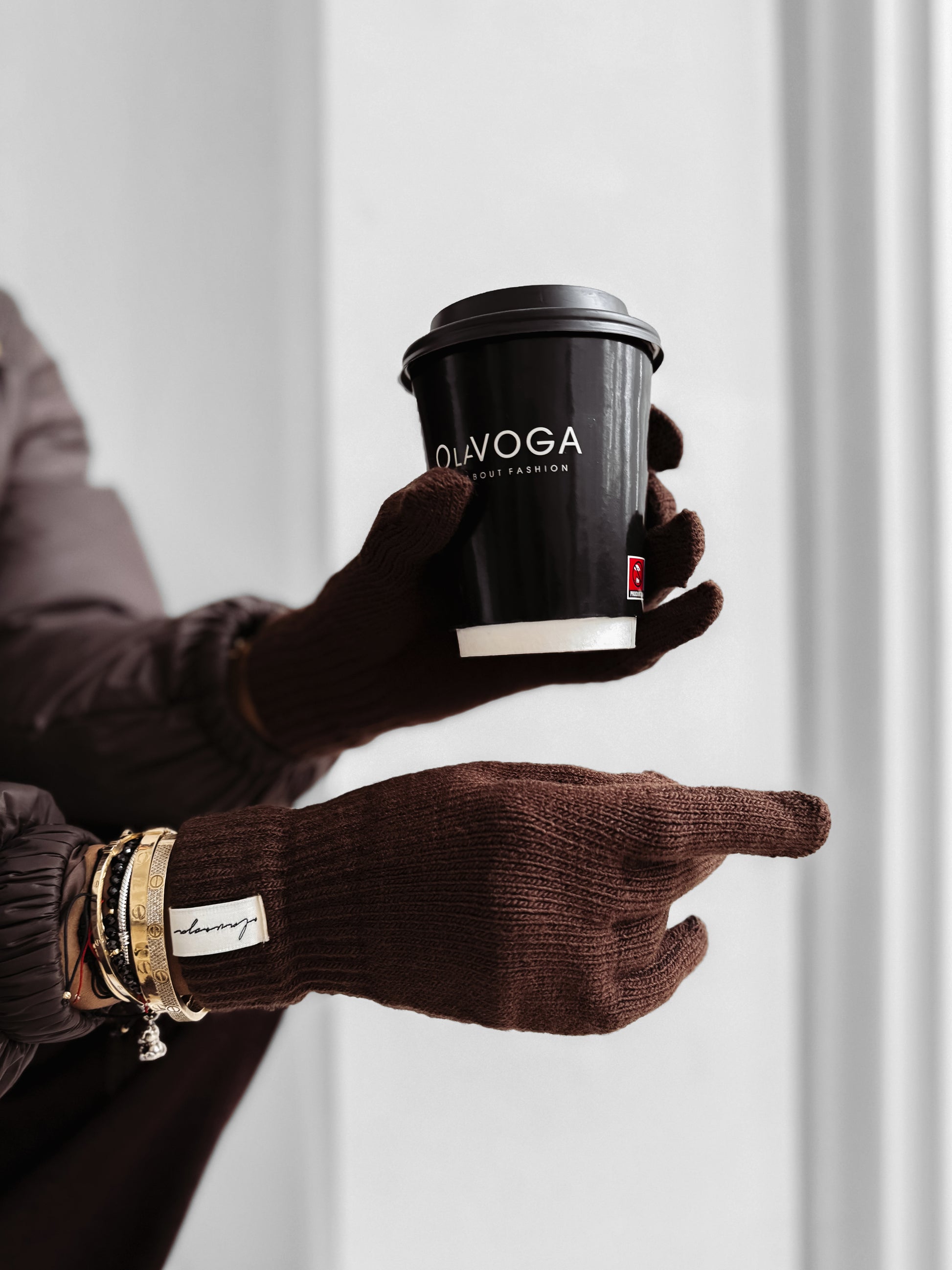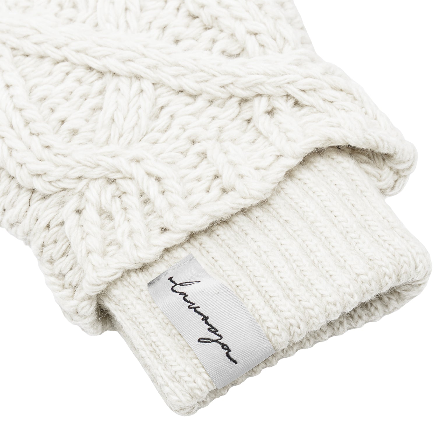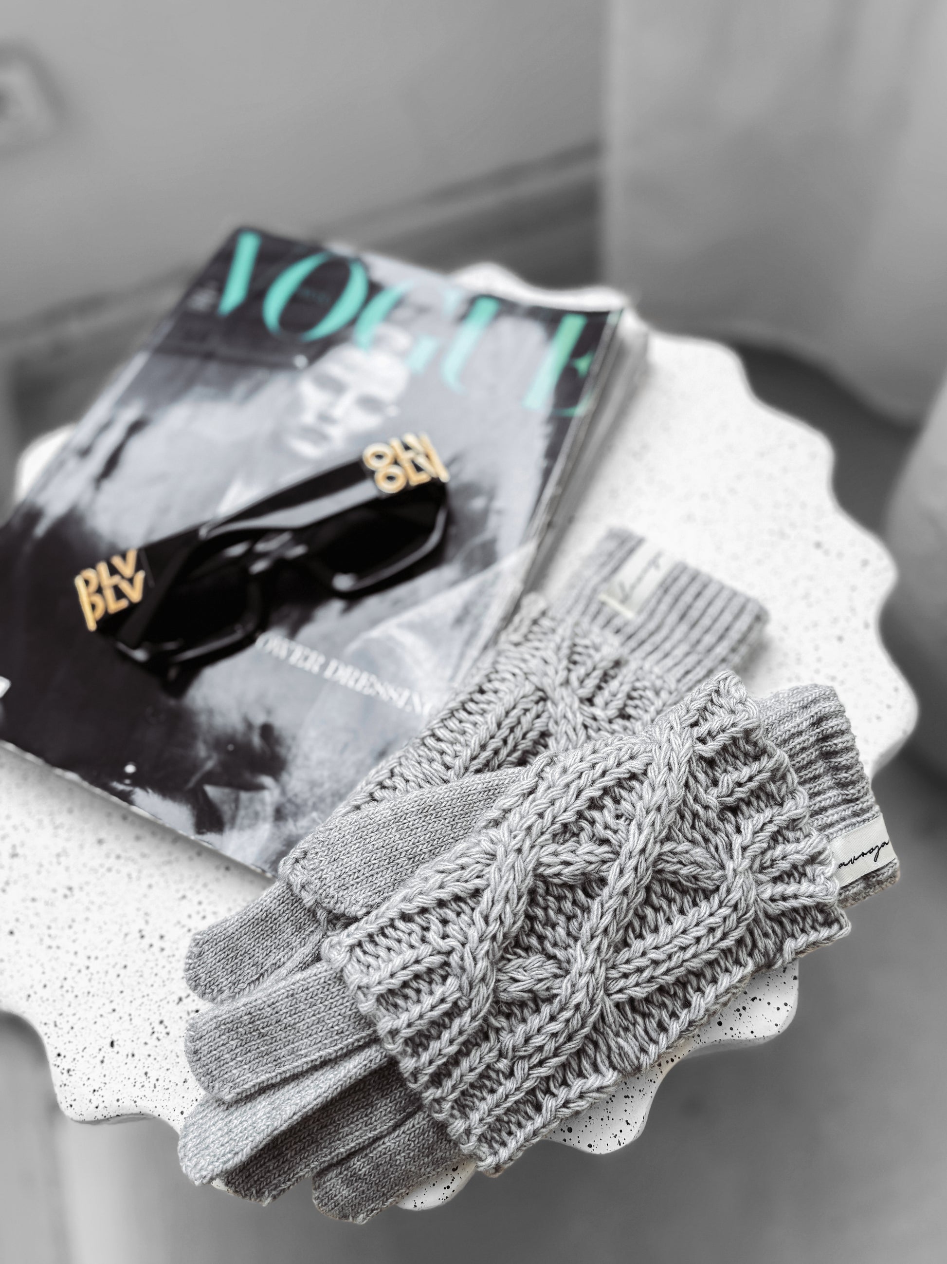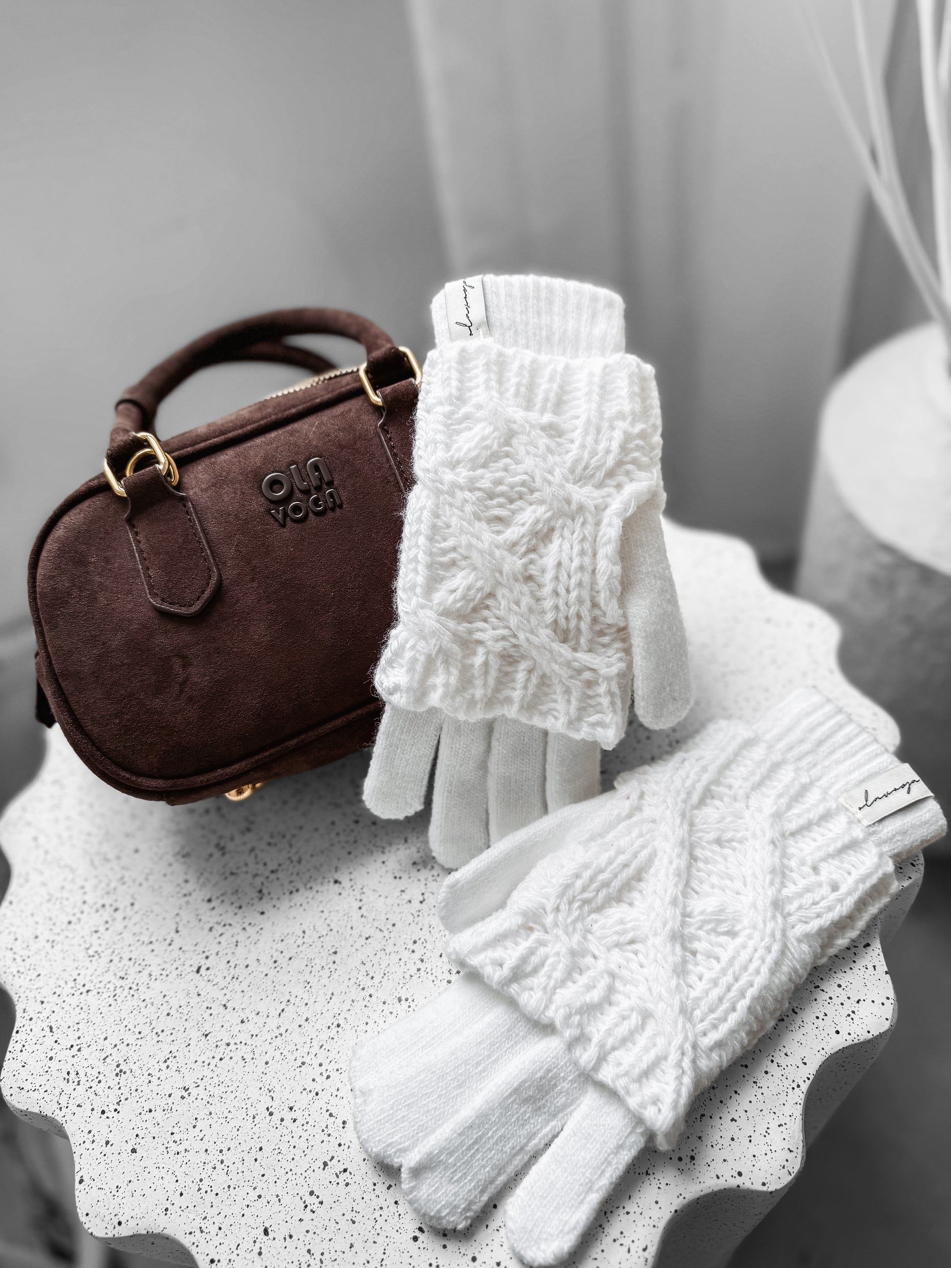 Knitted gloves made from soft, stretchy yarn with a decorative weave. Two-piece design – the outer, looser layer can be removed to reveal fitted full-finger gloves underneath. Finished with a subtle OLAVOGA logo patch for a refined touch.