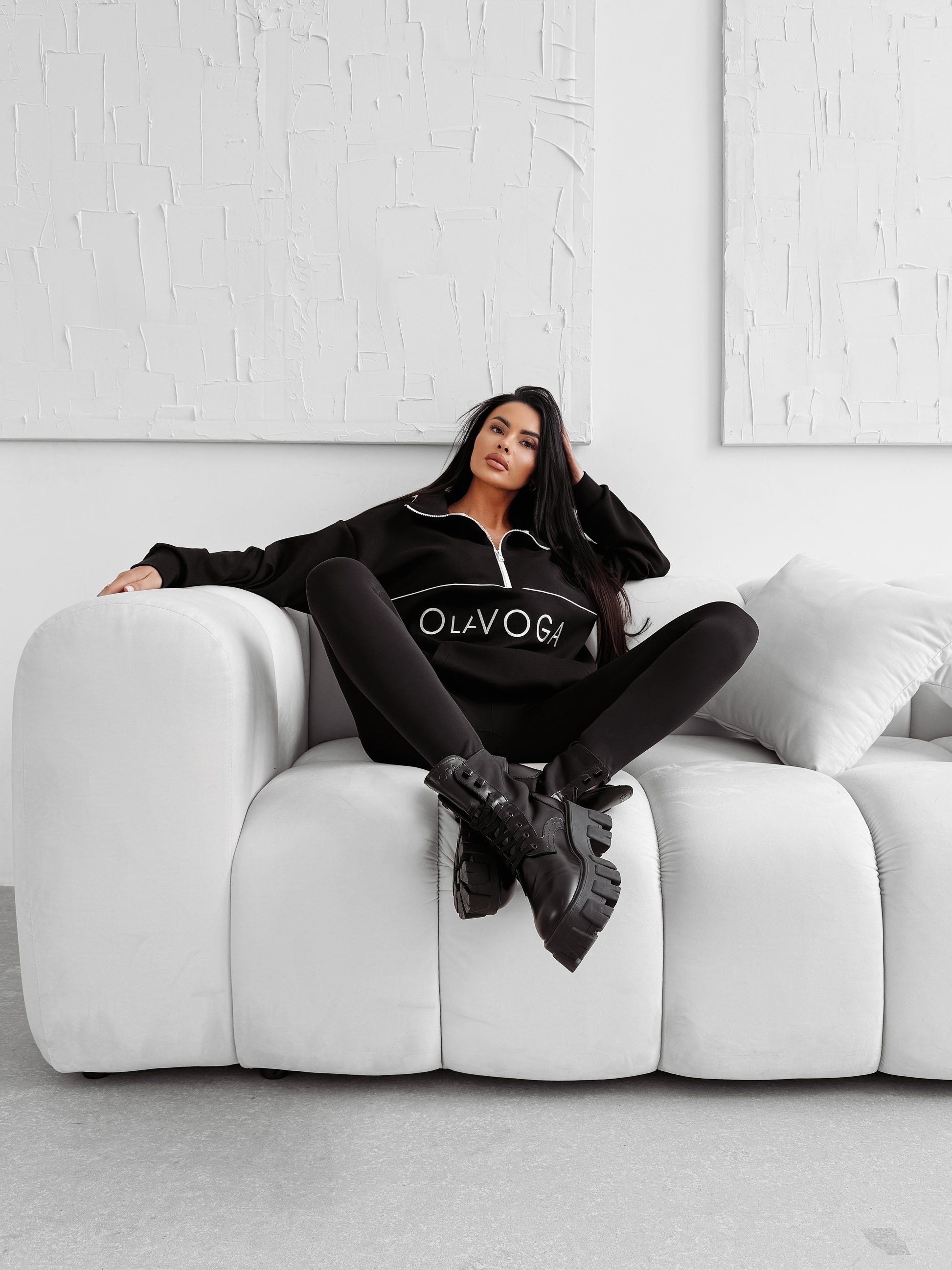 Oversized longline hoodie crafted from soft, comfortable fabric. Features a dropped shoulder design, contrasting trims, and a zip-adjustable collar. The front includes a large functional pocket and an oversized contrasting OLAVOGA logo.