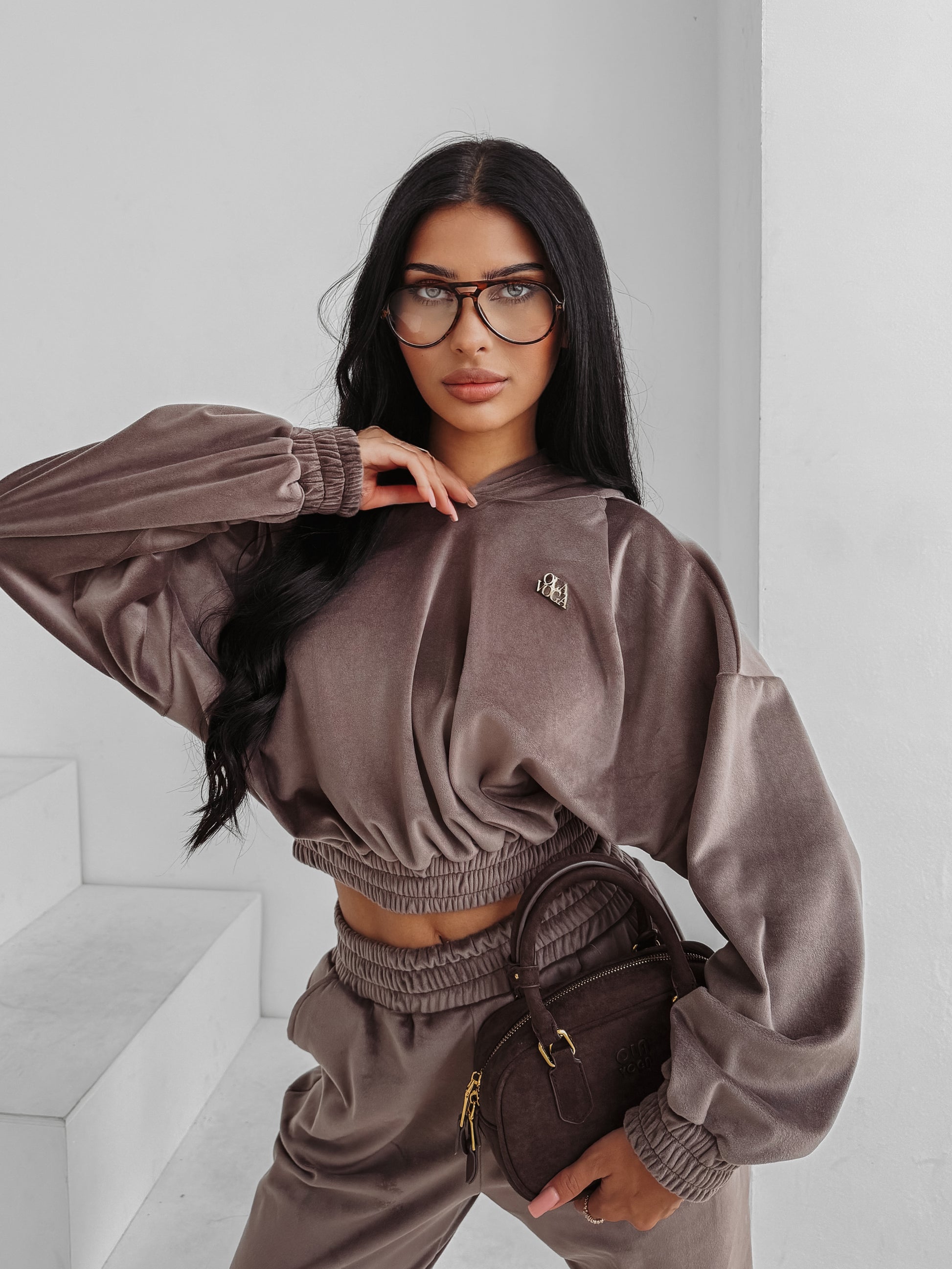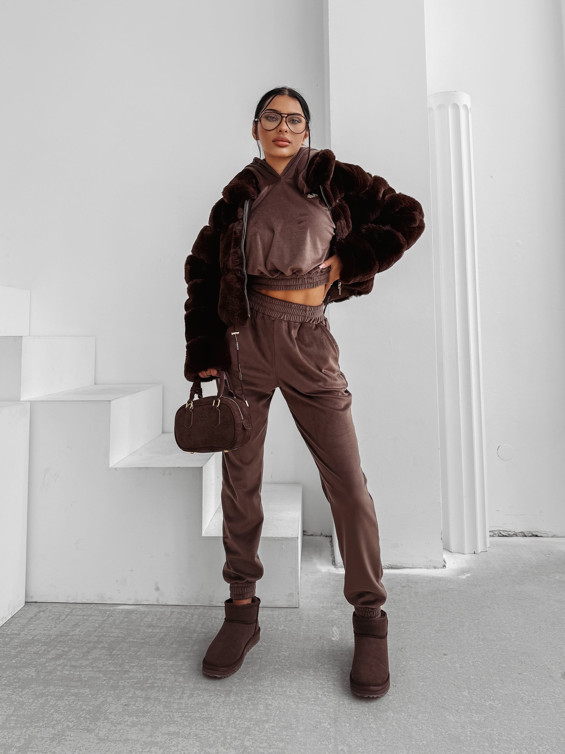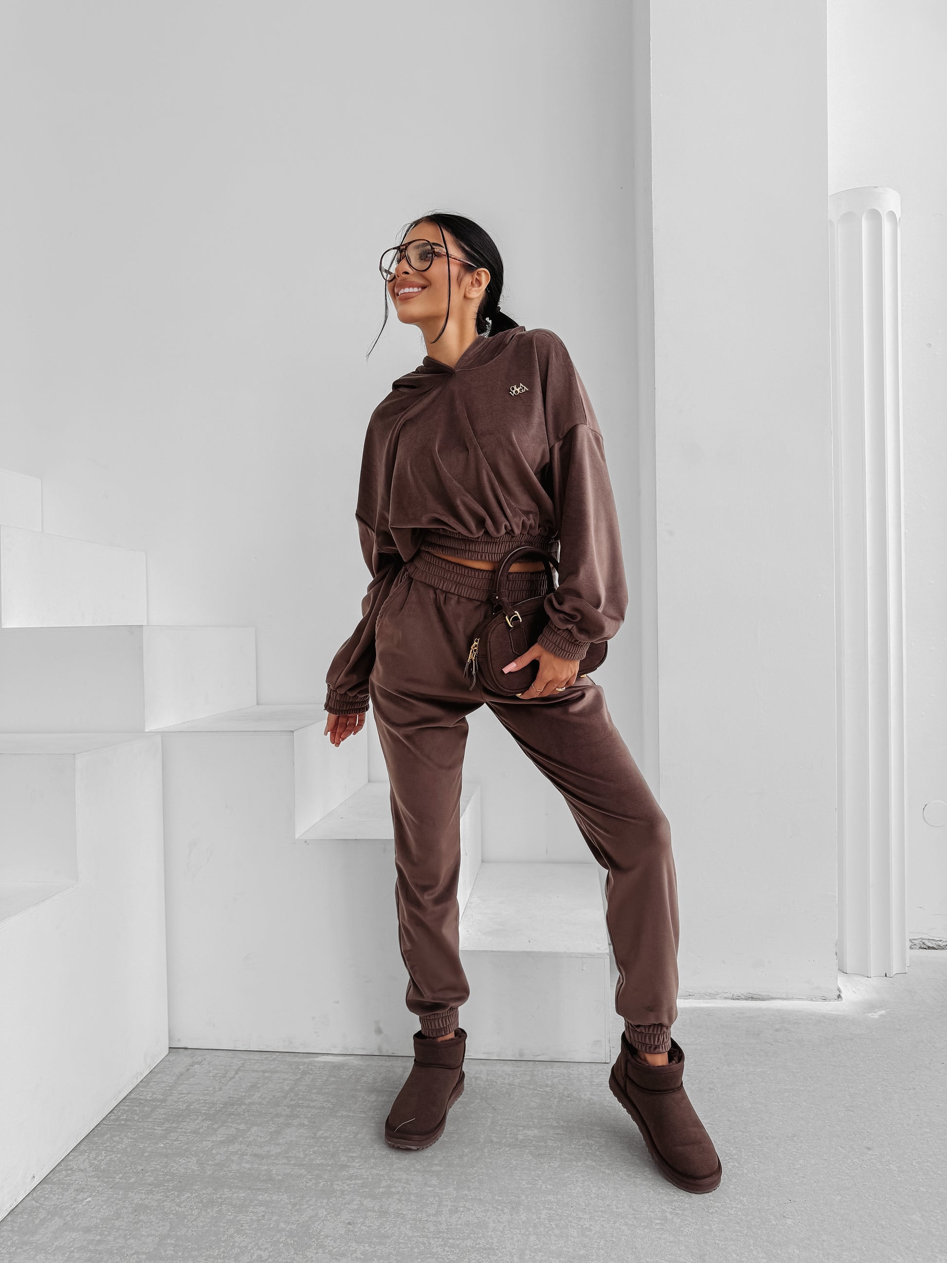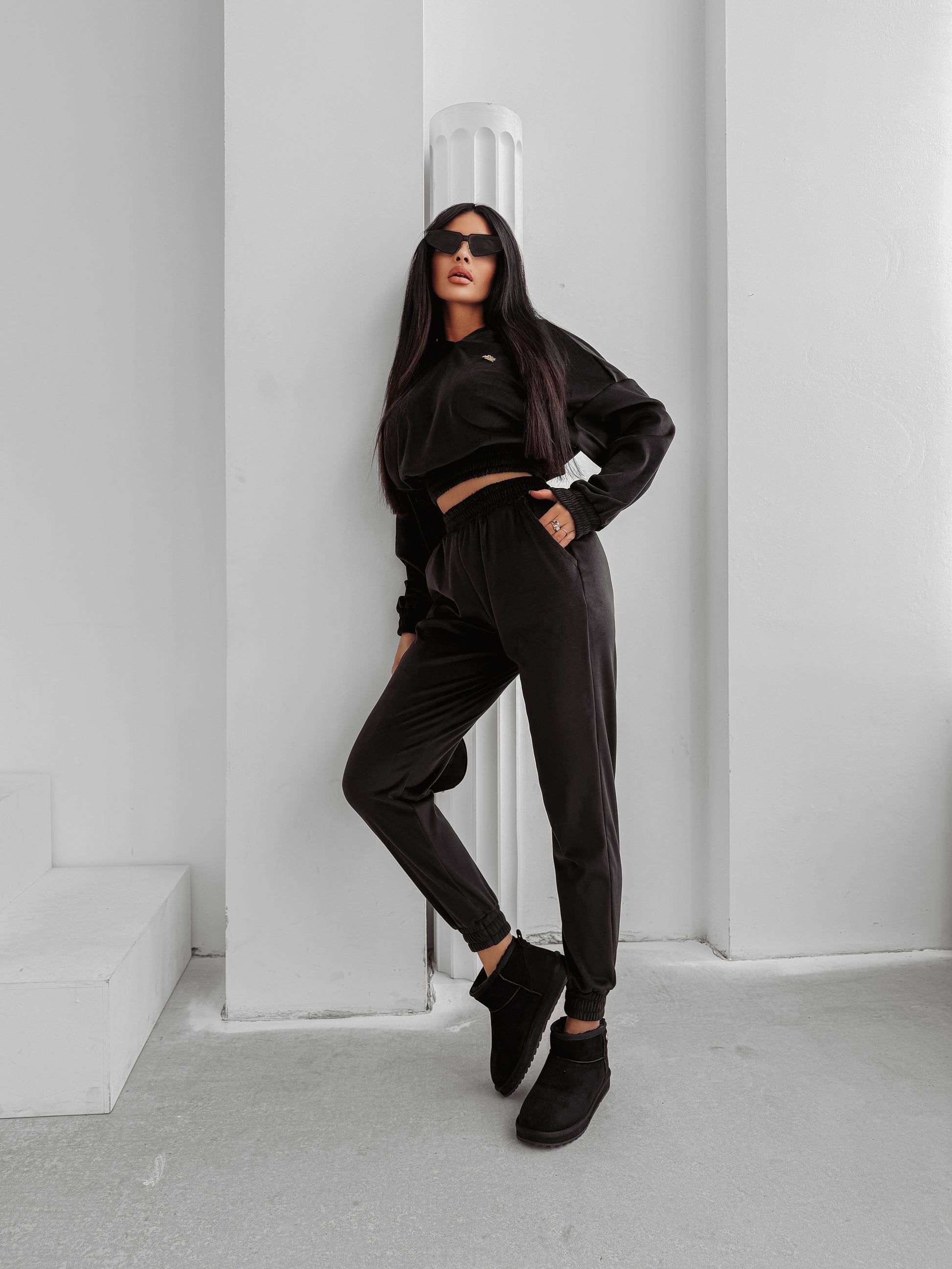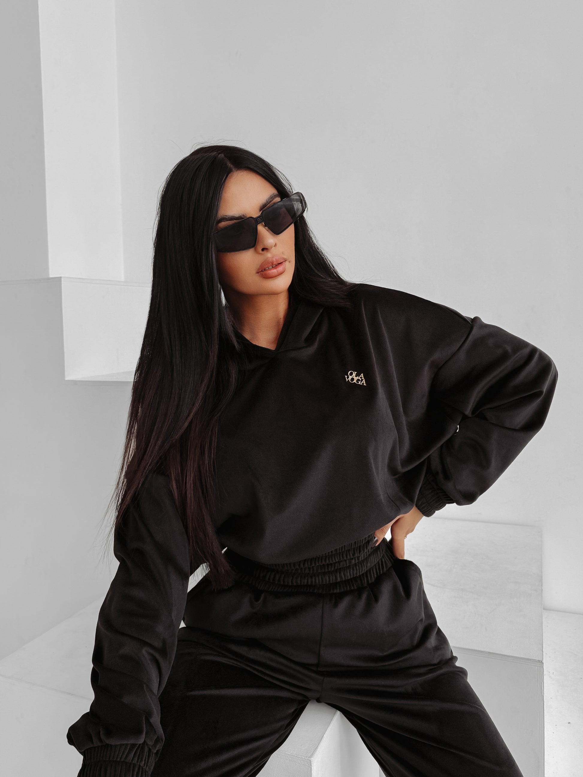 A luxurious women’s set crafted from soft, velvety velour. The top features a slightly oversized hoodie with ribbed cuffs and a relaxed silhouette, finished with a gold metal plate bearing the OLAVOGA logo. The trousers come in a tapered fit with a high waist, elastic waistband, and practical side pockets — combining elegance with everyday comfort.