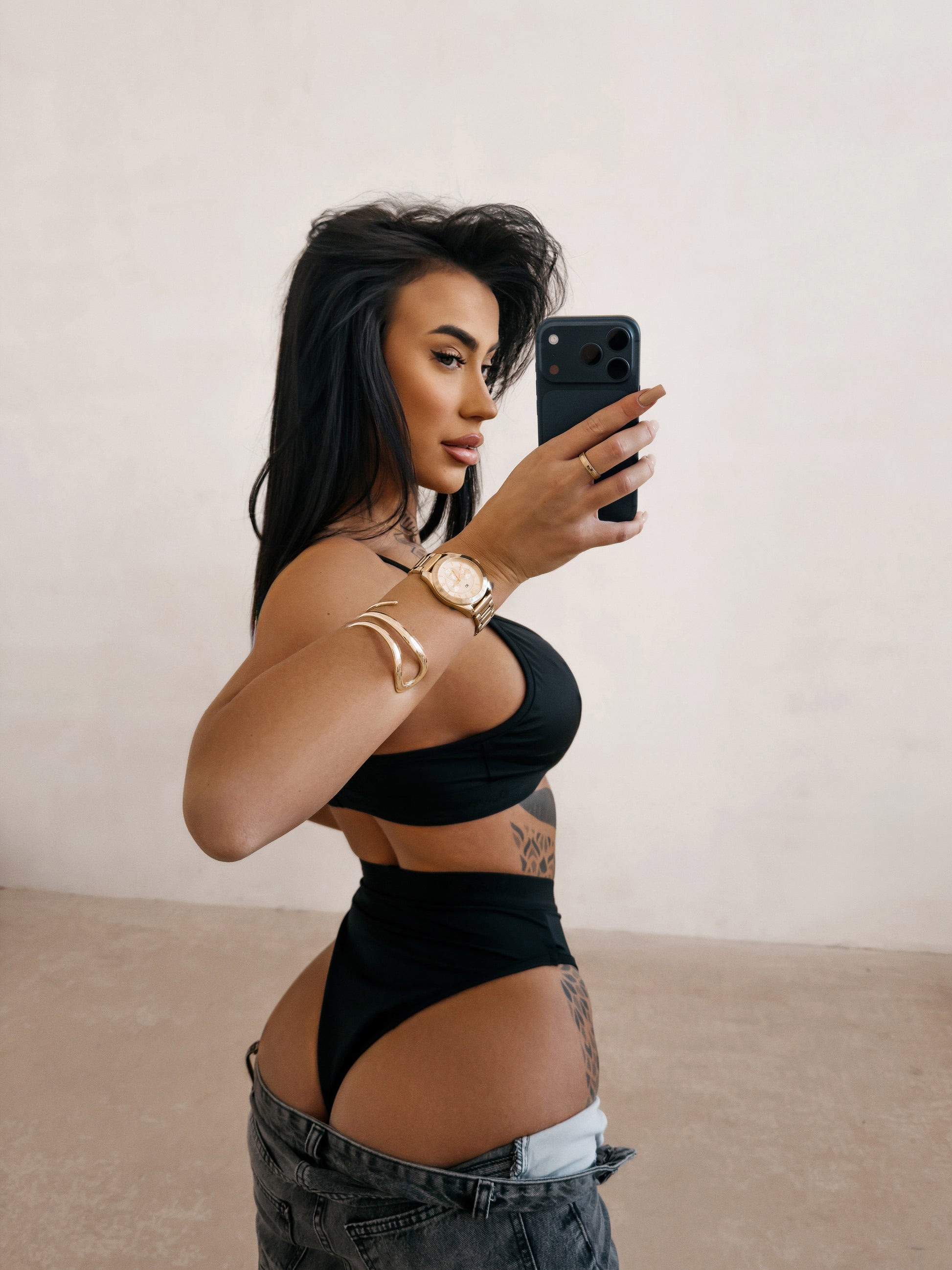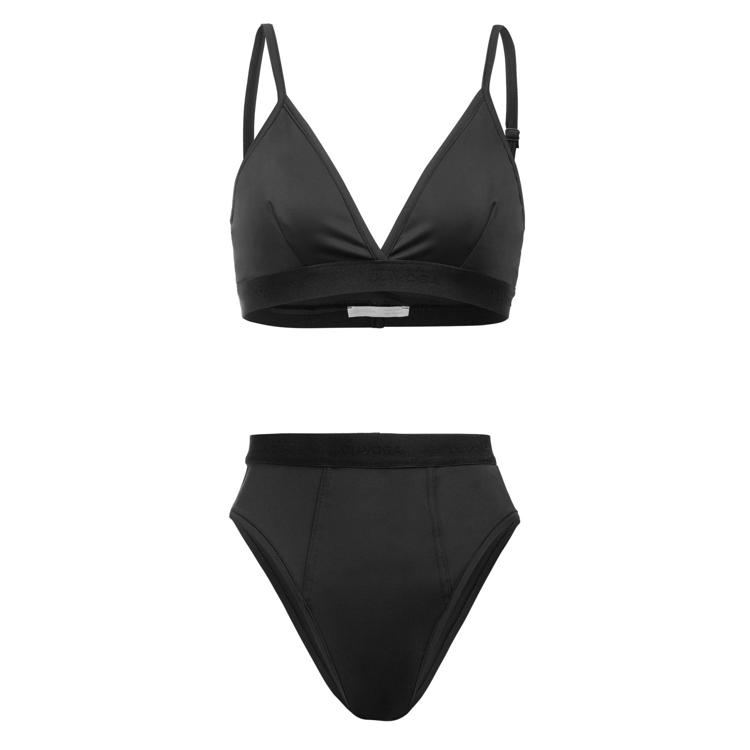 The bottoms are high-waisted briefs with a slightly extended cut that gently enhances the silhouette. The waistband is finished with elastic tape and a discreet OLAVOGA logo.