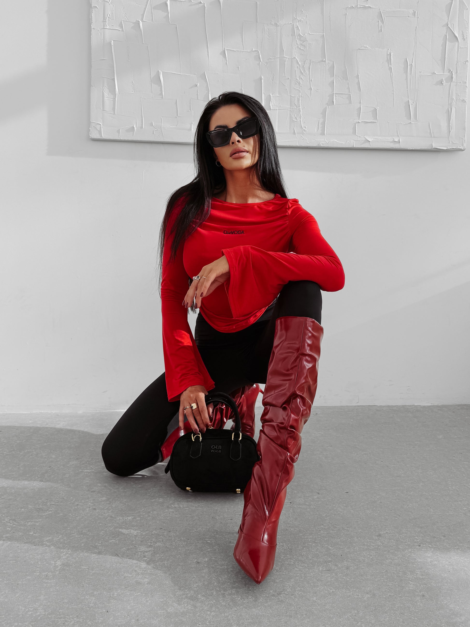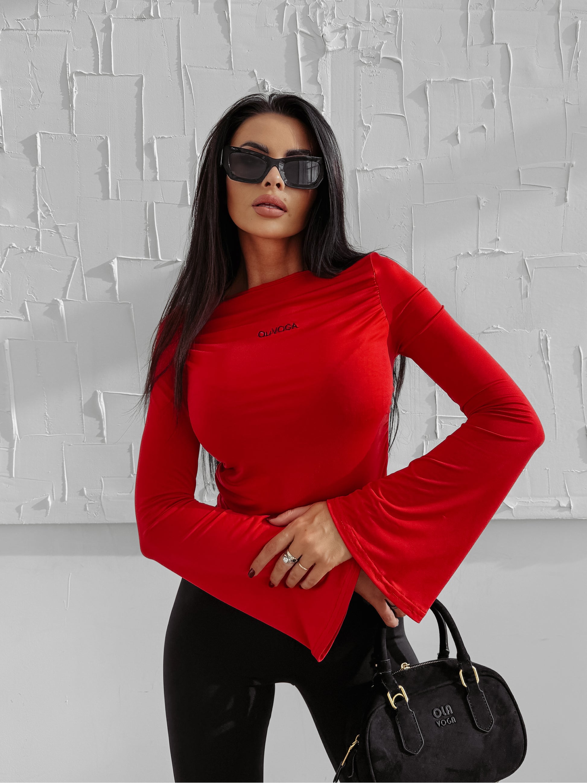 A perfectly fitted long-sleeve top made from high-quality, stretchy fabric. The design features subtle side ruching that flatters the figure and a delicate embroidered OLAVOGA logo on the front. The sleeves are long and slightly flared towards the cuffs for an elegant finish.