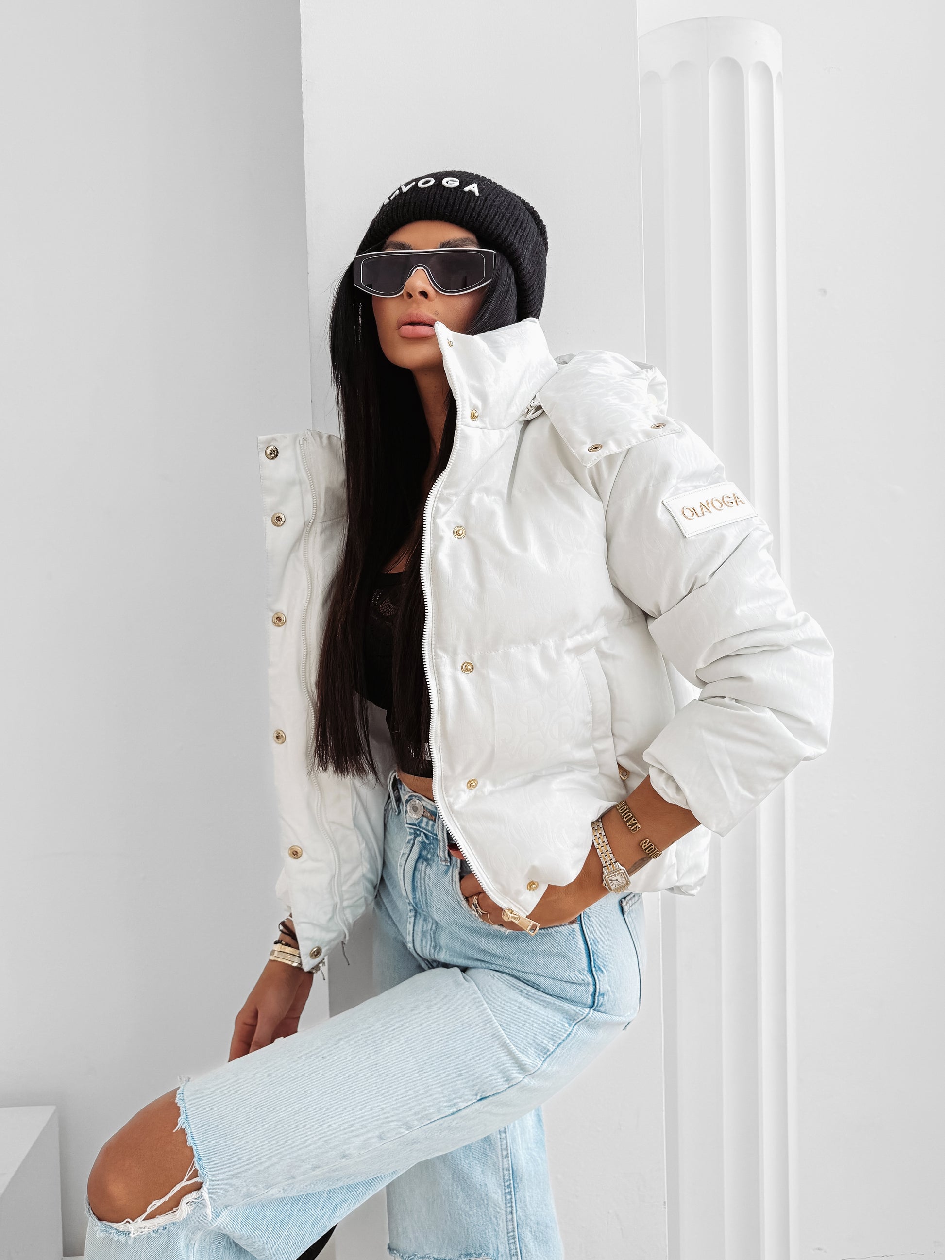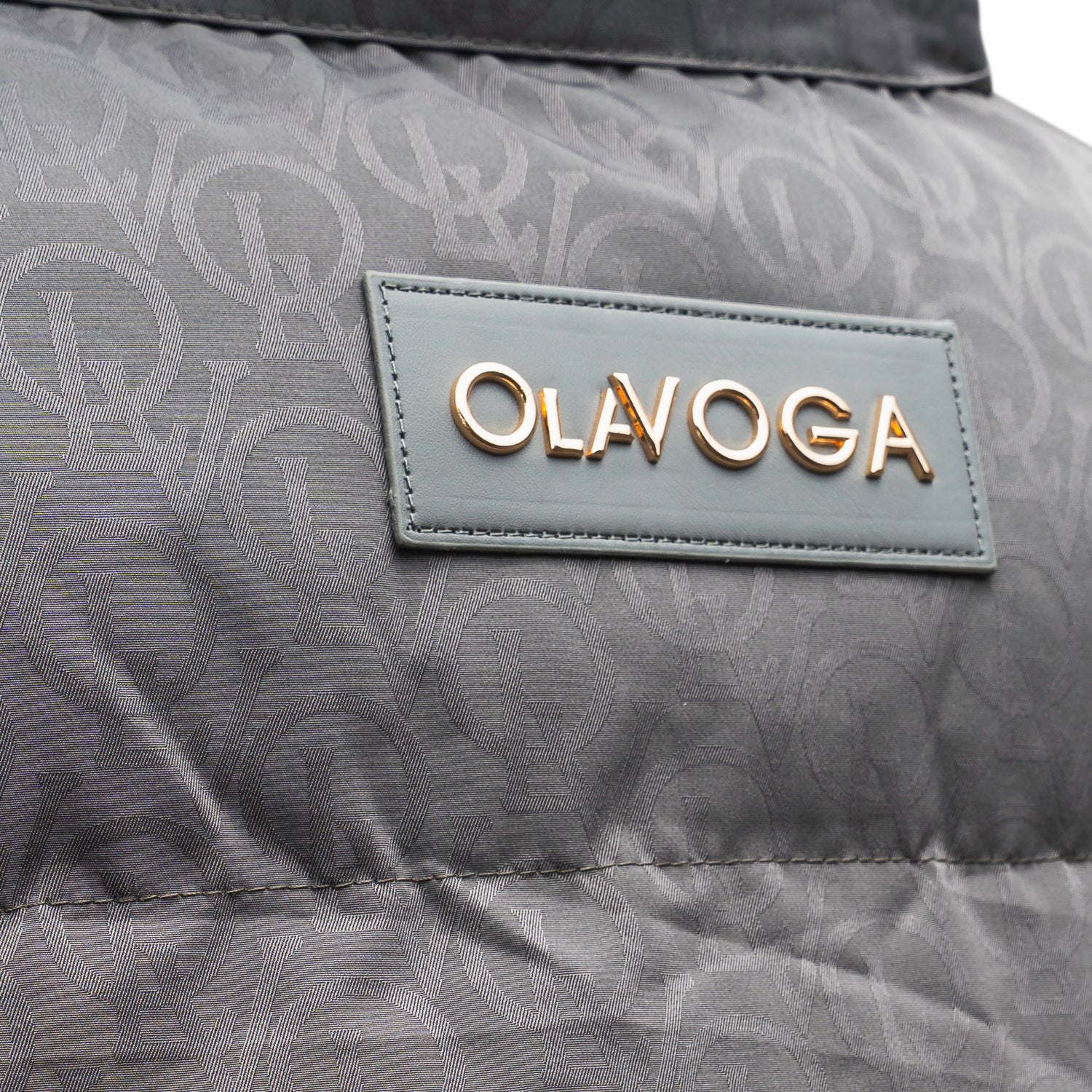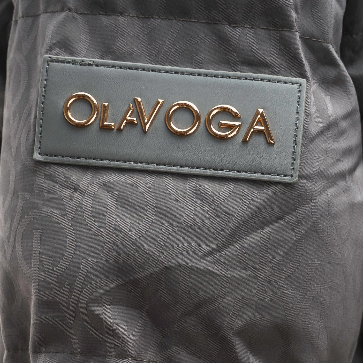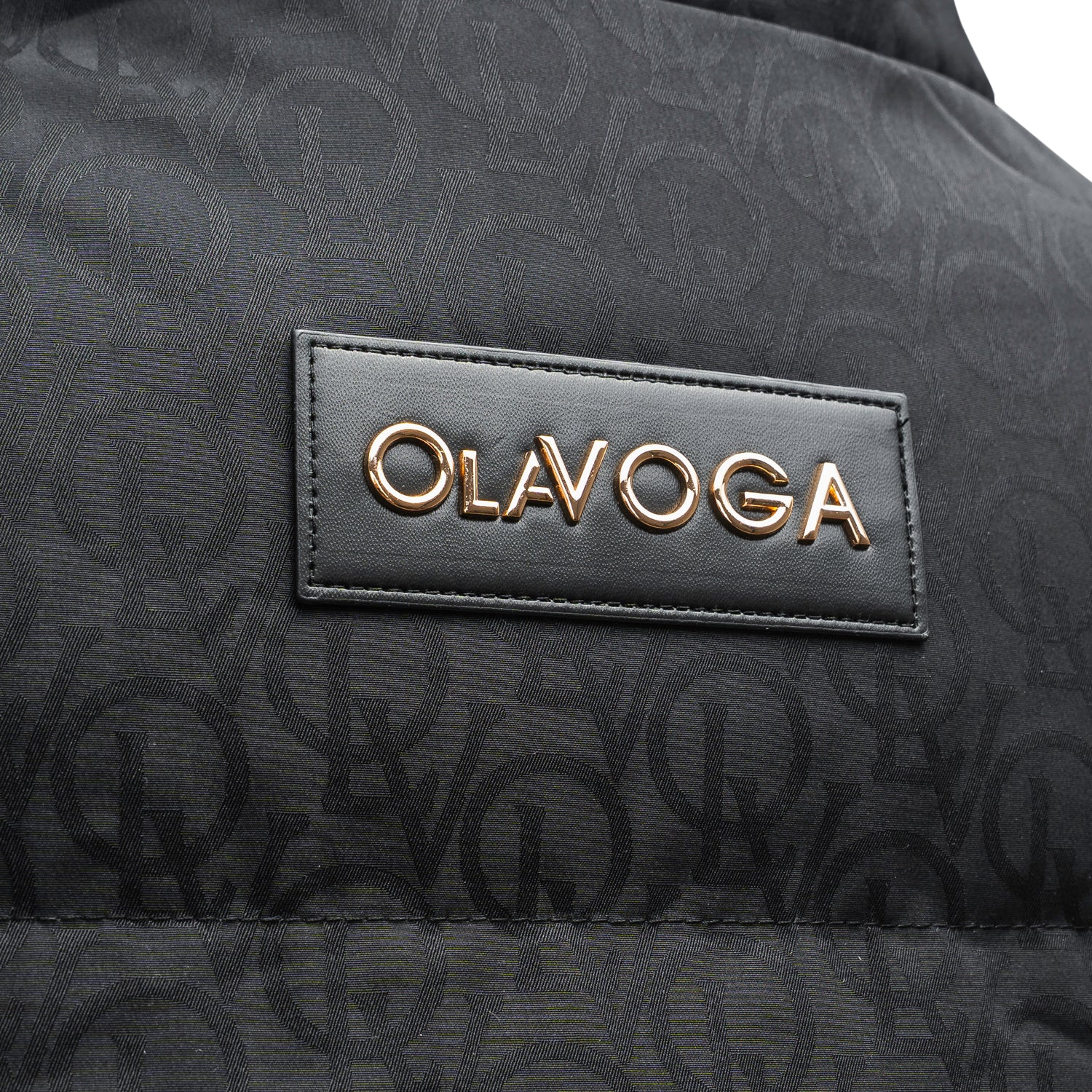 This shorter, slightly oversized design features a detachable hood, side zip pockets, and elegant gold details throughout. The shoulder is embellished with a golden OLAVOGA logo, while the back showcases a large gold brand emblem for a luxurious finish.