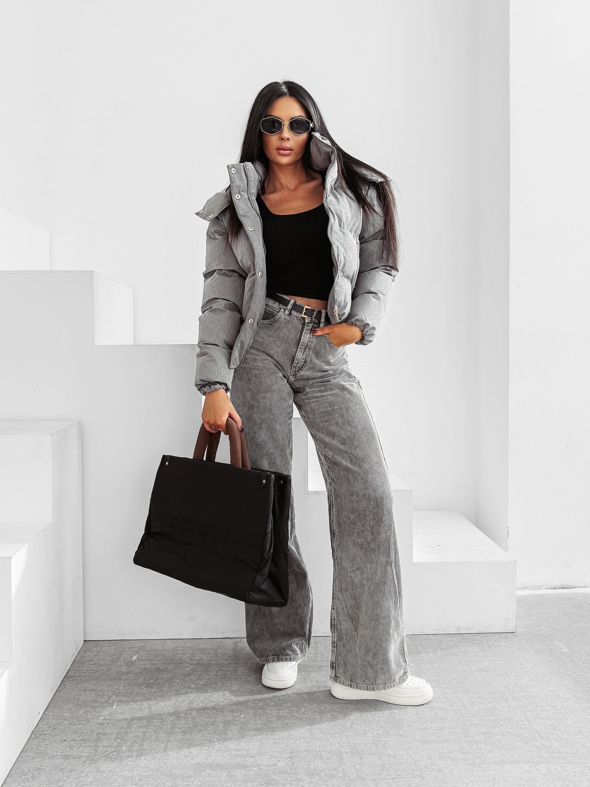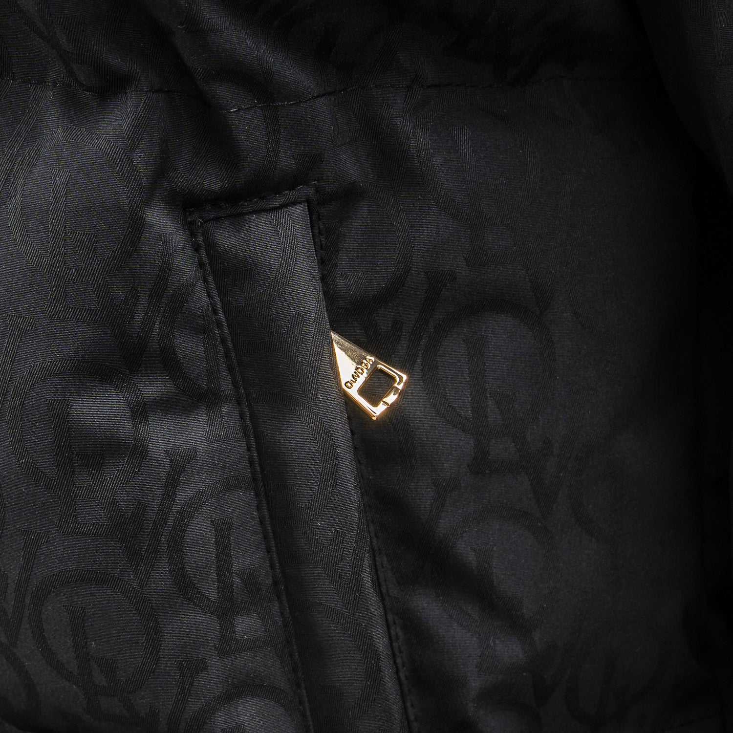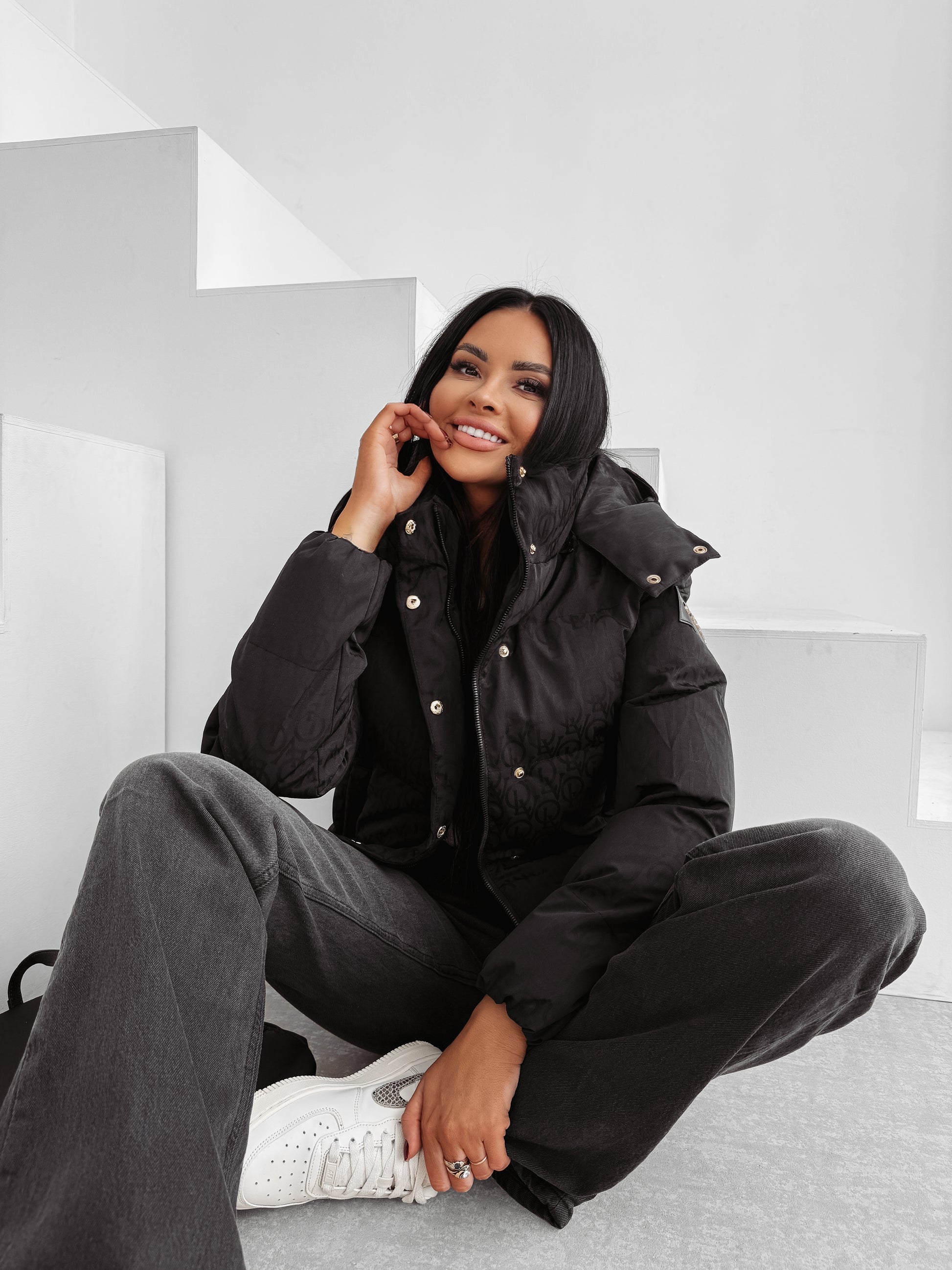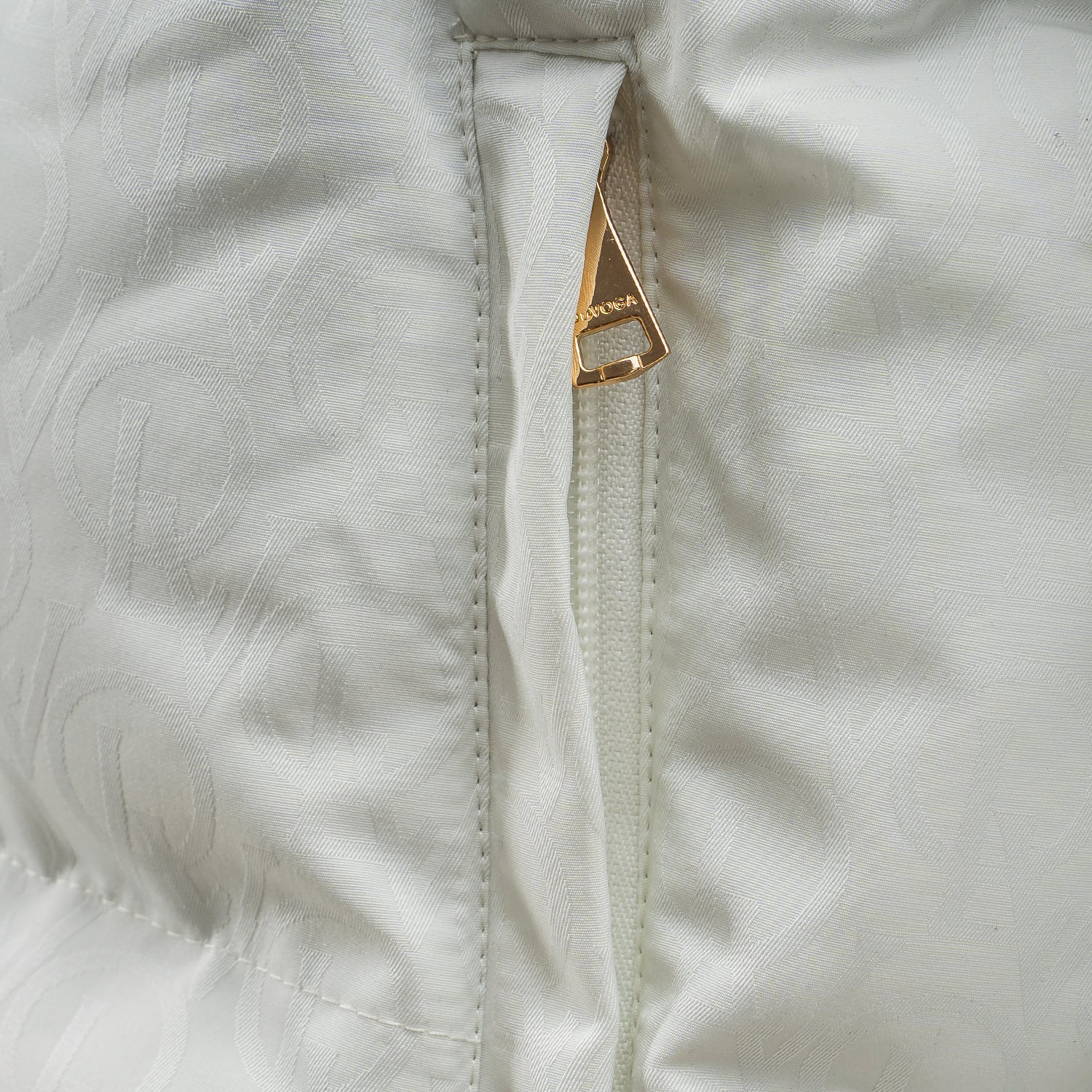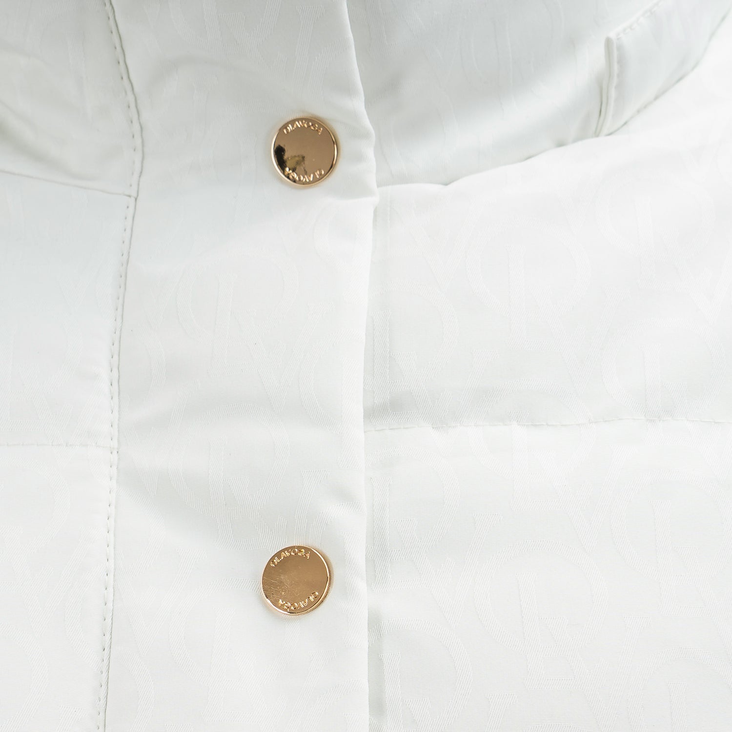 This shorter, slightly oversized design features a detachable hood, side zip pockets, and elegant gold details throughout. The shoulder is embellished with a golden OLAVOGA logo, while the back showcases a large gold brand emblem for a luxurious finish.