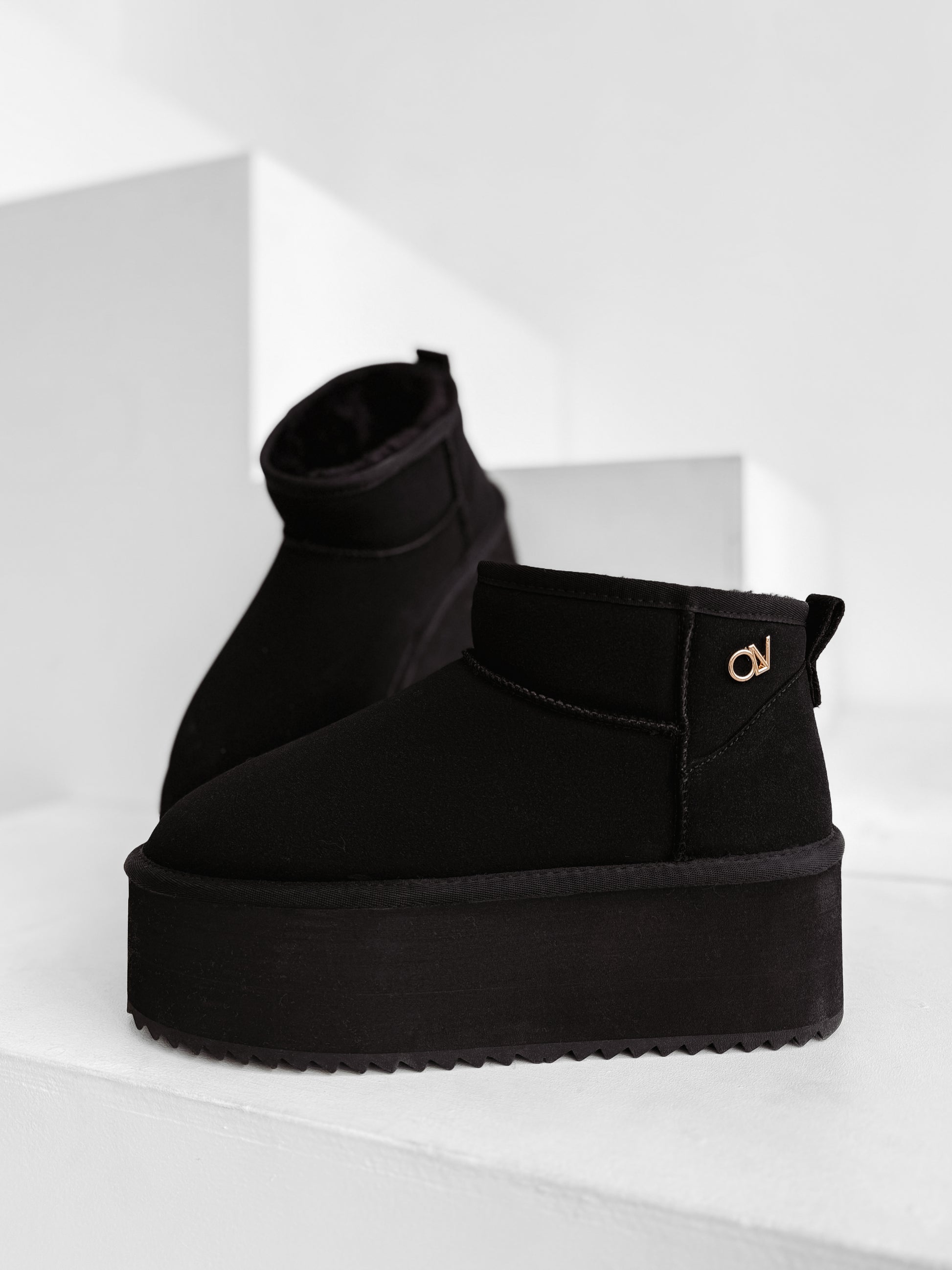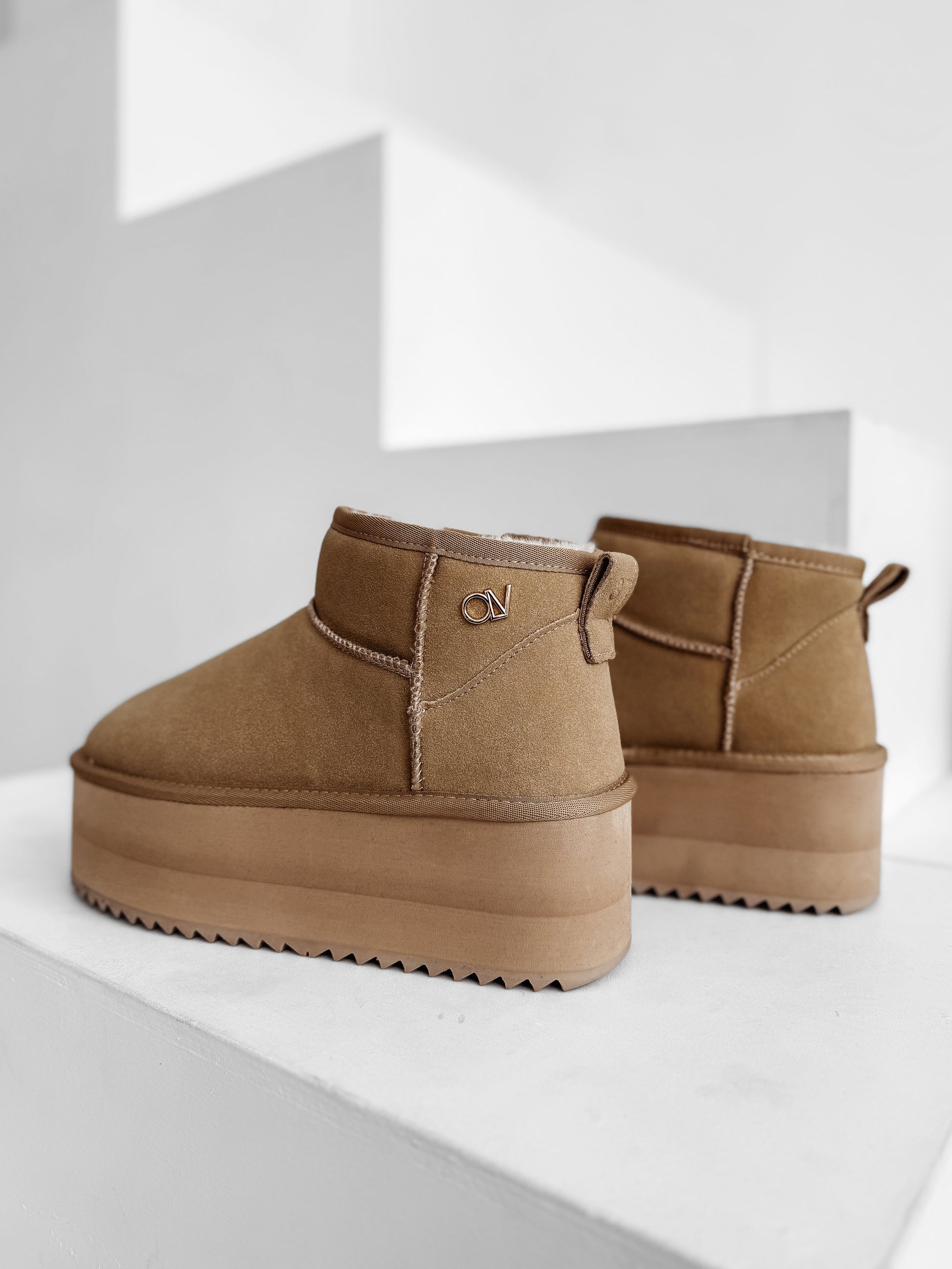 Modern platform mini boots with a sleek, minimalist silhouette. Made from matte eco-suede and lined with soft faux fur for extra warmth and comfort. Set on a chunky platform sole with an anti-slip tread. Finished with a subtle gold OLAVOGA logo detail on the side.
