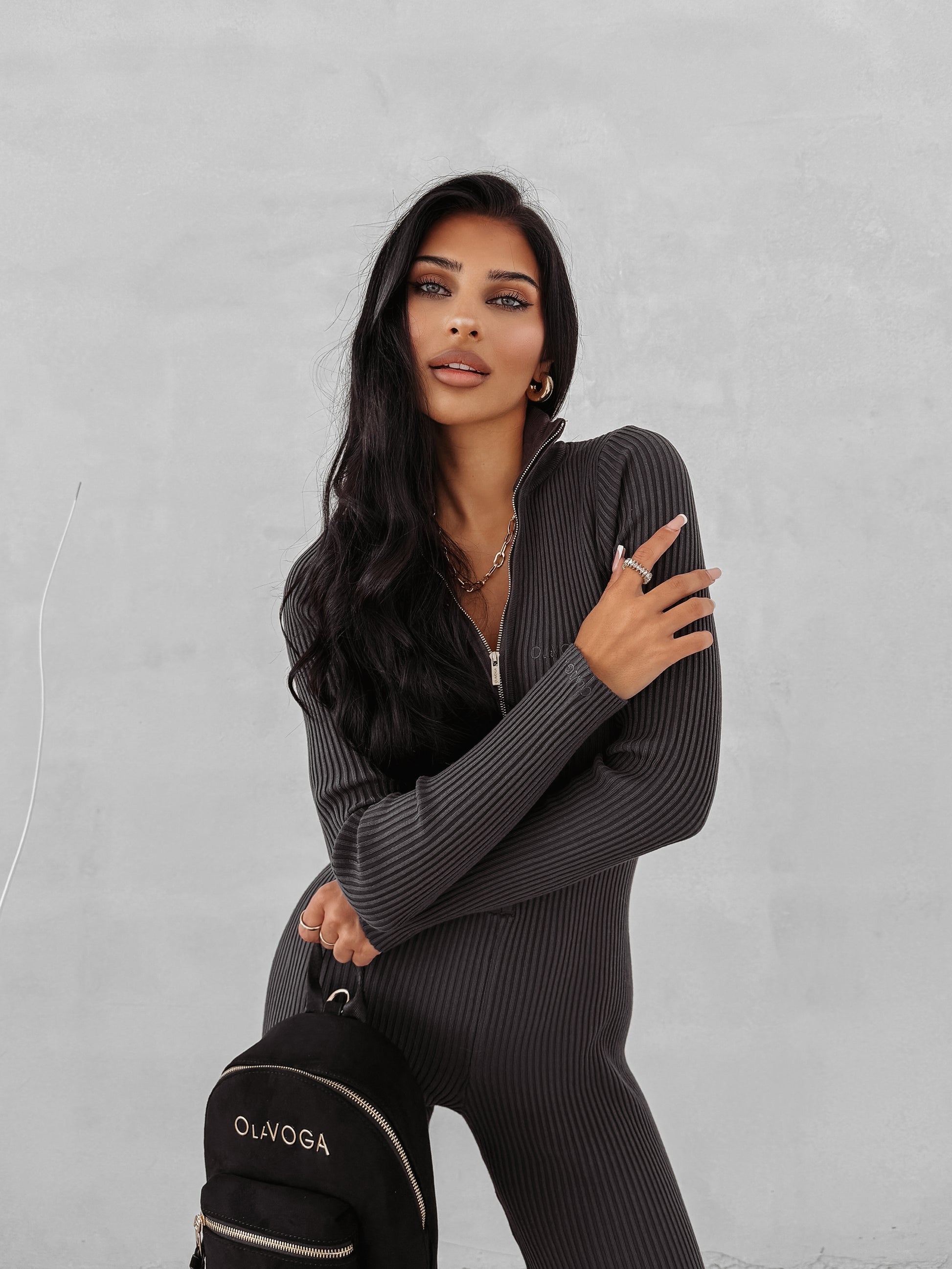 Perfectly fitted casual jumpsuit with a ribbed texture, made of high-quality fabric with a touch of viscose. Features a zip-up top with a subtle OLAVOGA logo, and delicate embroidered branding at the cuff and bust in matching tone.