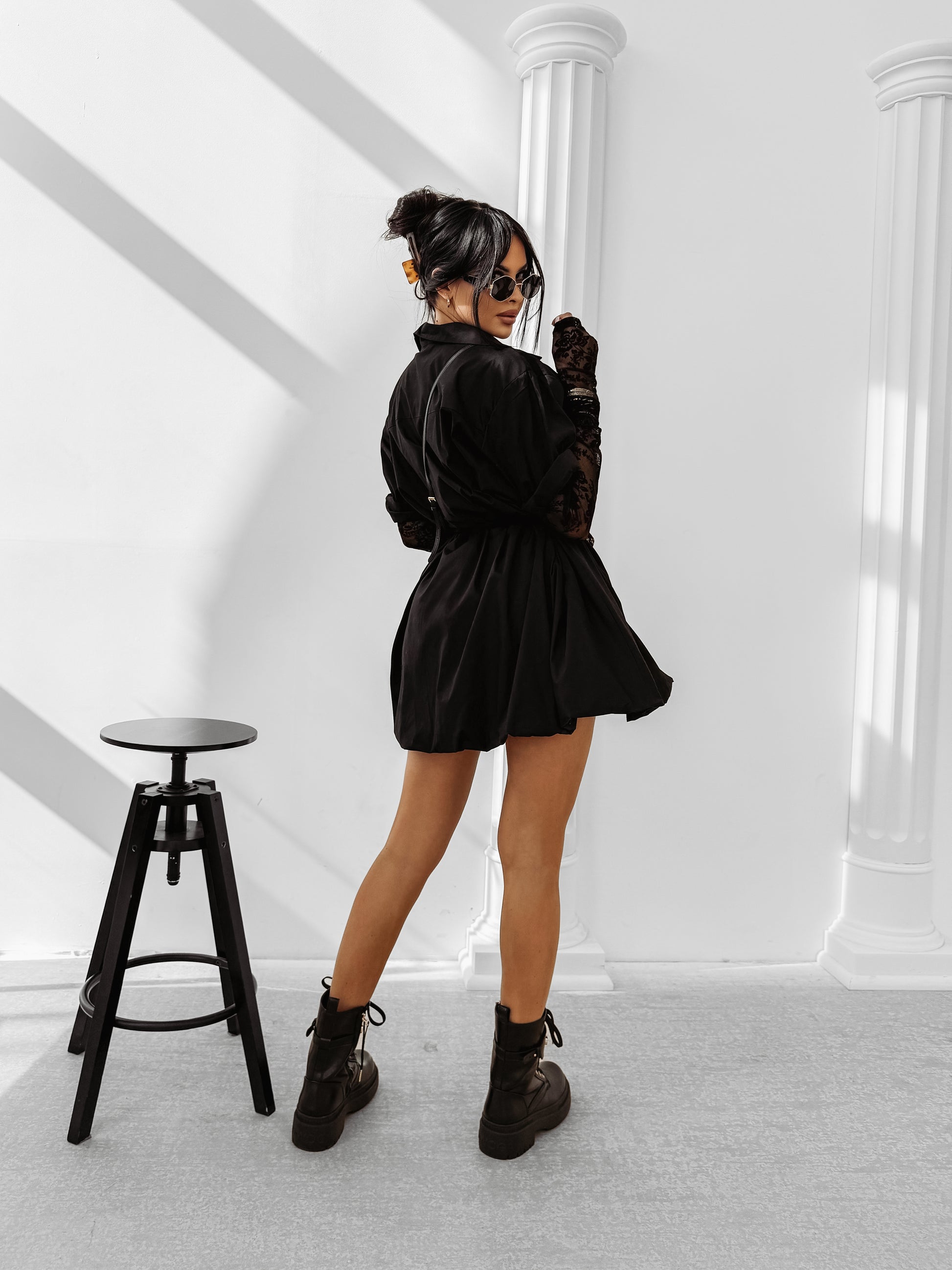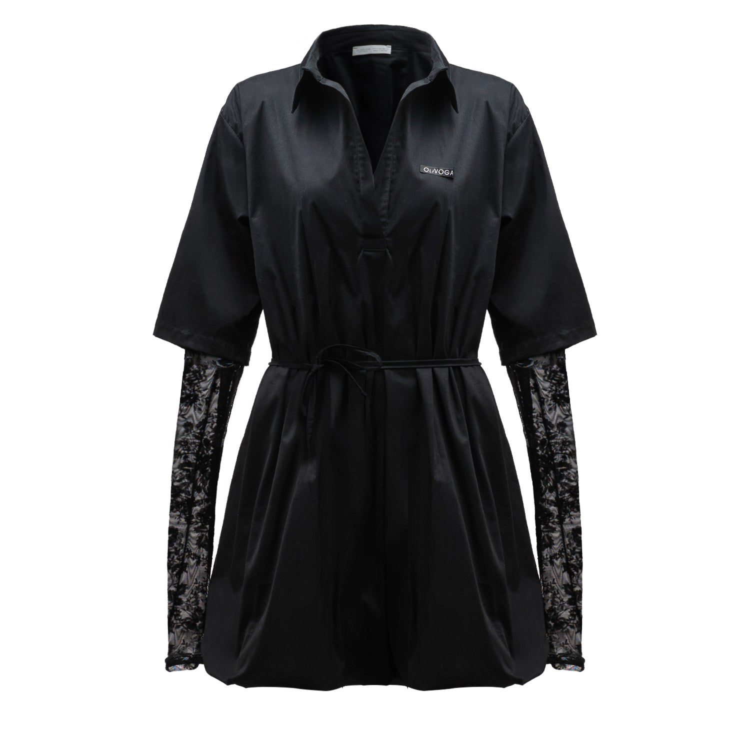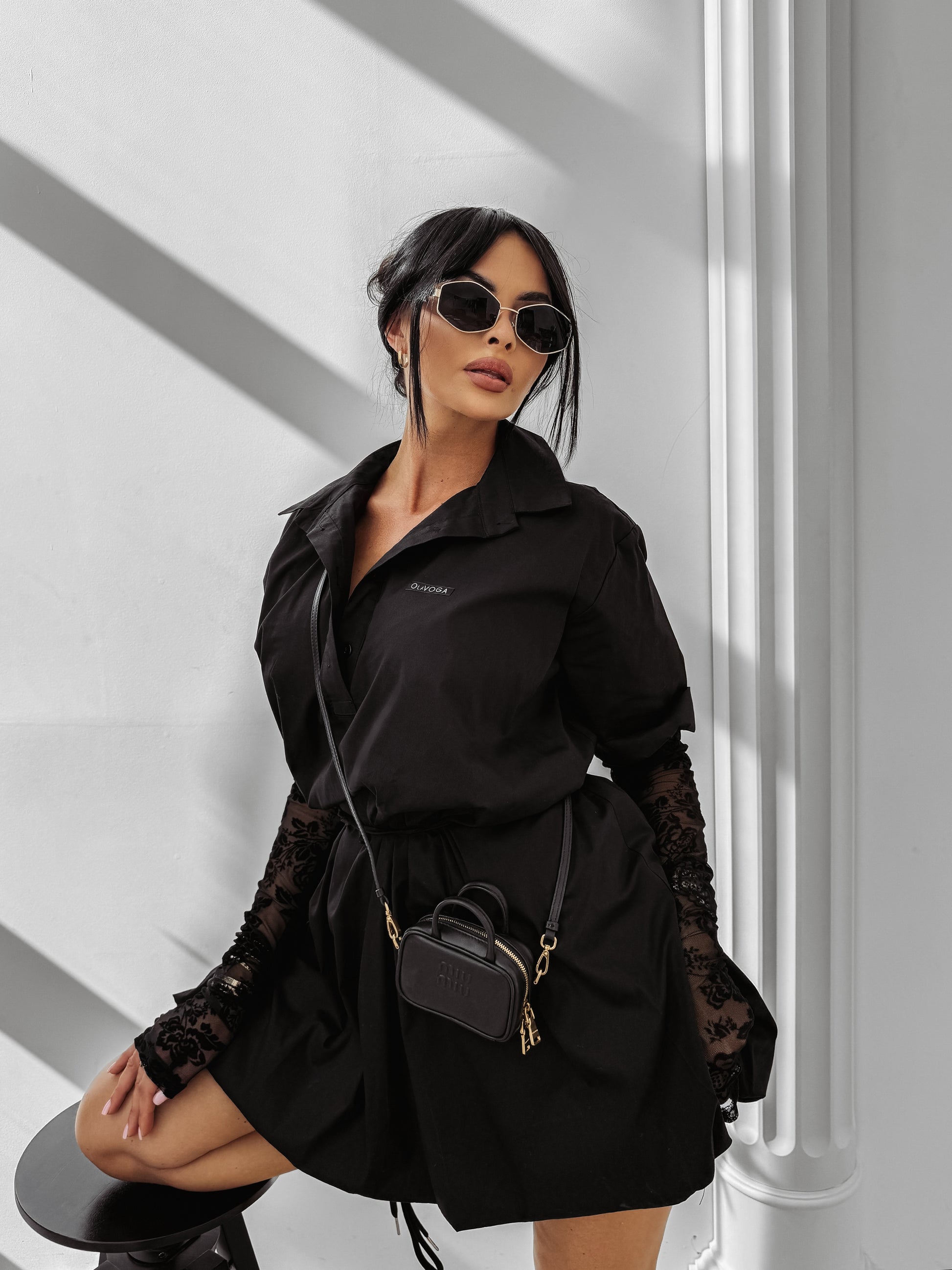 Elegant shirt-style dress made of high-quality cotton. Features a collar, V-neckline and a waist tie accentuating the silhouette. Designed with short sleeves and fitted lace under-sleeves. Subtle OLAVOGA logo patch on the front.