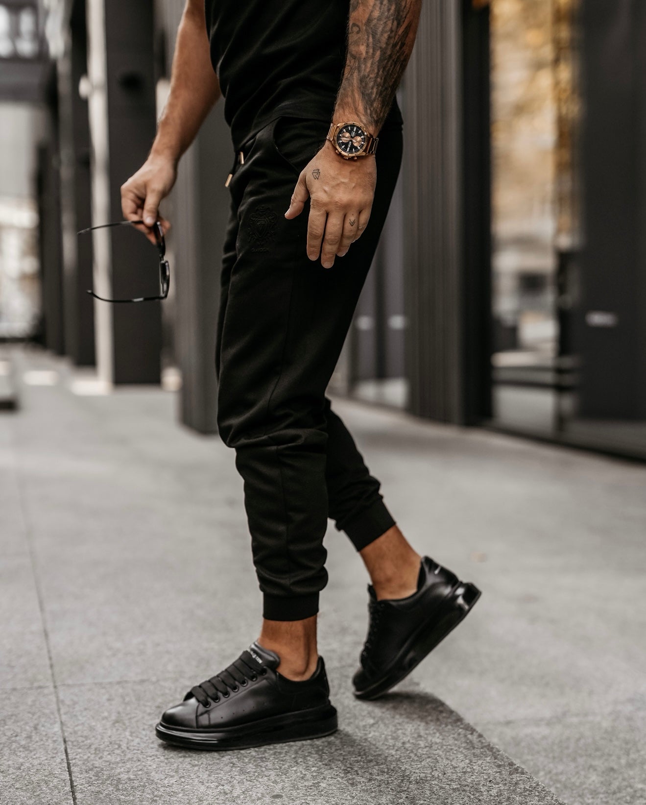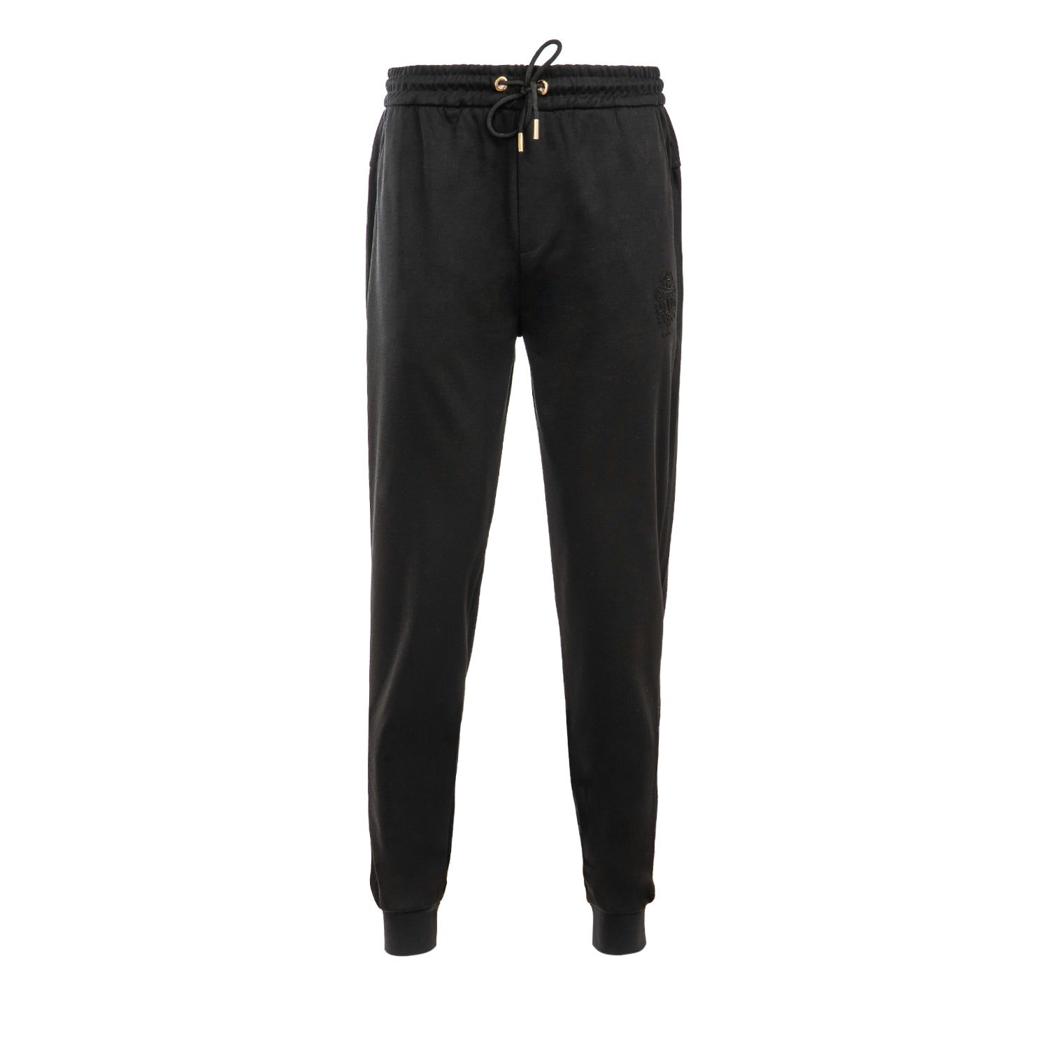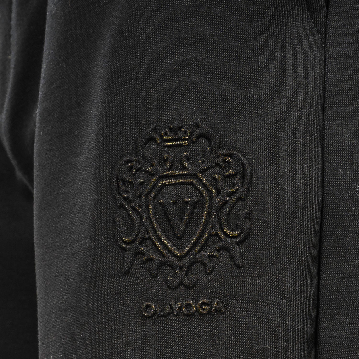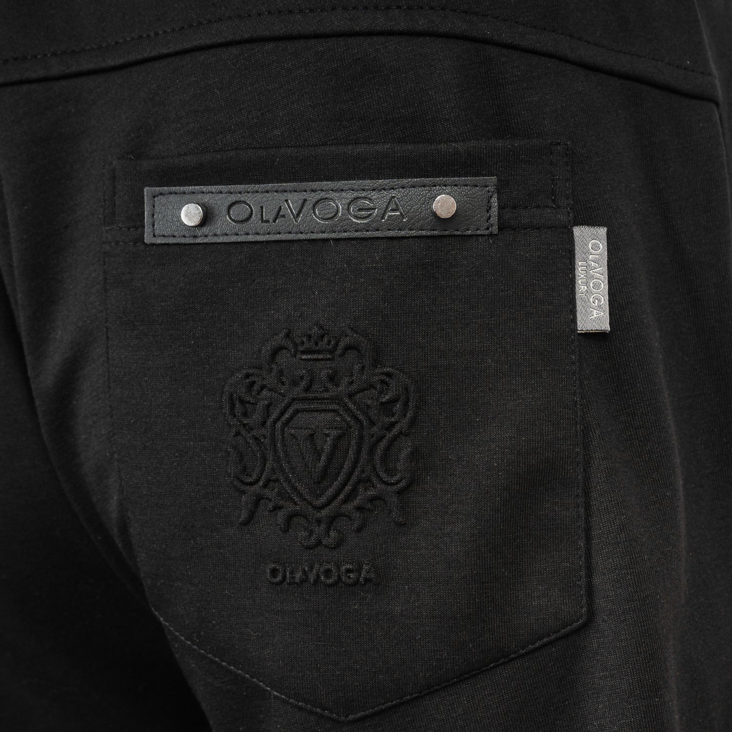 Sport-style men’s trousers with a high waist, crafted from premium, stretchy knit fabric for comfort and a perfect fit. The back features a distinctive raised embroidered crest logo of the OLAVOGA brand. Designed with an elasticated waistband and adjustable drawstring with engraved metal tips, along with elegant eco-leather detailing.