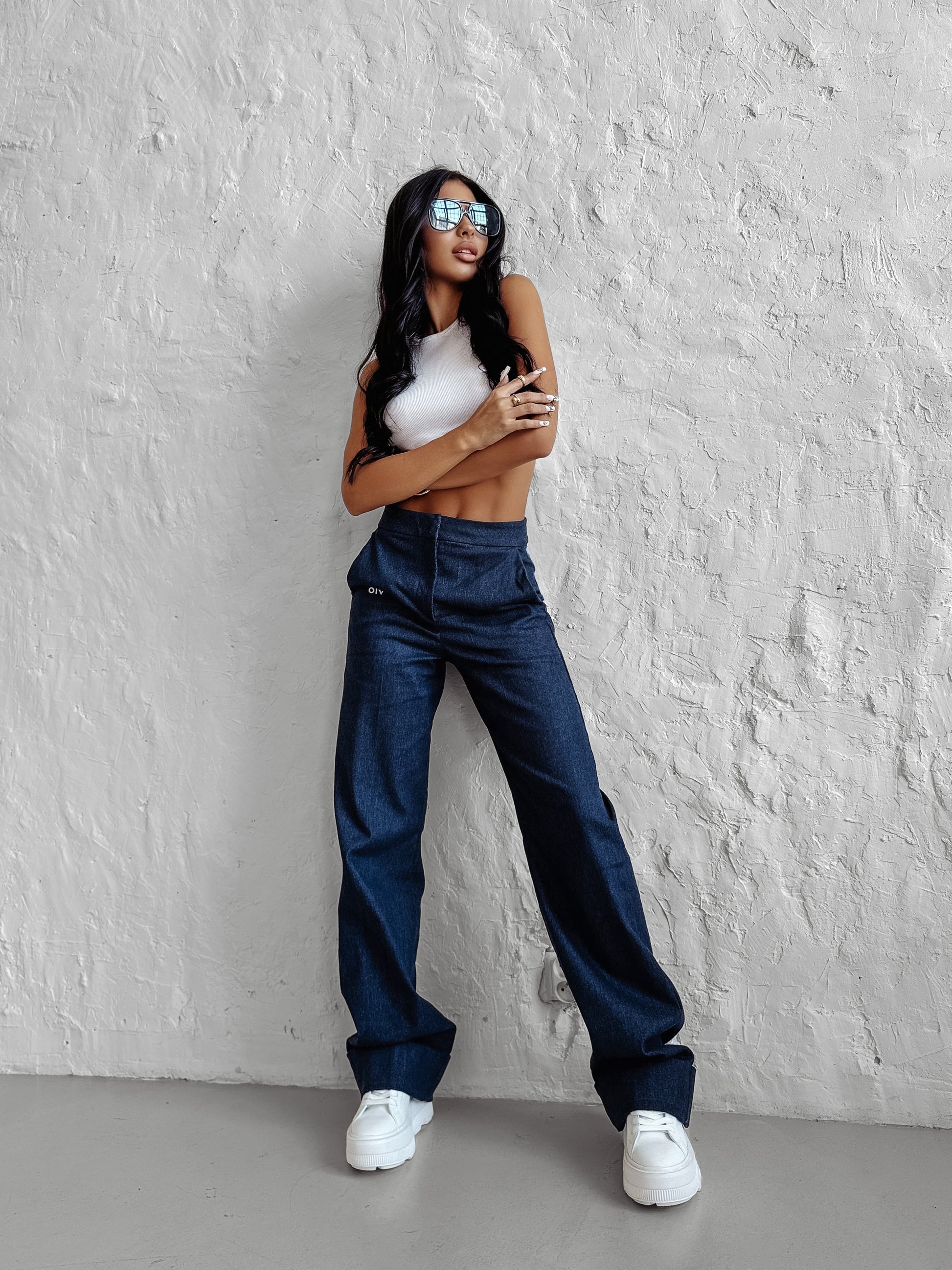 High-waisted casual trousers in a denim-inspired style, made from high-quality cotton fabric. Feature a straight leg with a subtle turn-up hem. Equipped with pockets on both the front and back. A minimalist OLV logo detail is placed on the front.