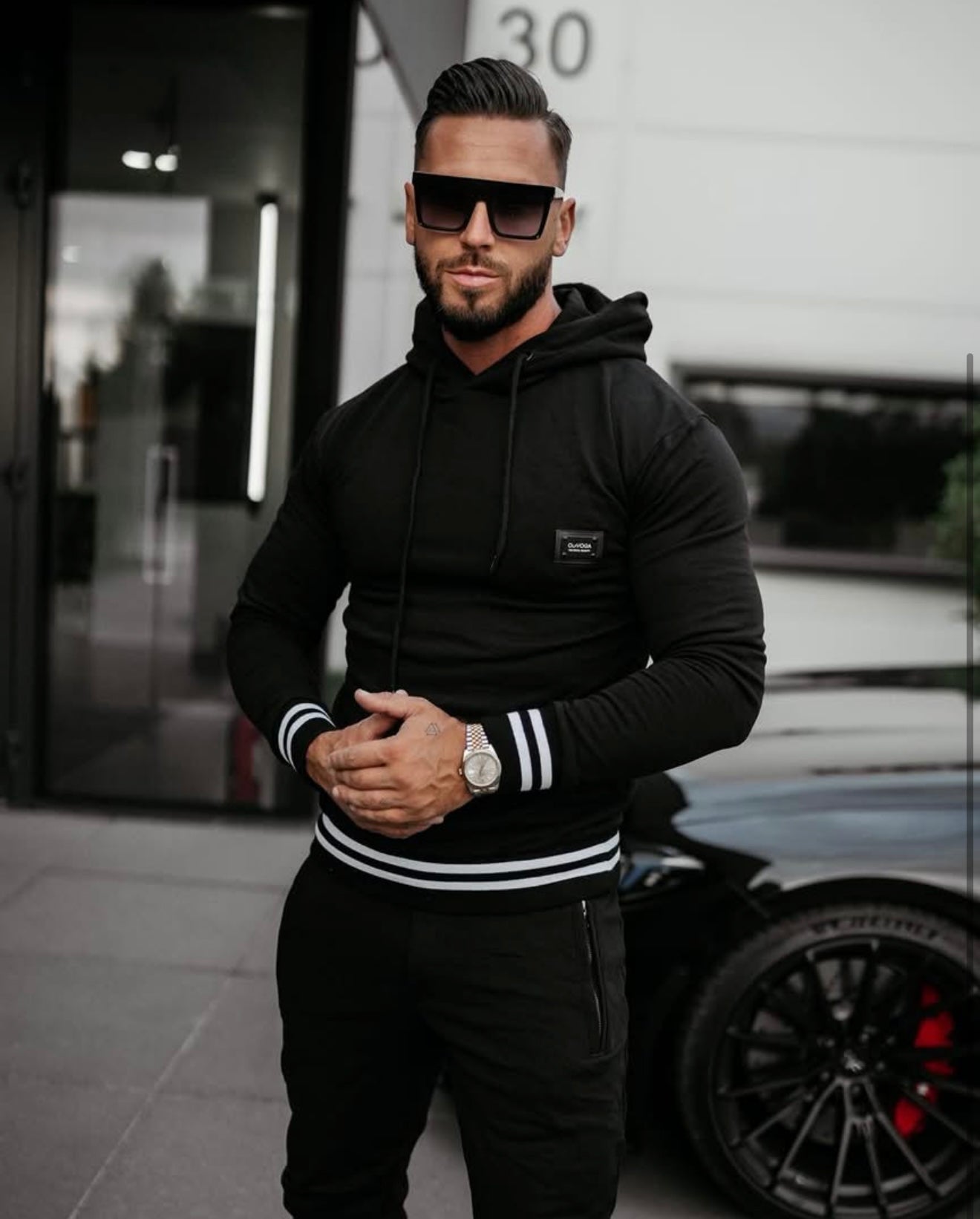 Top: A classic-fit hoodie with ribbed cuffs and a minimalist branded patch on the chest.
