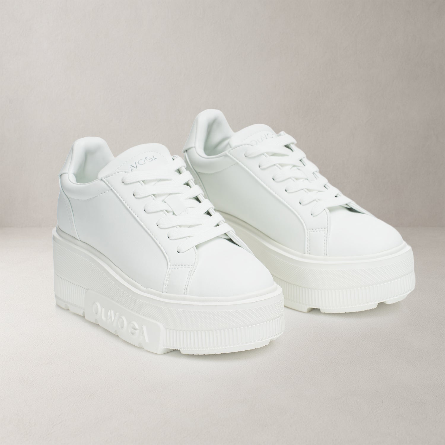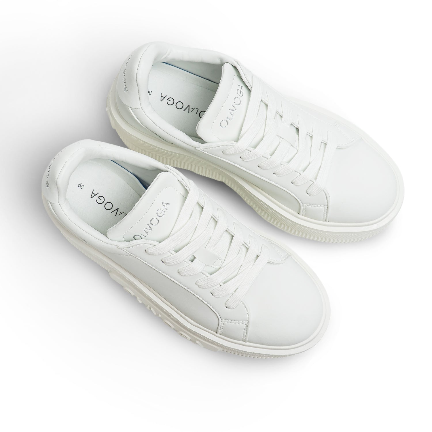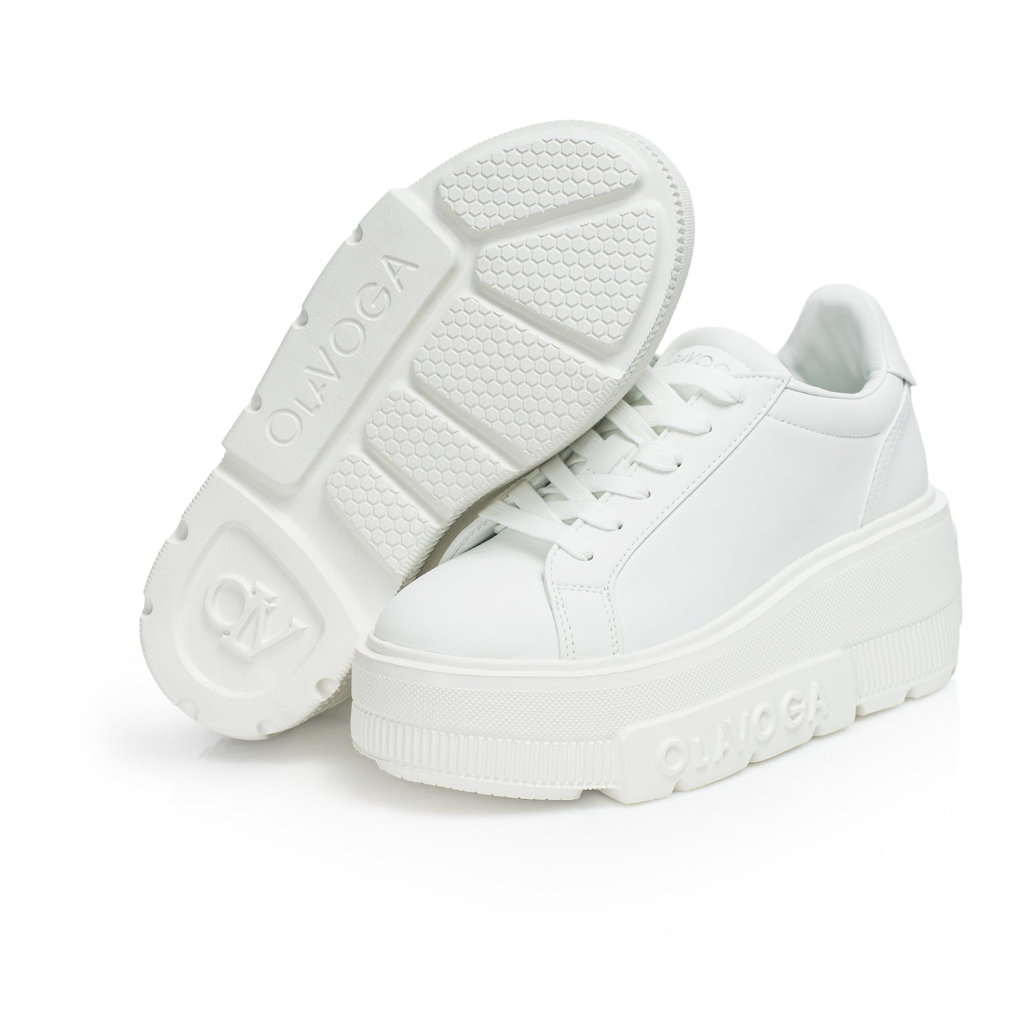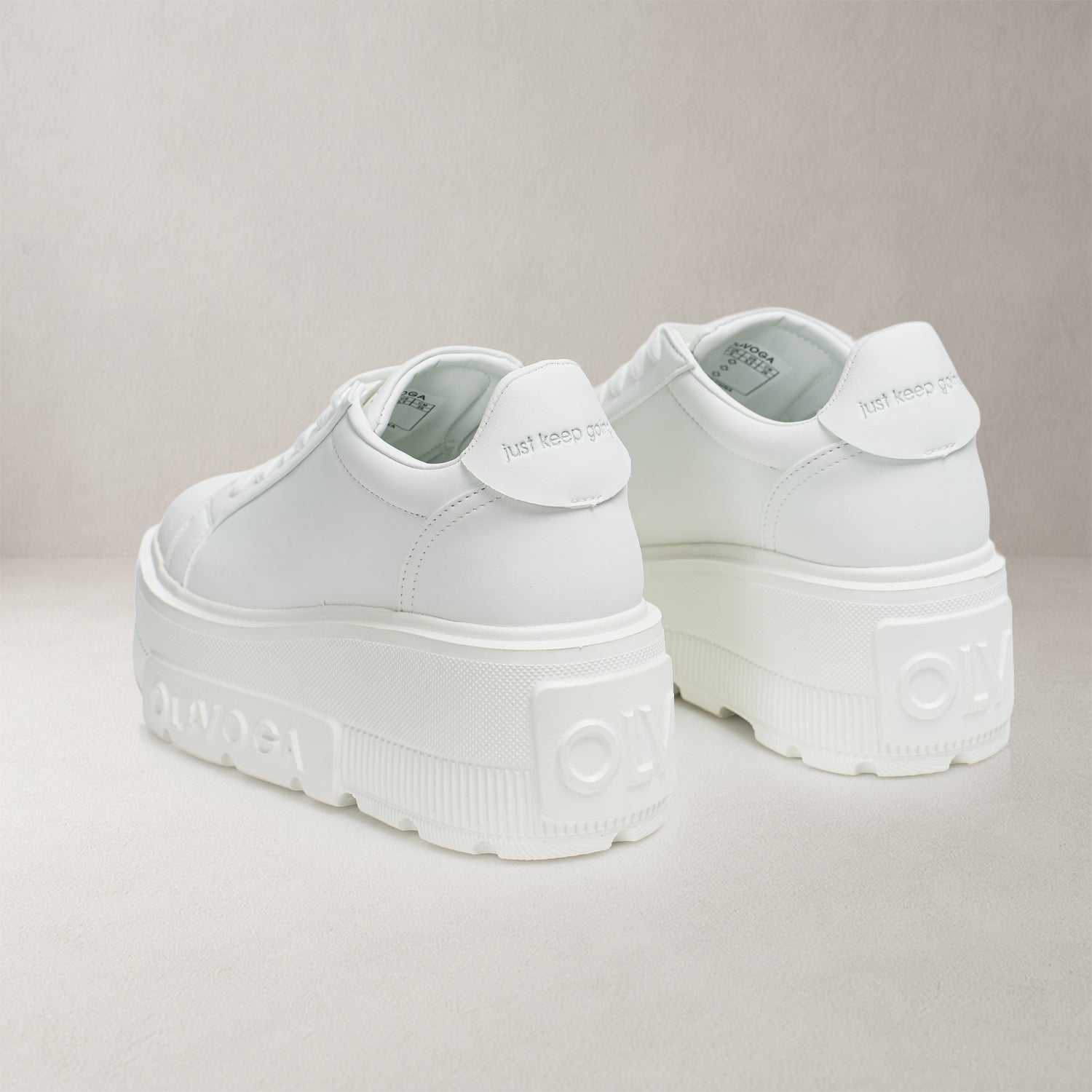 Casual sneakers set on a chunky platform sole. The upper is made from a smooth, matte-finish material and features a subtle “just keep going” slogan on the heel. The sole includes a debossed OLAVOGA logo, with additional branding on the bottom. Lace-up fastening.