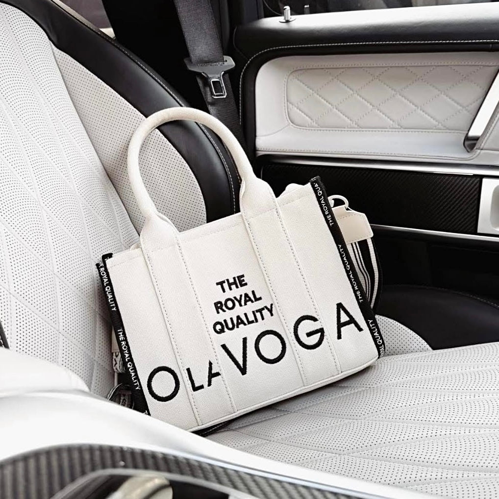 Women’s mini shopper bag with a modern design. Made from durable textile fabric, decorated with a bold OLAVOGA logo and contrasting straps with THE ROYAL QUALITY print. Features short handles for carrying by hand, a practical zip fastening and an inner pocket.