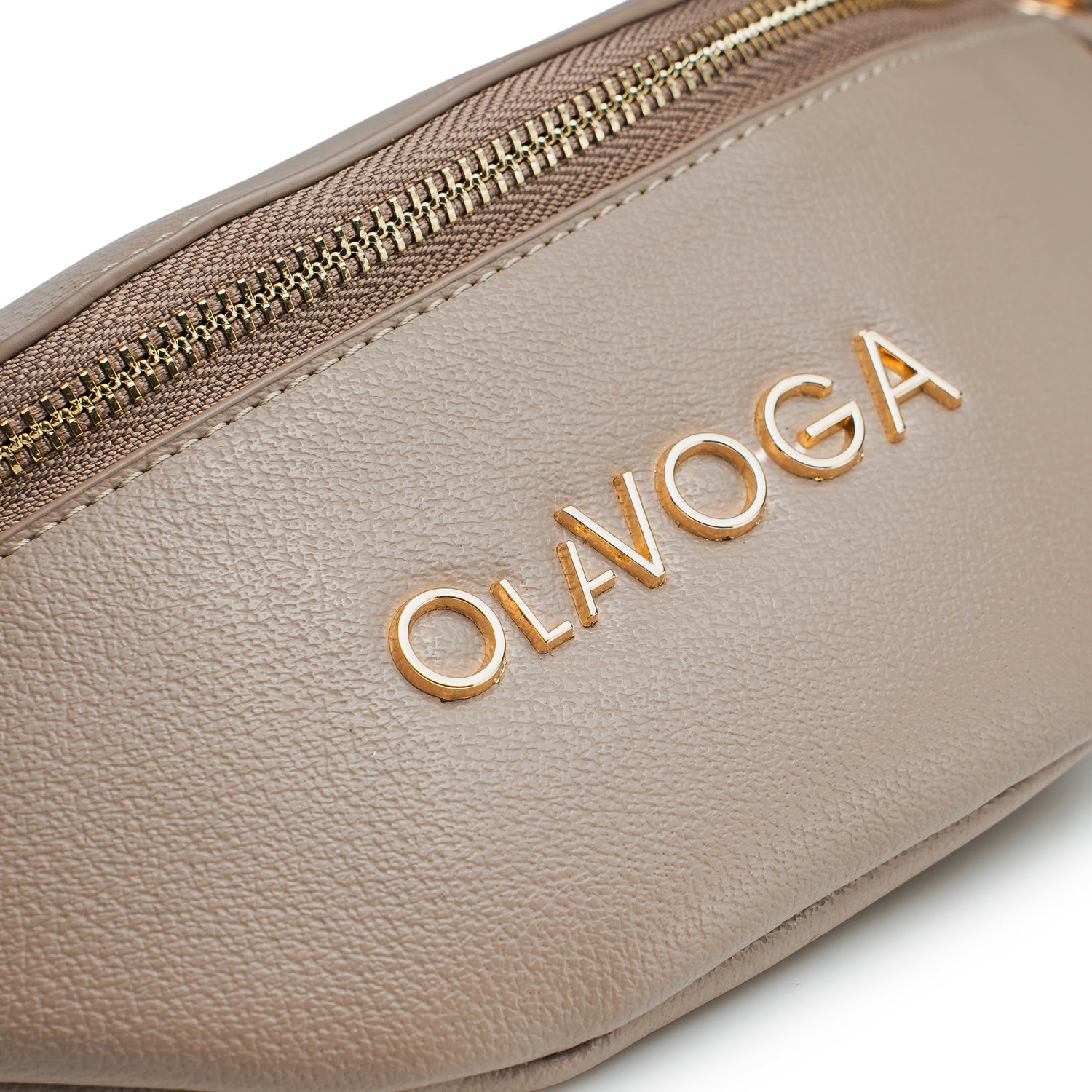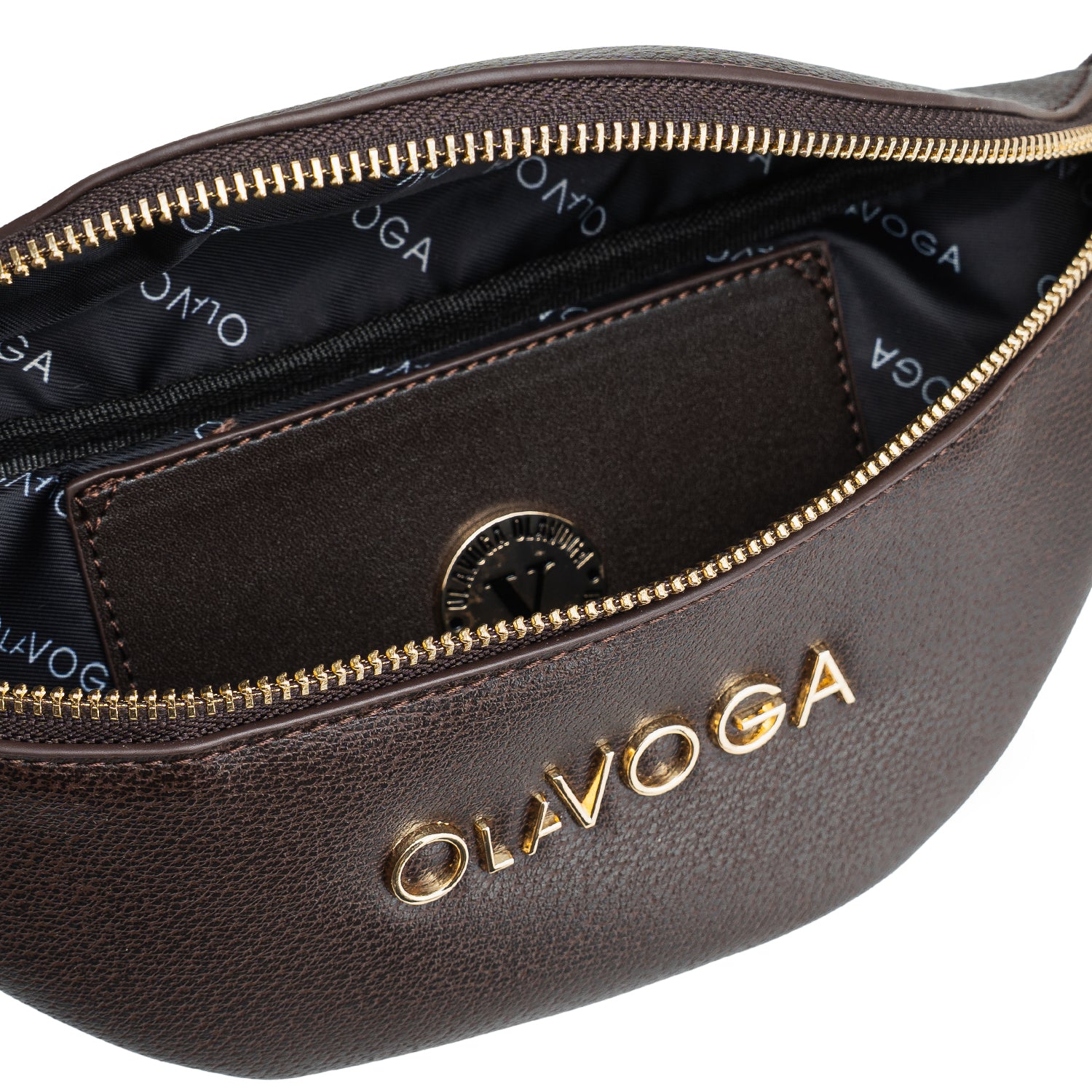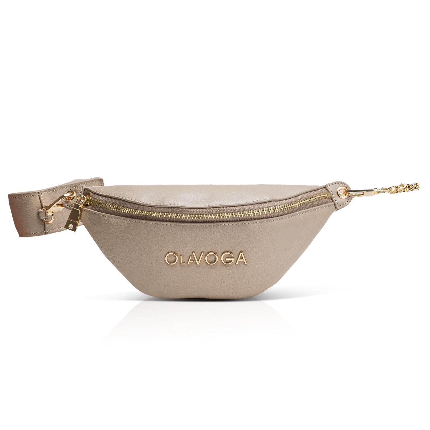 Women’s minimalist belt bag crafted from high-quality material. Features a gold OLAVOGA logo on the front, a practical zip fastening and gold-tone details. Designed with an additional decorative element and a gold chain.