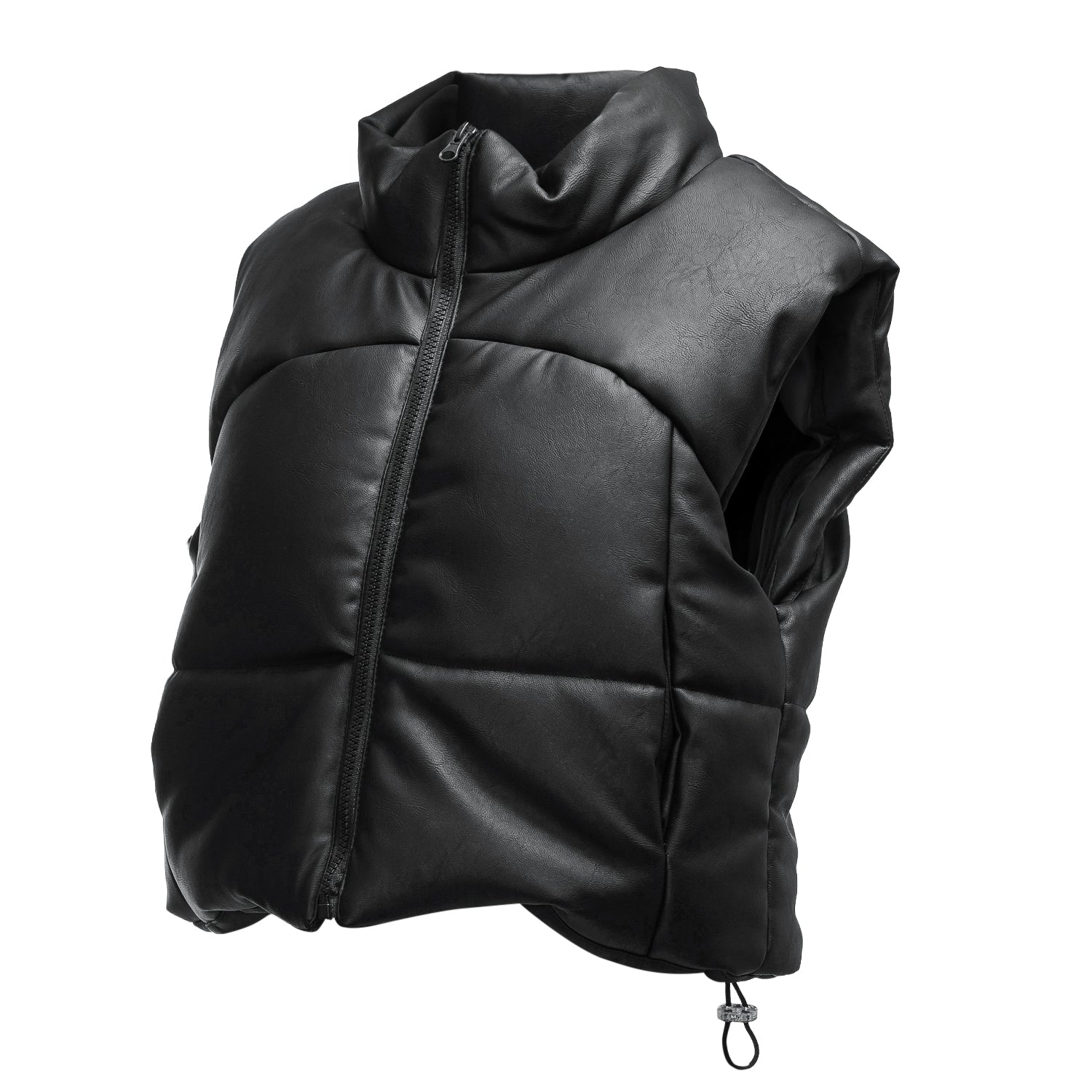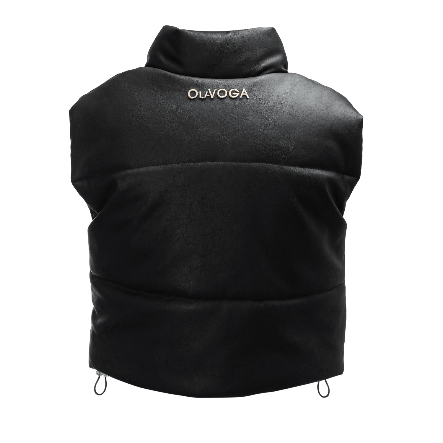 A quilted women’s gilet crafted from high-quality faux leather. This cropped design features a zip fastening and a high stand-up collar. The back is finished with a subtle embroidered OLAVOGA logo.