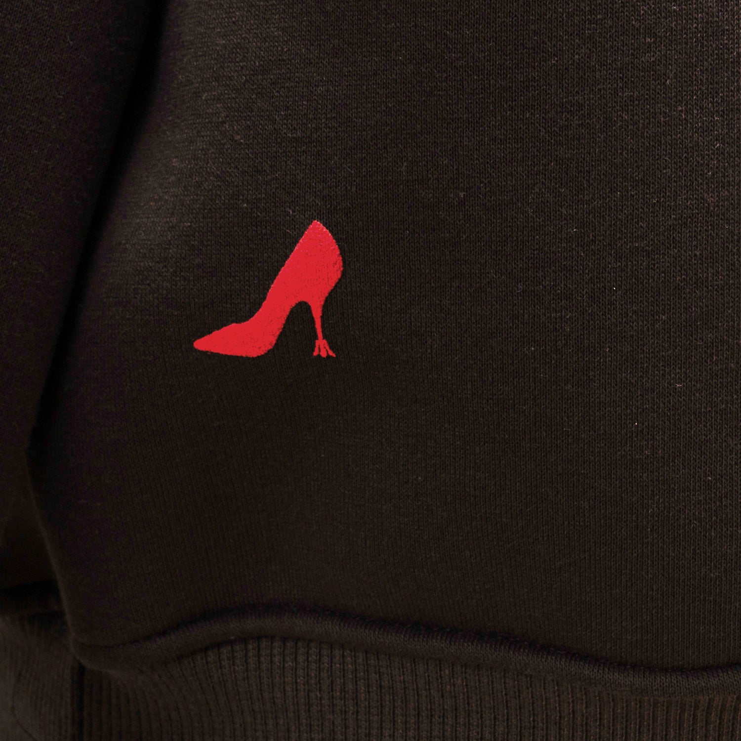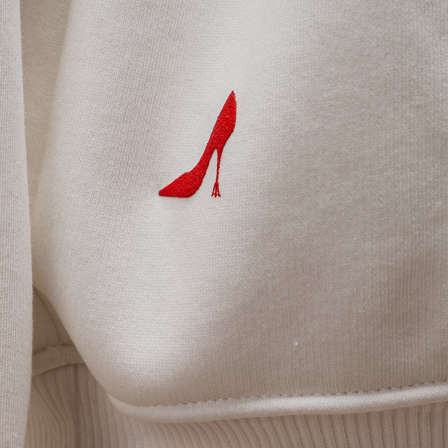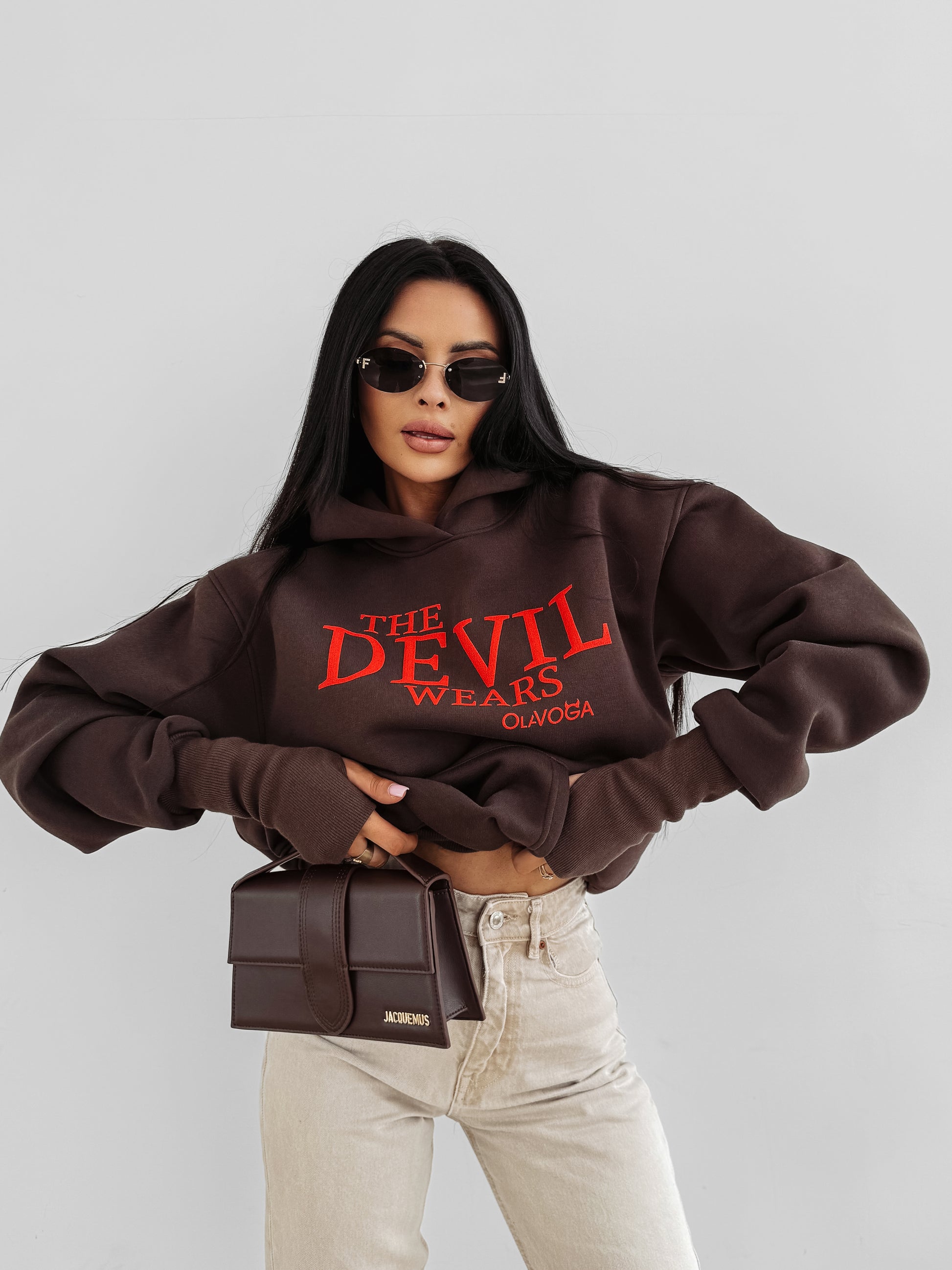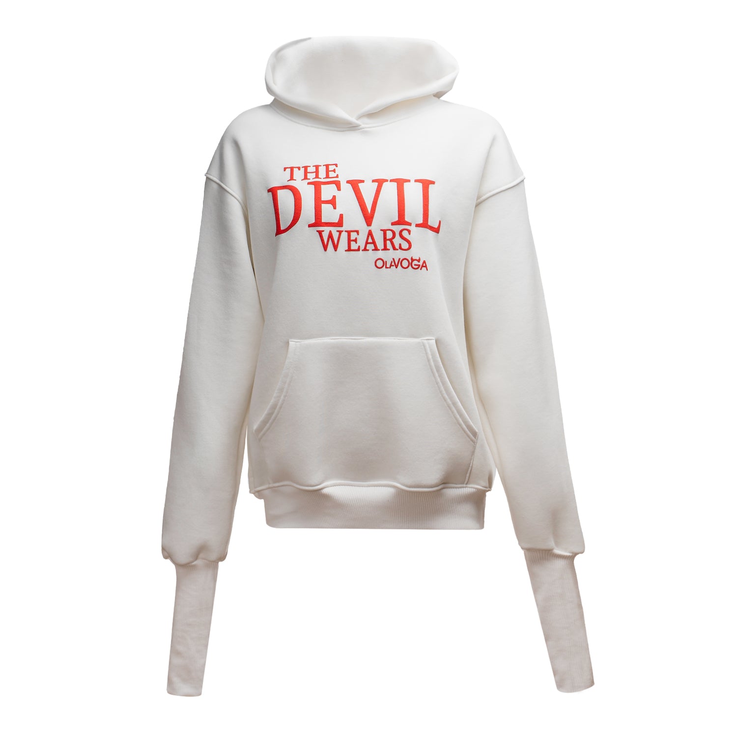 An oversized casual hoodie crafted from high-quality brushed cotton. Features a spacious front pocket and ribbed cuffs with thumbhole cut-outs. The front is decorated with a bold THE DEVIL WEARS inscription alongside a minimalist OLAVOGA logo, while the back carries a subtle shoe graphic.