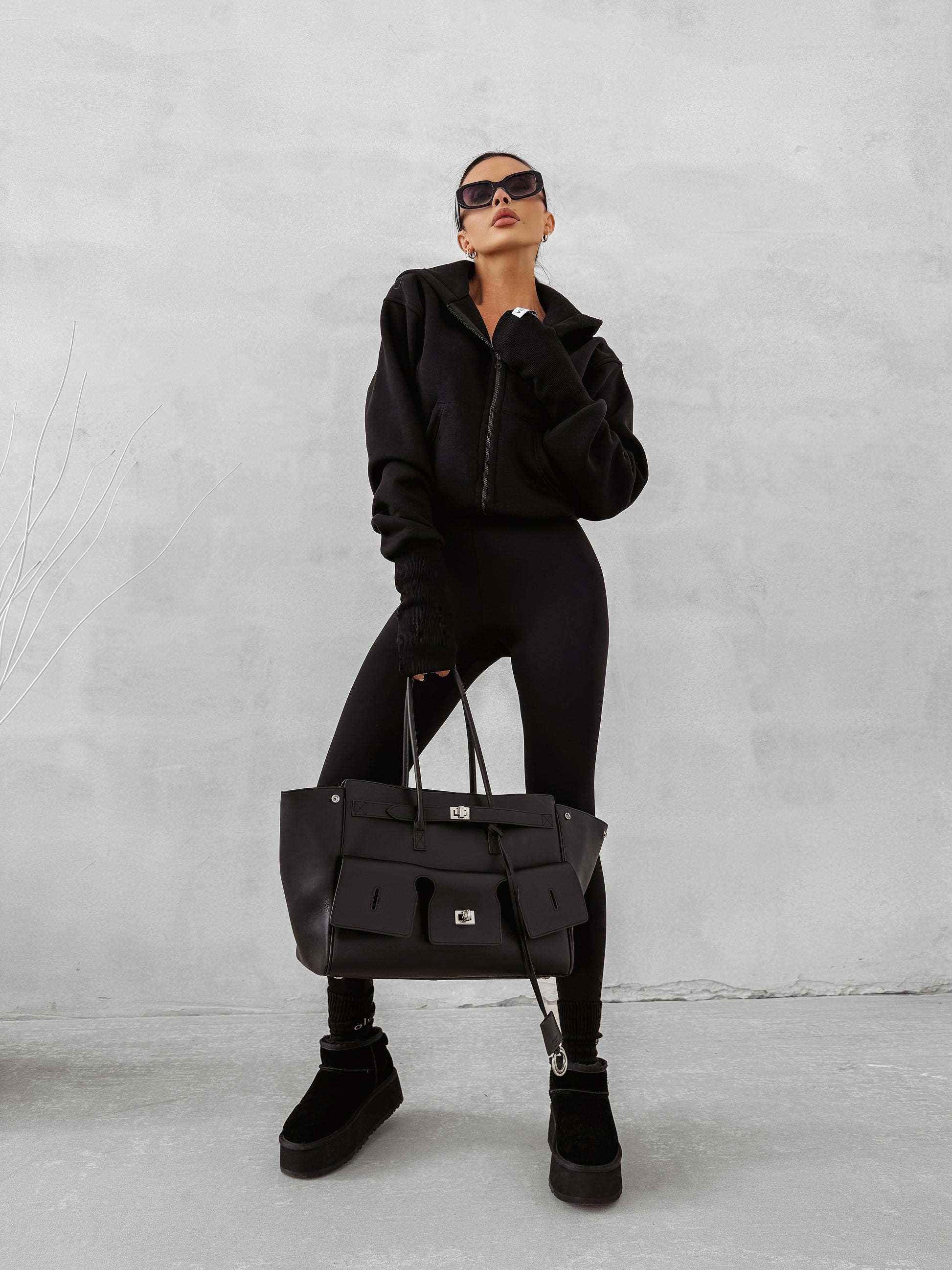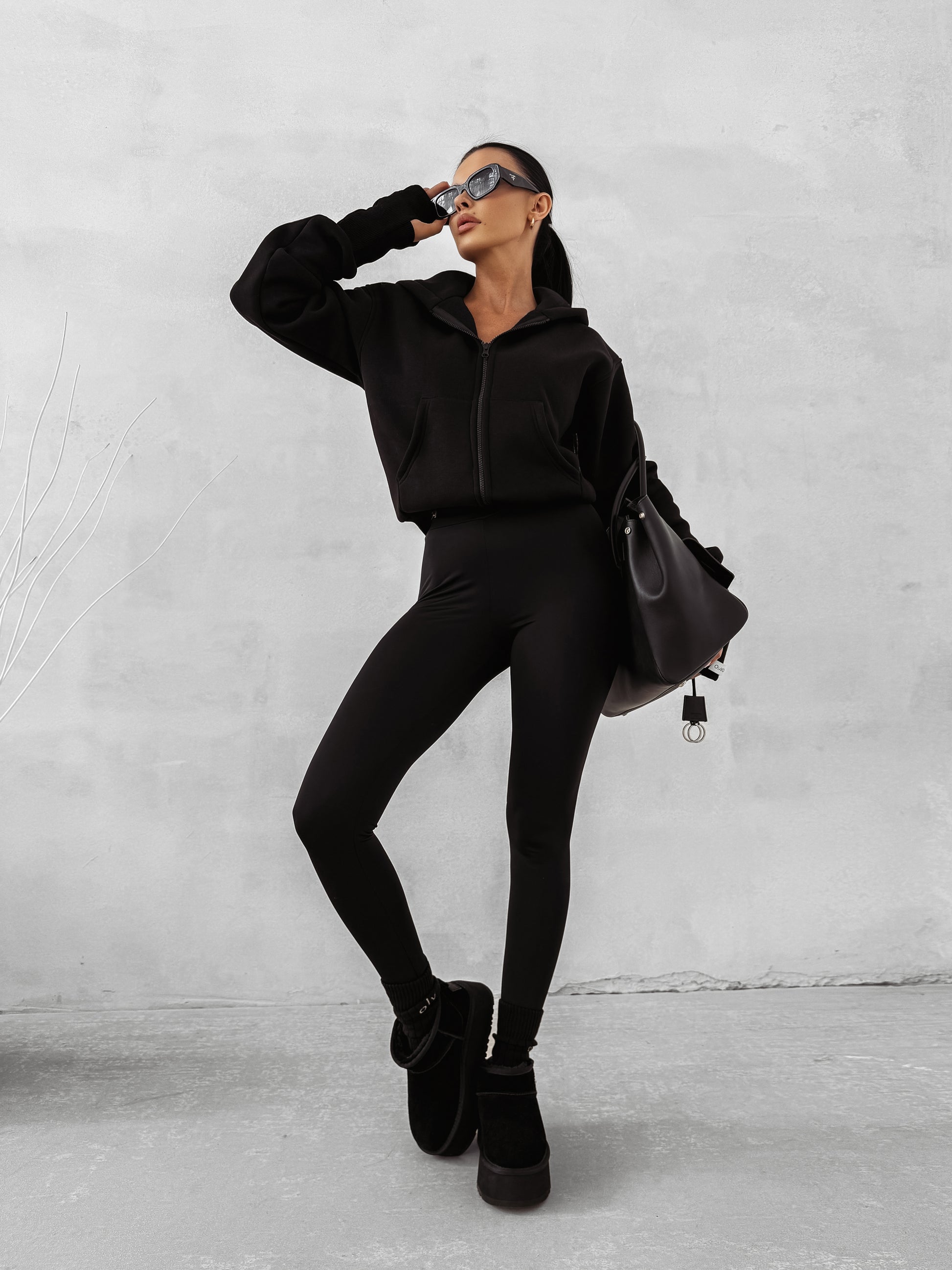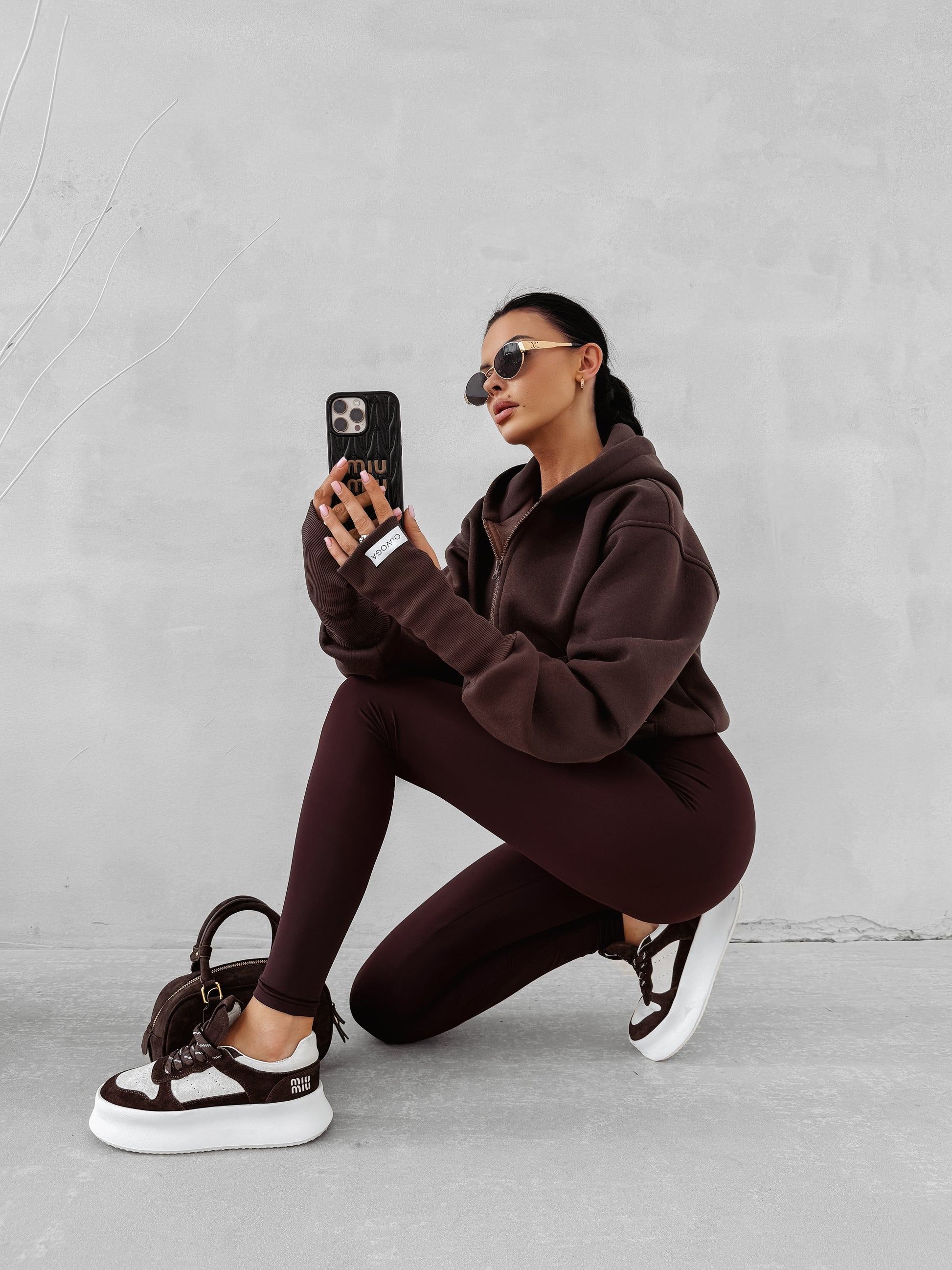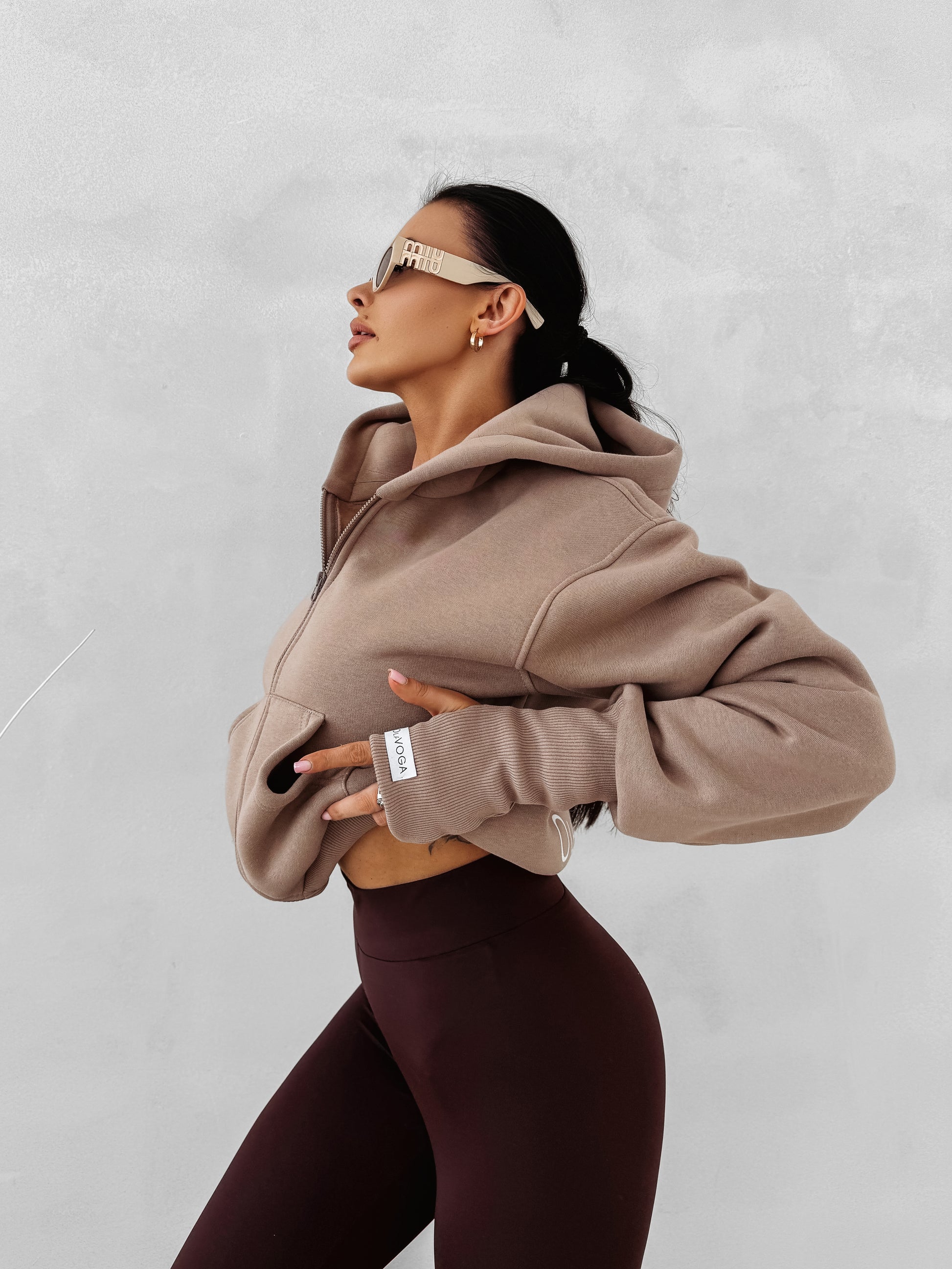 A cropped zip-up hoodie with a hood, crafted from high-quality warm cotton. Features practical kangaroo-style pockets and wide ribbed cuffs with thumbhole cut-outs. The back is finished with a bold contrasting OLAVOGA logo, while a branded label details the sleeve.