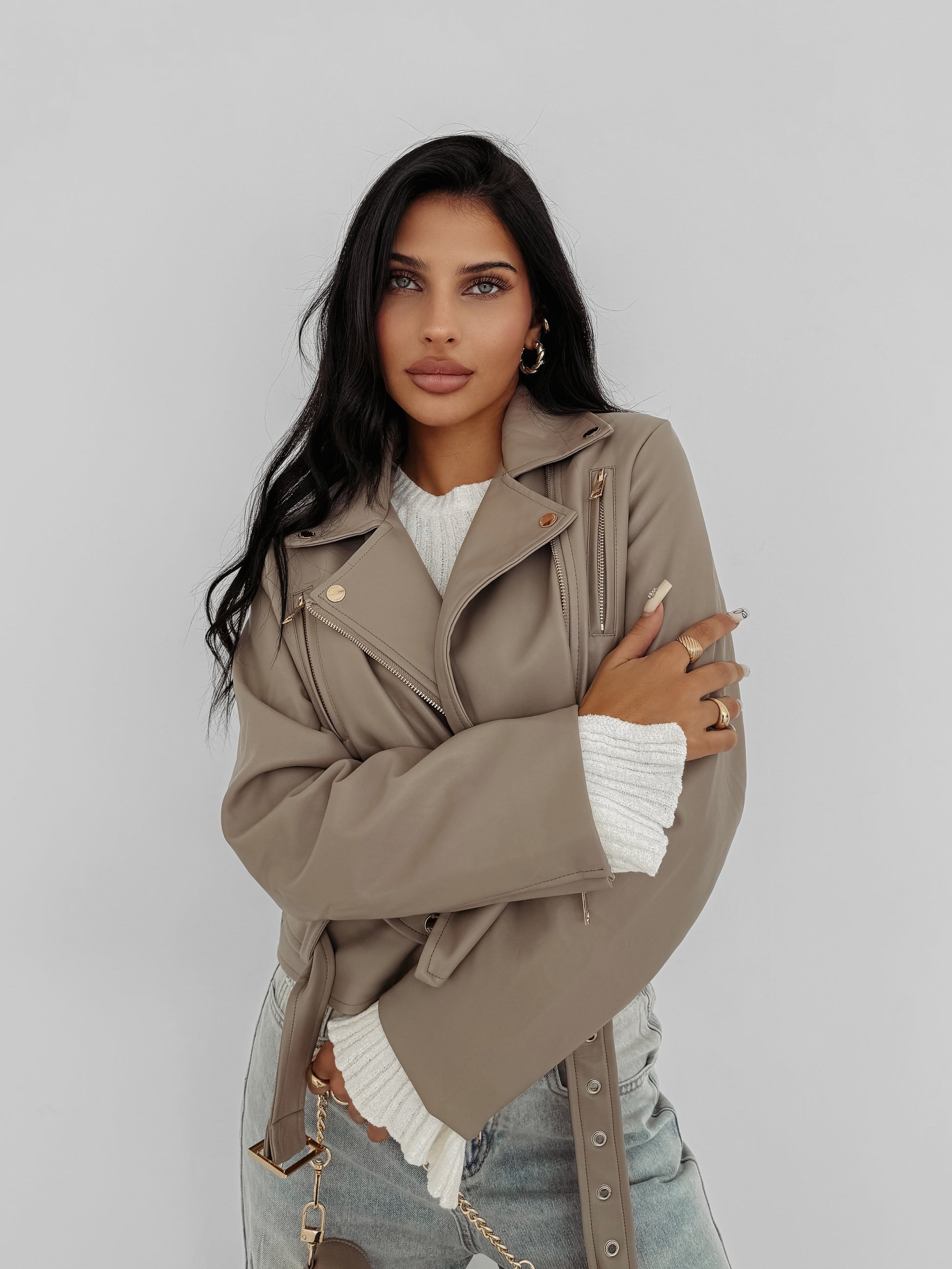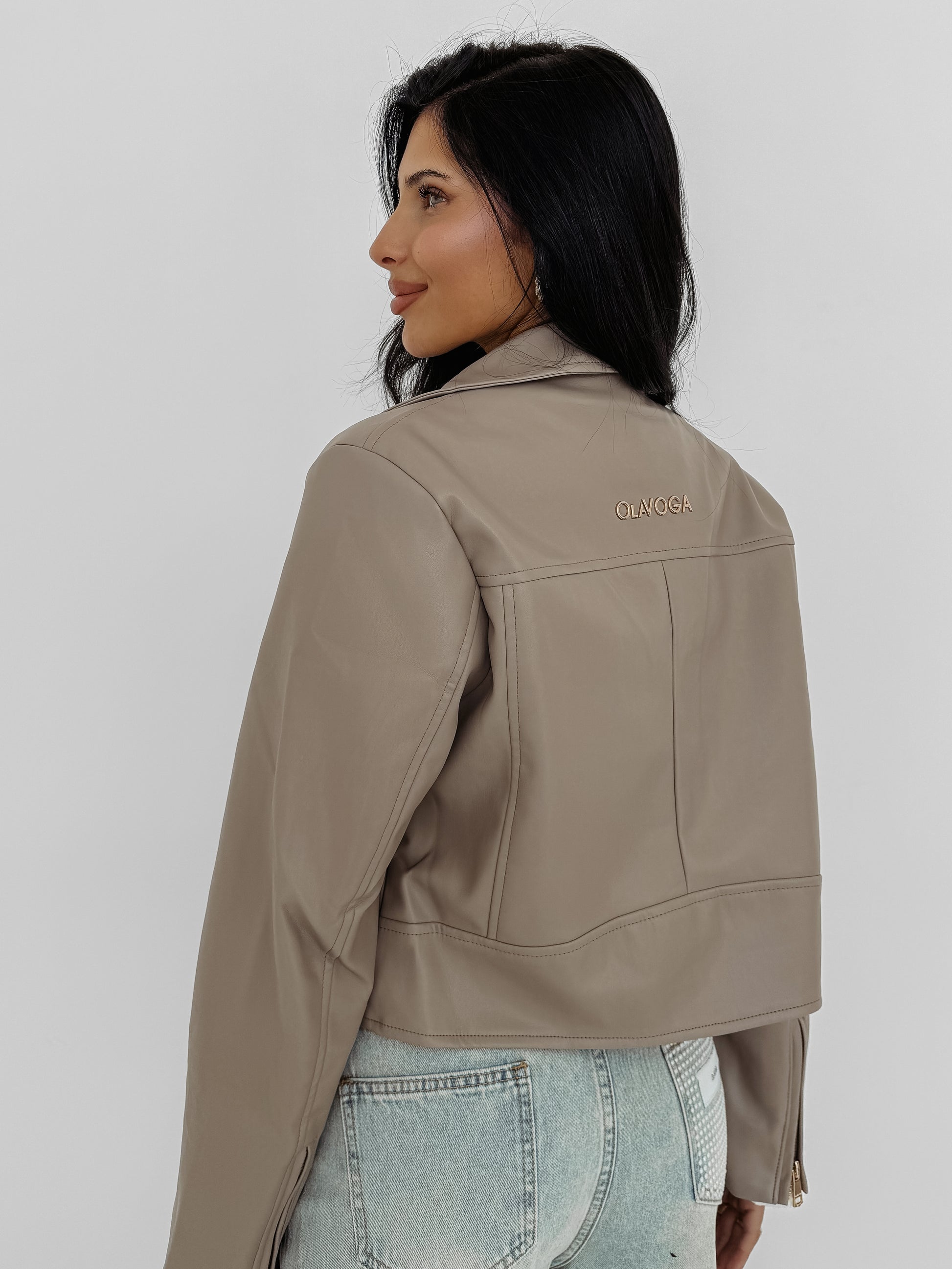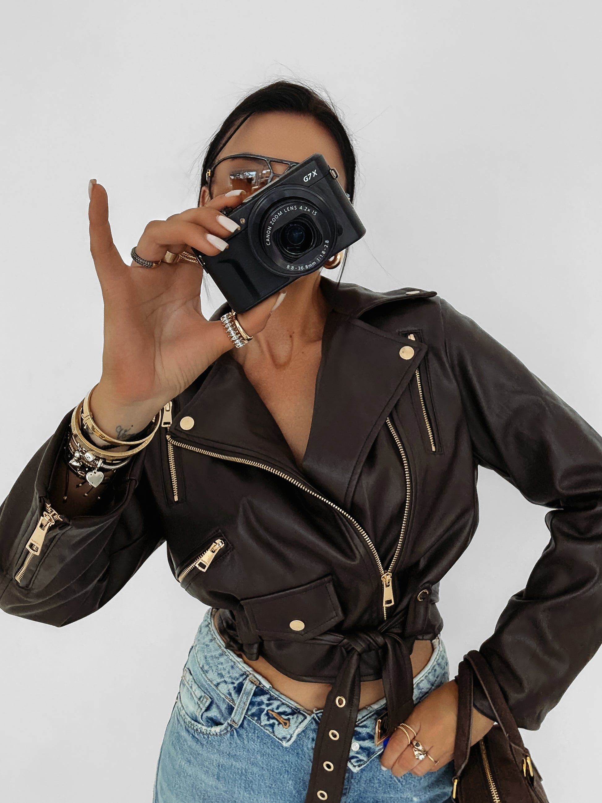 Women’s biker jacket with a classic rock-inspired design. Crafted from smooth faux leather and detailed with gold-tone zips. Features a waist belt with buckle, zipped pockets and a gold OLAVOGA logo on the back.
