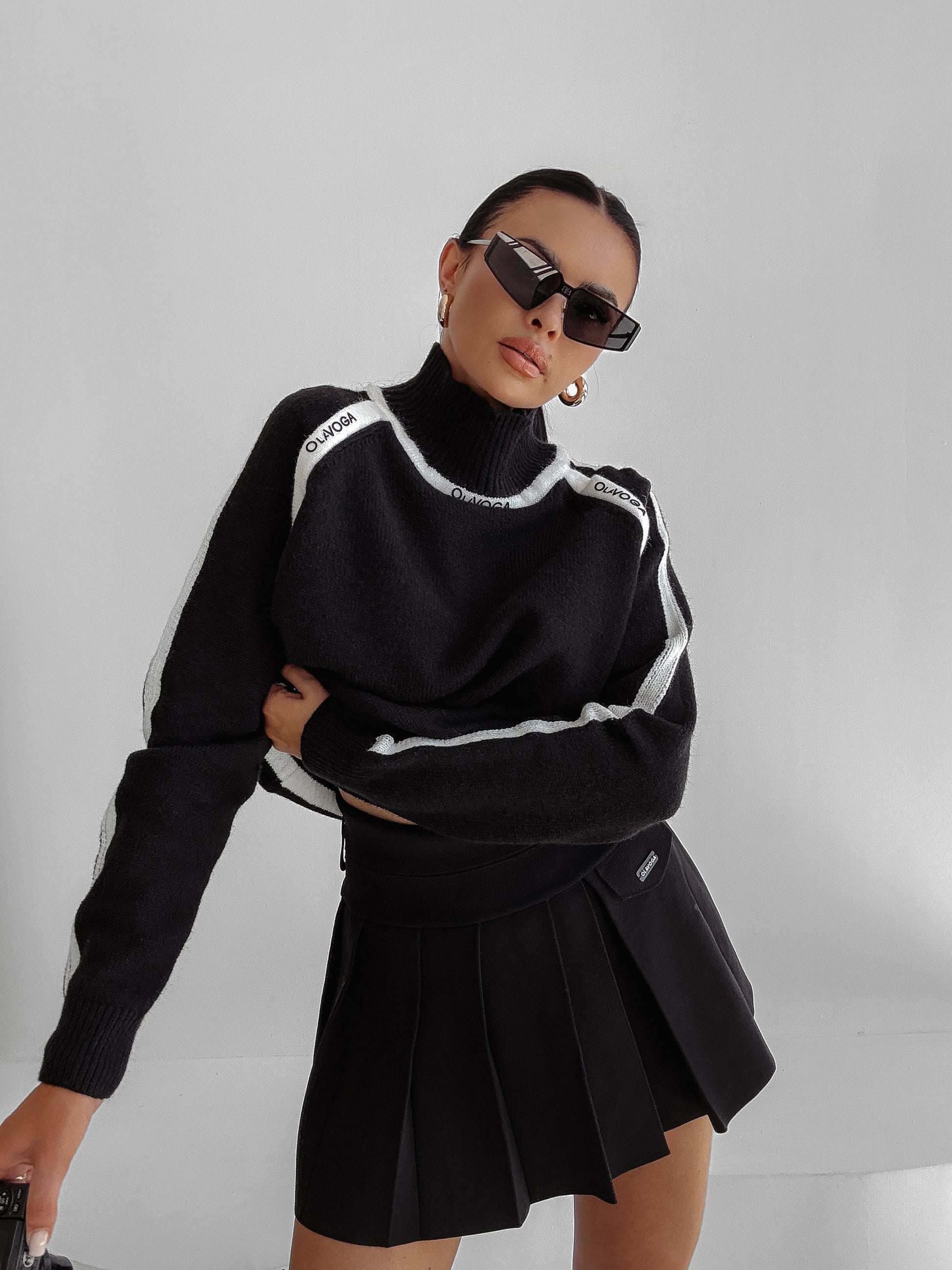 Women’s casual turtleneck jumper with an extended length. Made from high-quality soft knit. Finished with contrasting OLAVOGA logo trims along the shoulders and neckline. Loose fit with slightly dropped shoulders.