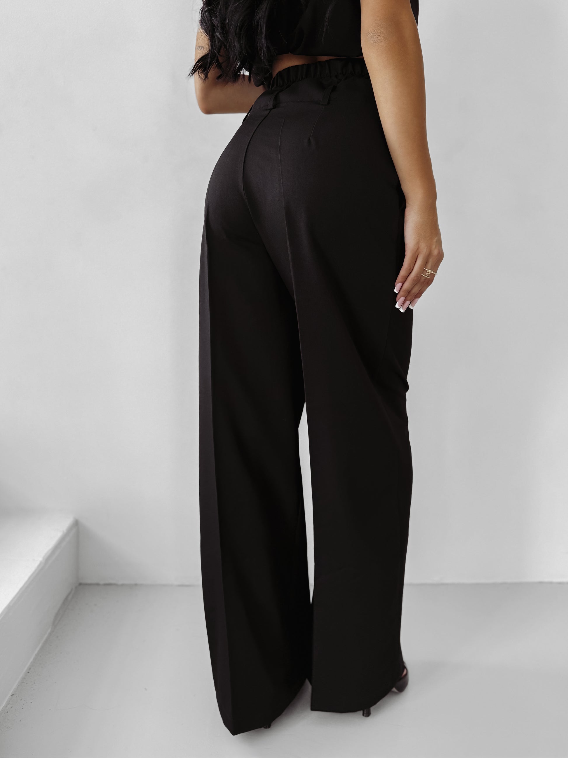Bottom – tailored trousers with wide legs, elastic waistband and side pockets. Finished with a minimalist branded patch on the front.