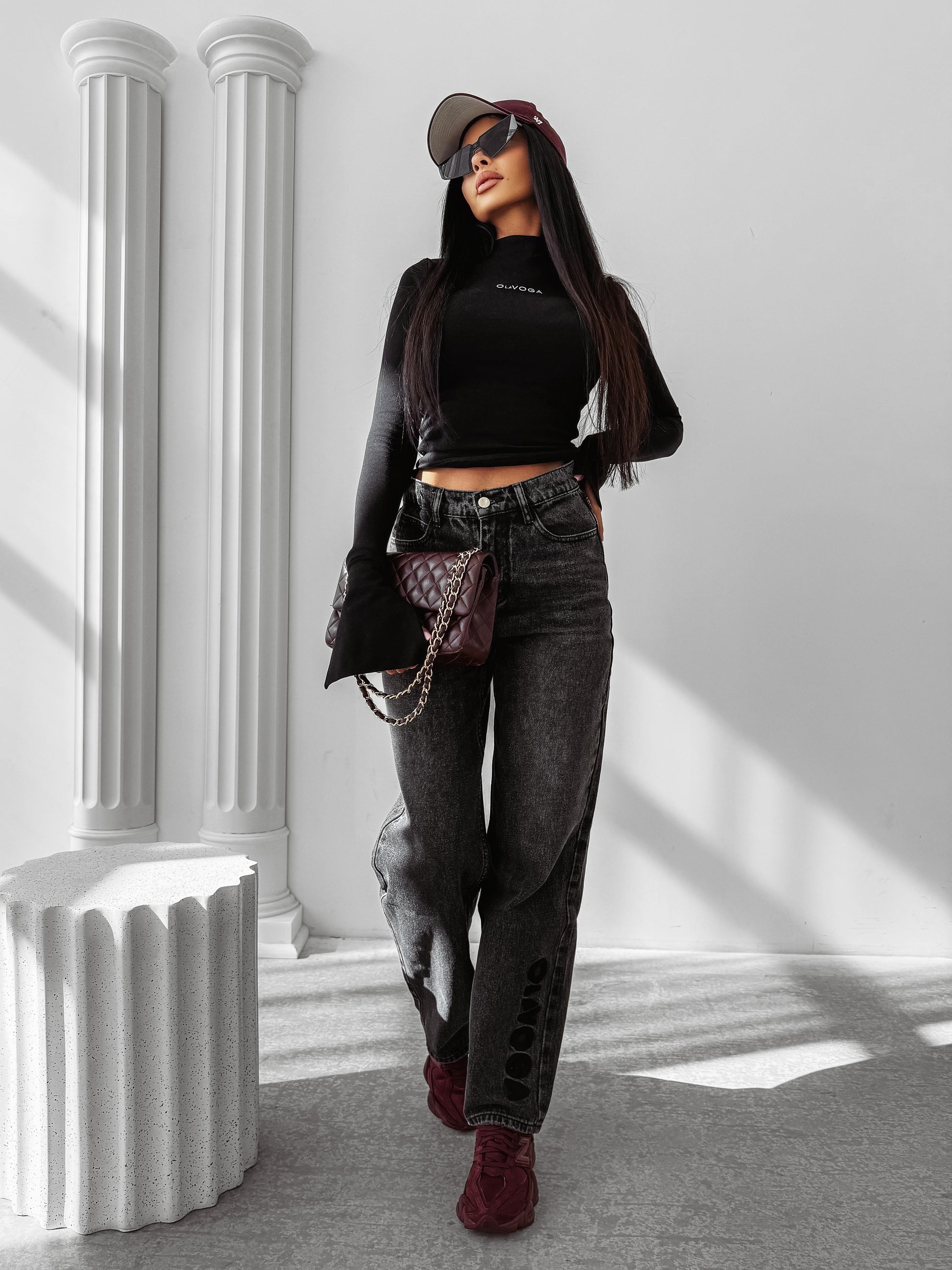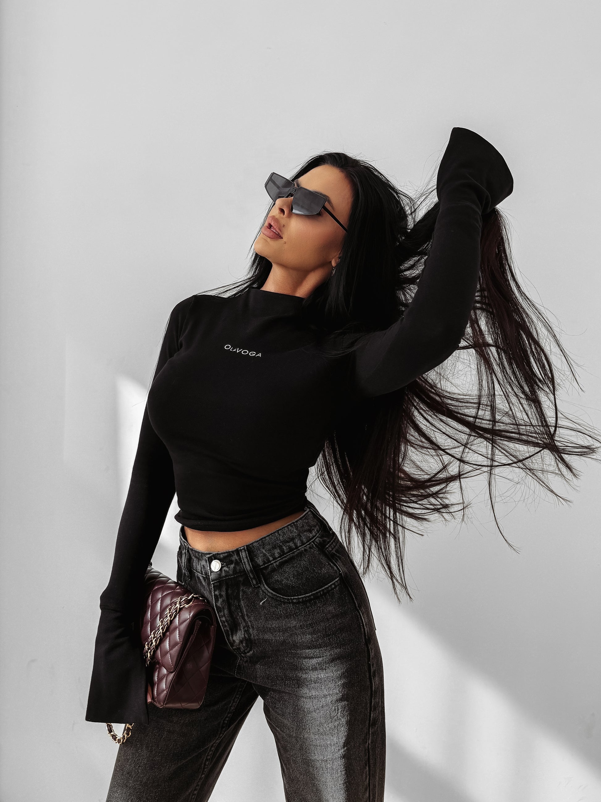 A fitted turtleneck top with long sleeves in a cropped cut. Crafted from high-quality stretch cotton. The front features a contrasting OLAVOGA logo. The sleeves are finished with small slits and a subtle flare towards the cuffs.