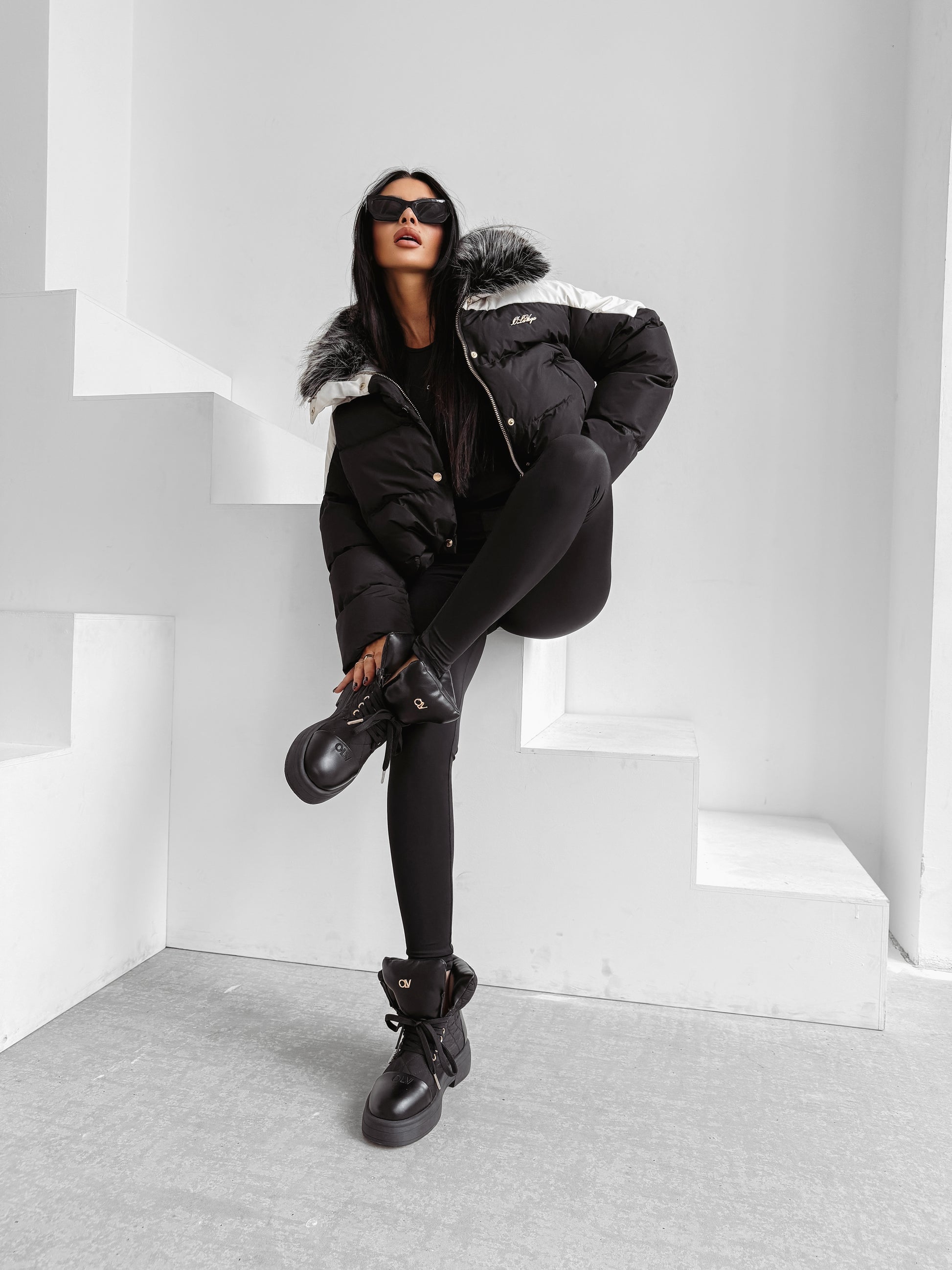 A short, puffer-style jacket designed in a striking two-tone colour combination. Crafted from premium-quality fabric, it features a high collar and a hood finished with soft, luxurious faux fur. Adorned with a gold, jewellery-style OLAVOGA emblem at the front for a sophisticated touch. Fastened with a zip and press studs, with practical side pockets for everyday comfort and style.