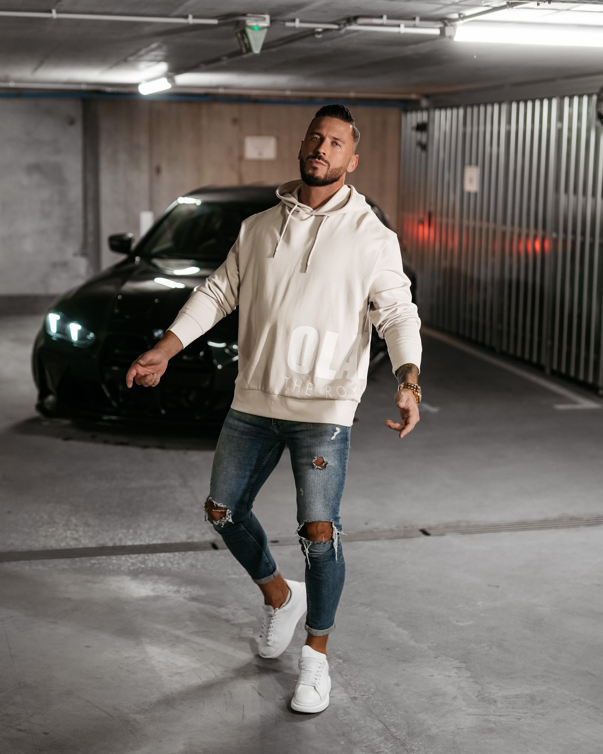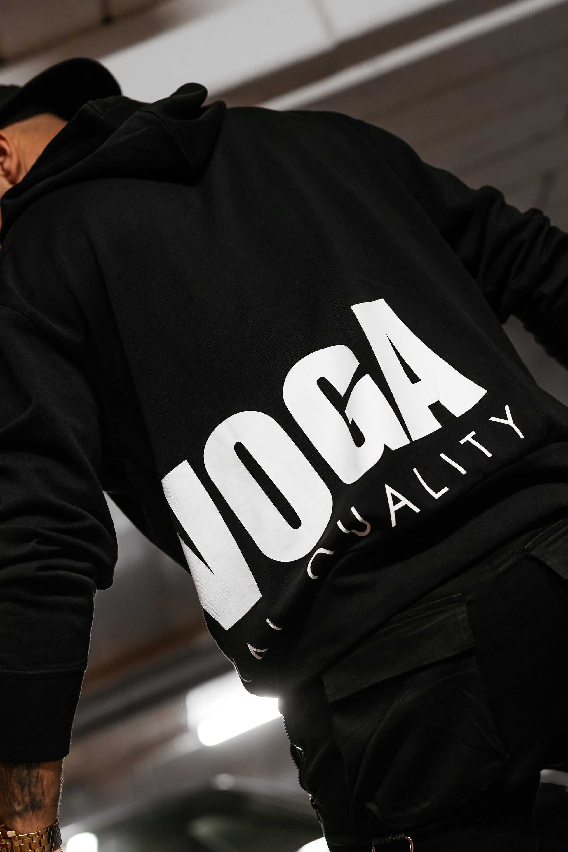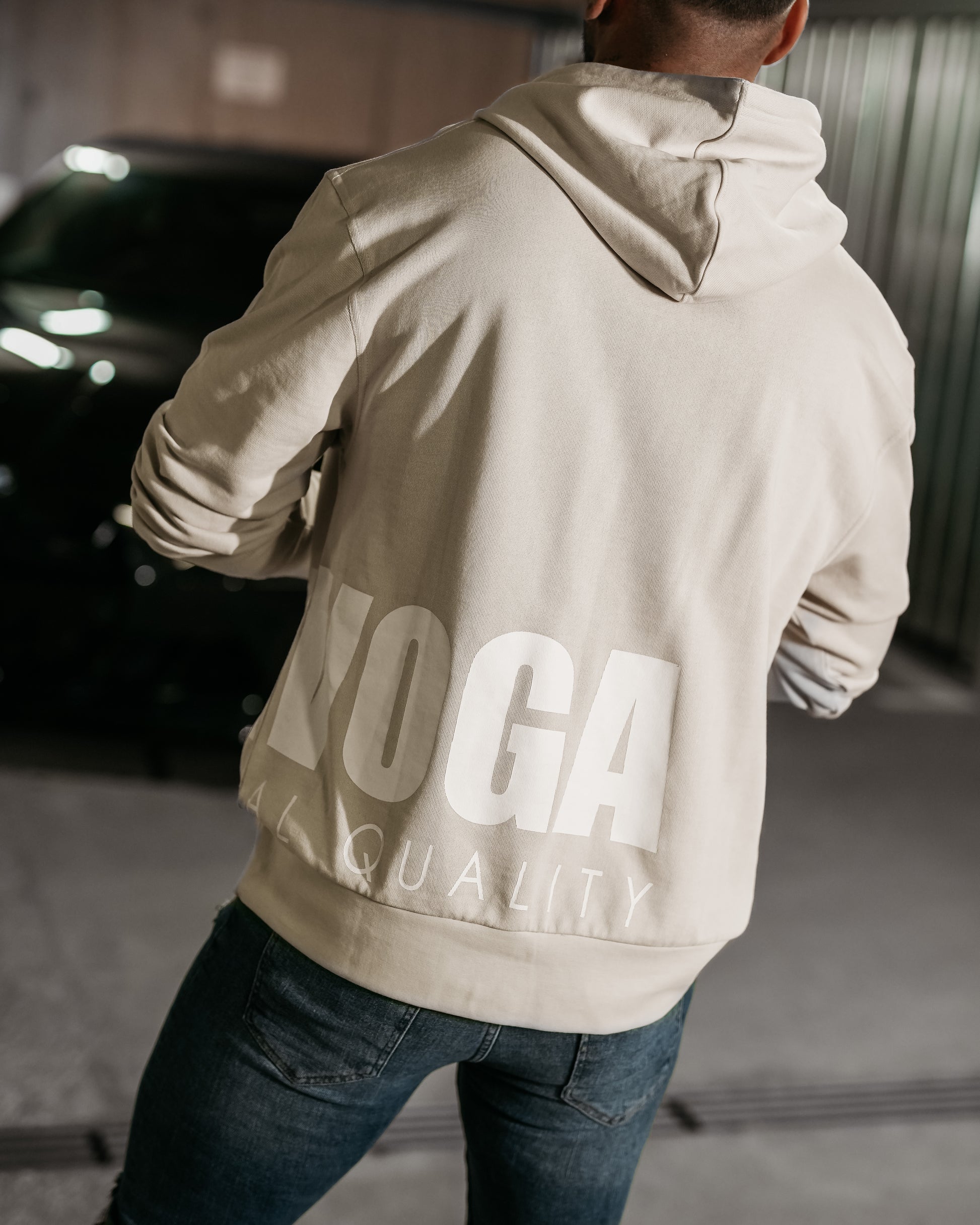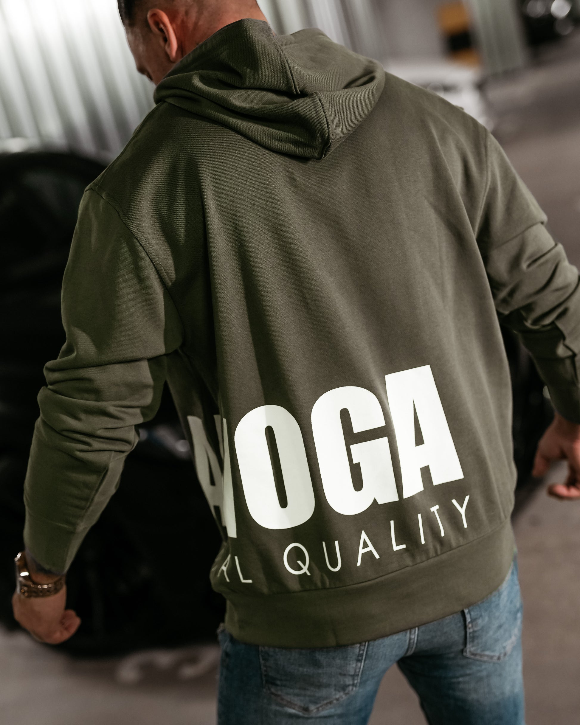 A casual menโs hoodie made from 100% high-quality cotton. Designed with a spacious adjustable hood for comfort. The front and back are decorated with a bold OLAVOGA print and the statement THE ROYAL QUALITY, giving the piece a distinctive, premium look.