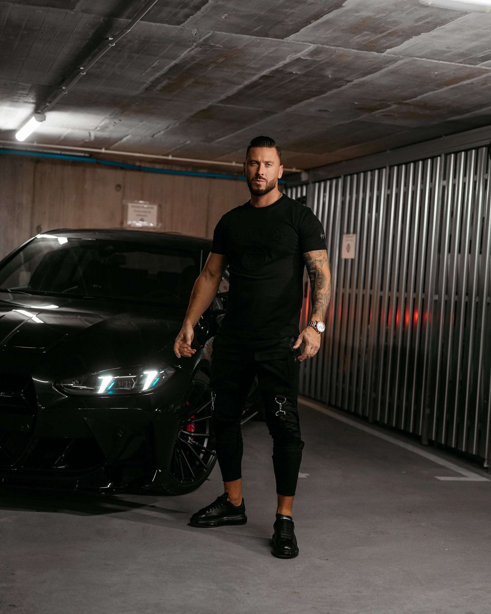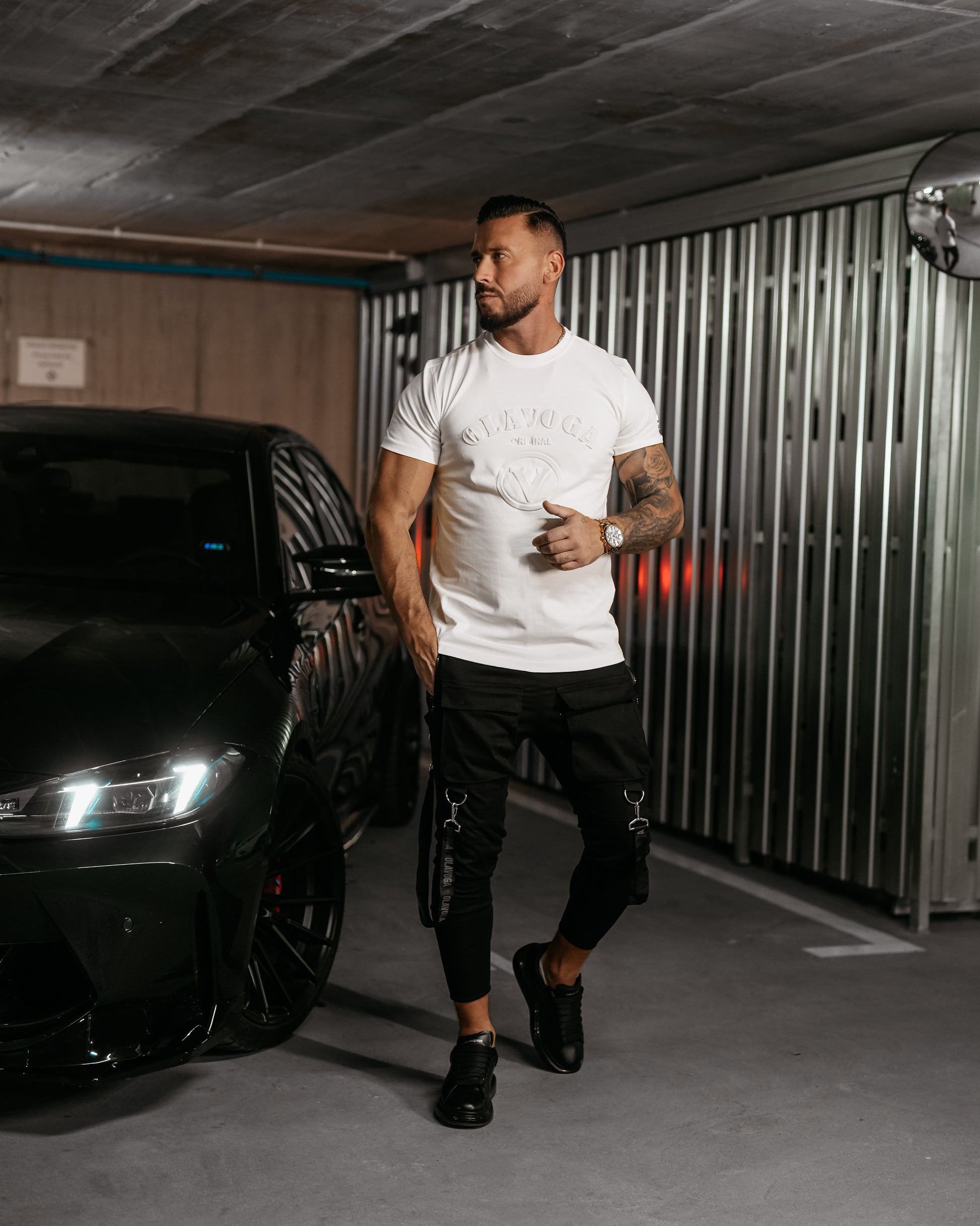 A casual menโs short-sleeve T-shirt made from 100% high-quality cotton. The front features an embossed OLAVOGA ORIGINAL logo and a bold V-shaped emblem, while the sleeve is finished with a subtle golden brand application.