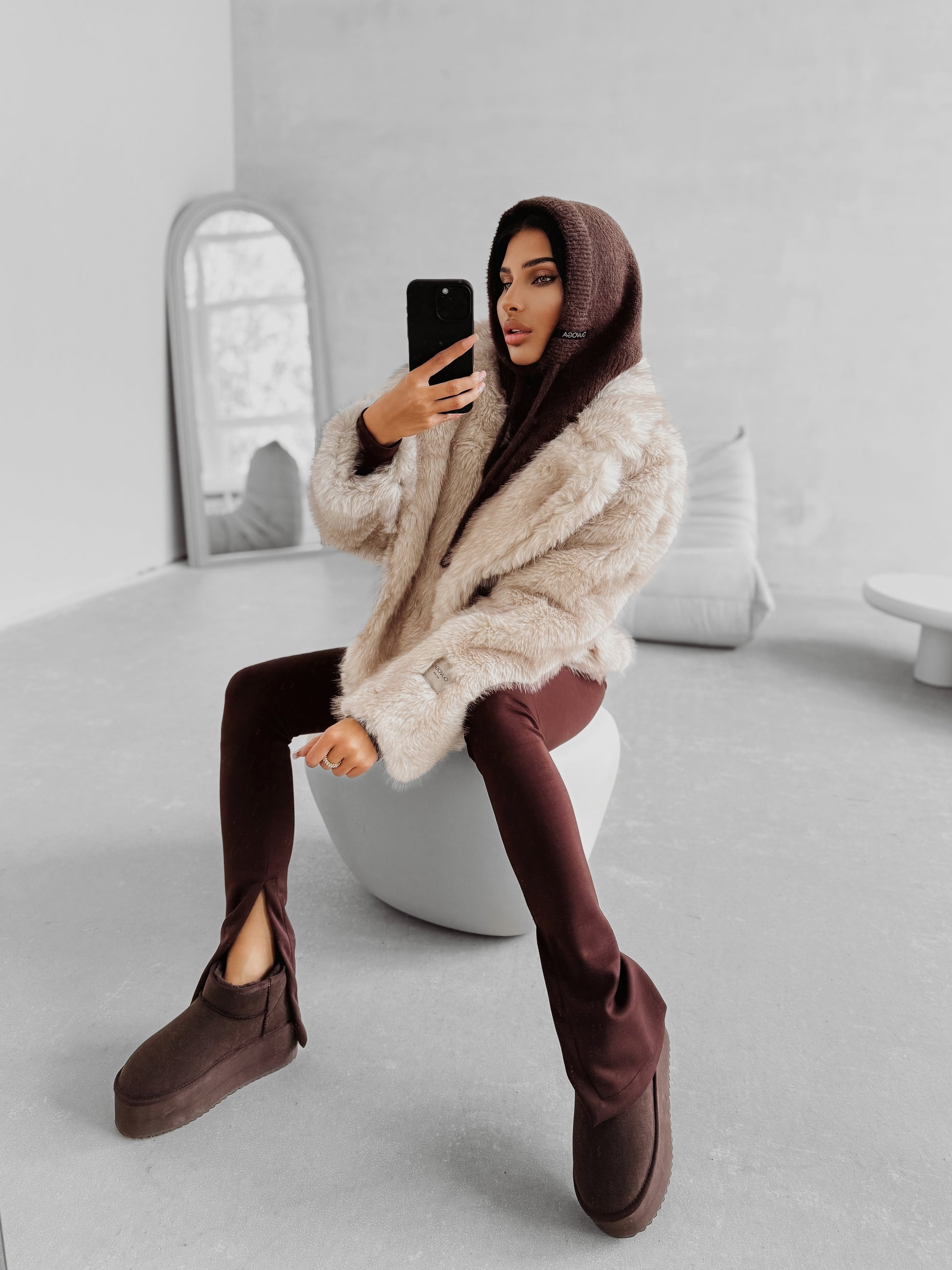 A refined women’s balaclava crafted from a soft, densely knitted fabric that feels smooth and comfortable against the skin. The fitted design adapts perfectly to the shape of the head, while the extended cut with adjustable ties under the chin provides extra warmth and protection. Finished with a subtle branded patch that emphasises the minimalist yet luxurious character of the piece.