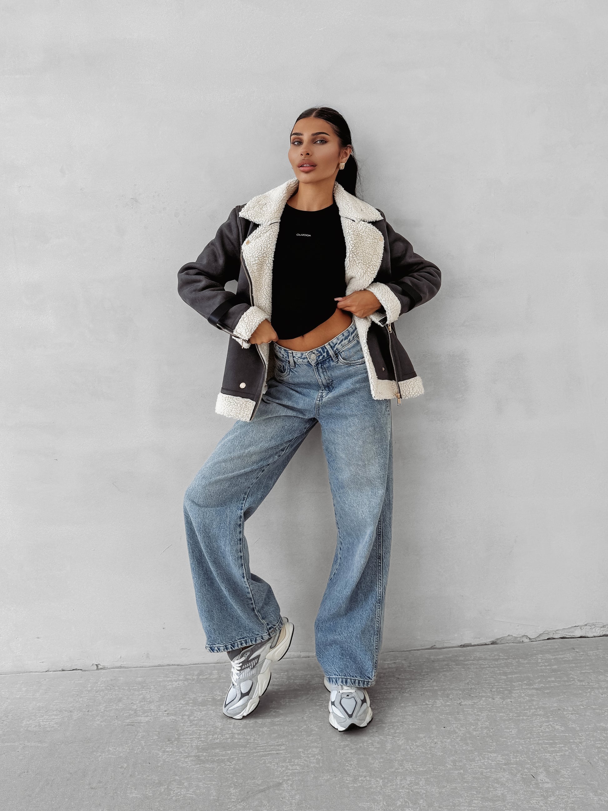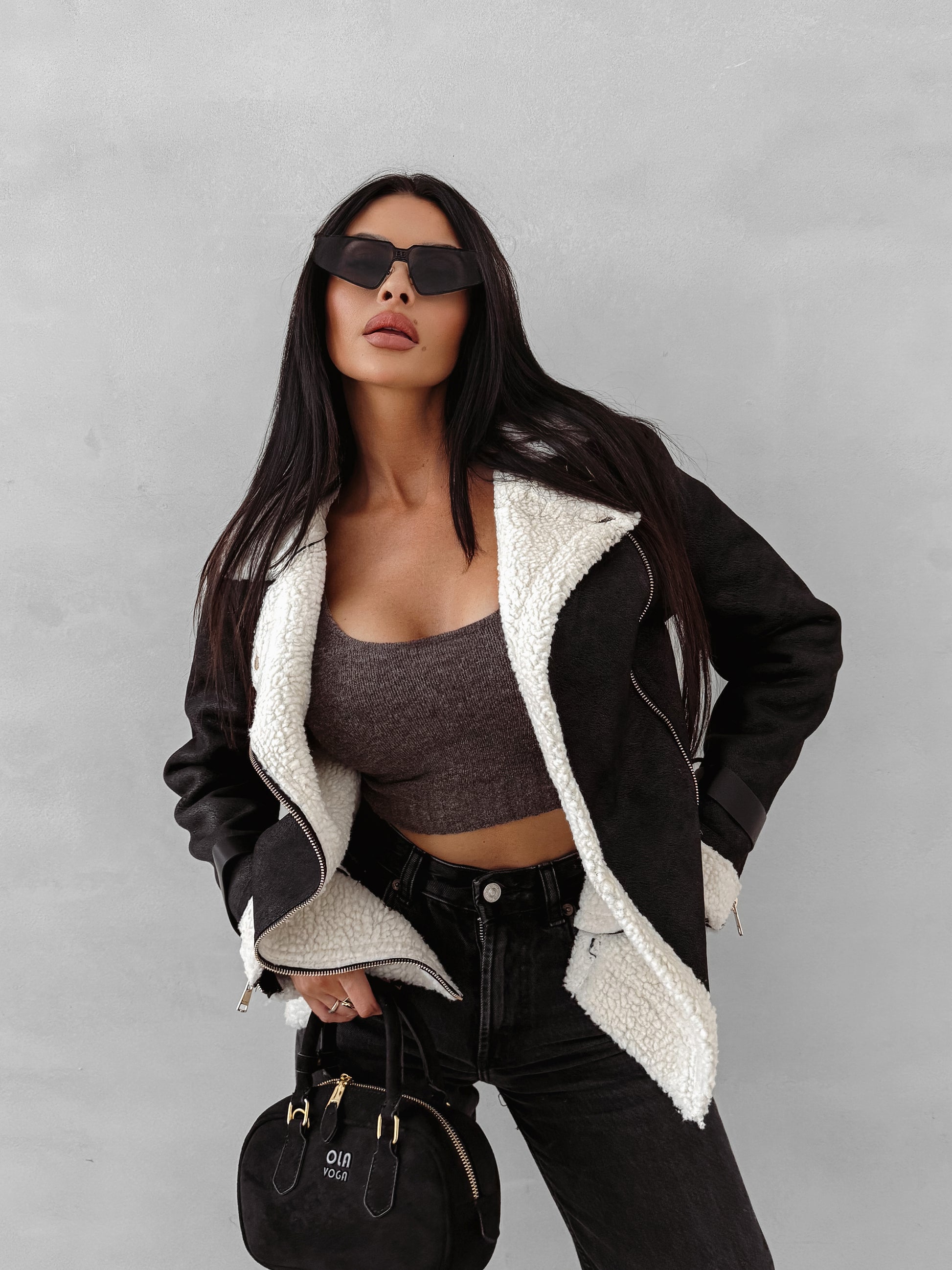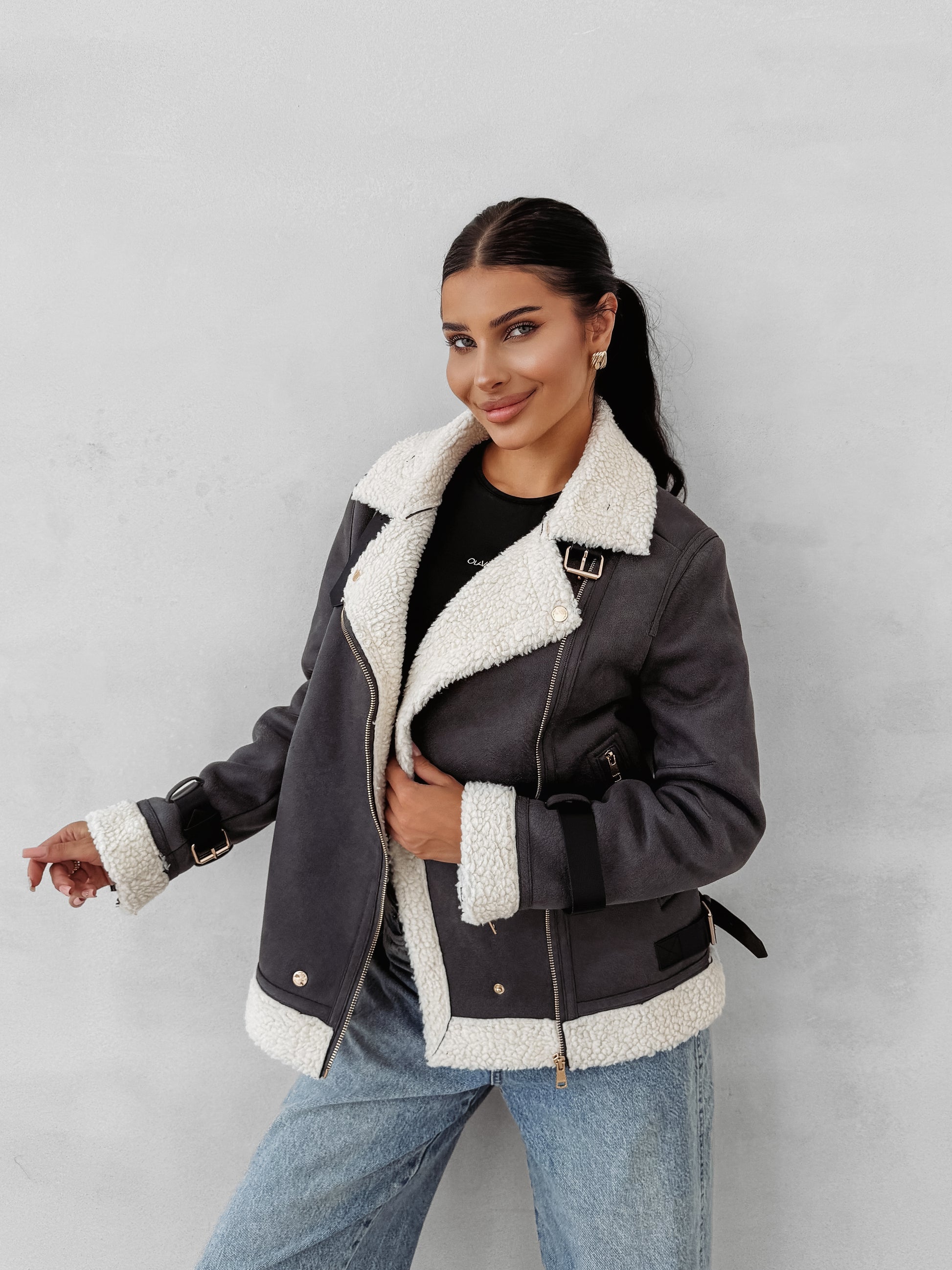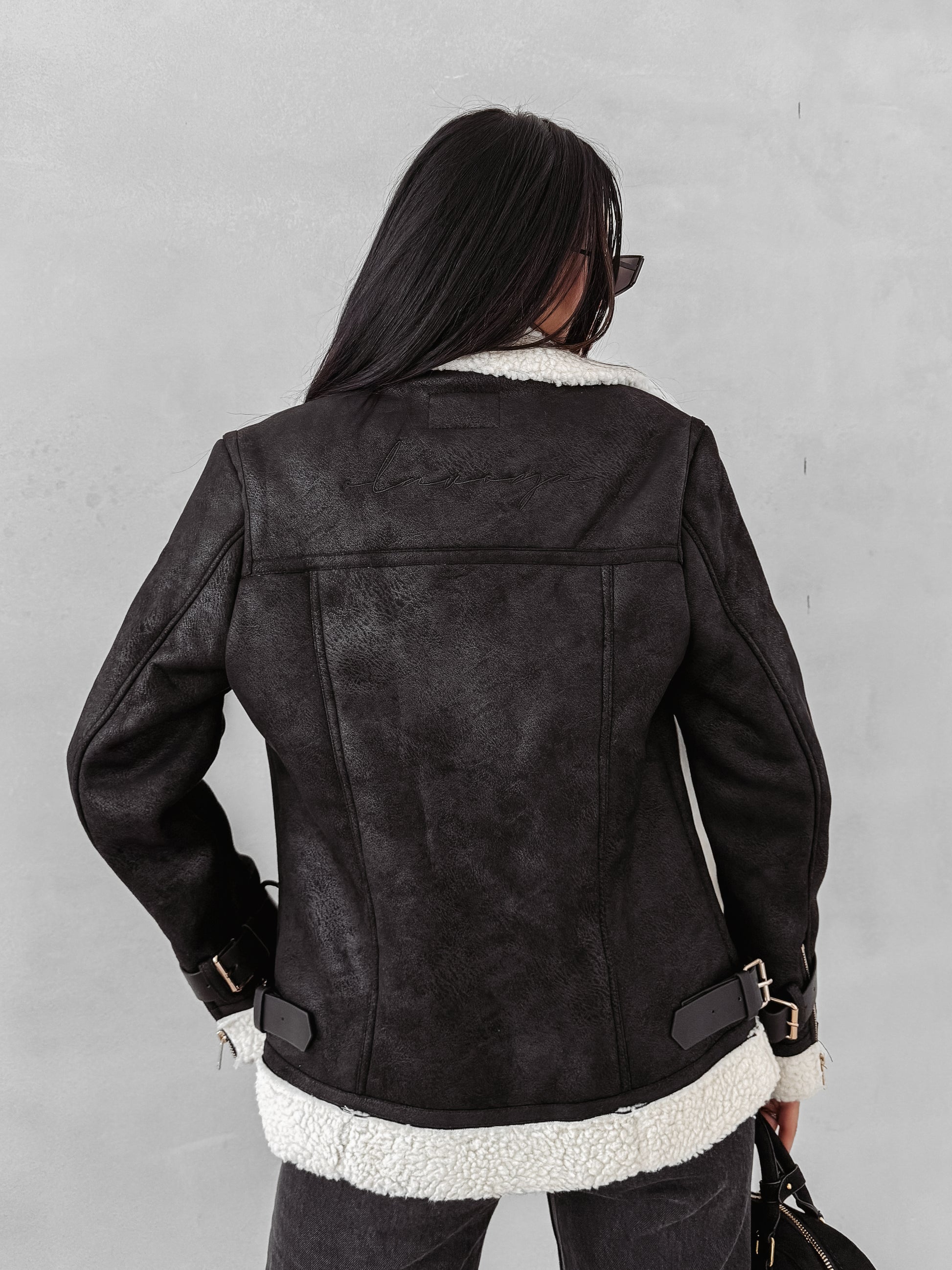 A timeless aviator-style women’s jacket crafted from premium faux suede, finished with a warm and soft shearling-style lining. Designed with a wide collar and zip fastening for a classic look with a modern twist. Decorative gold-tone buckle straps on the sleeves and hem add a statement edge. The back features an embossed OLAVOGA logo in a tone matching the fabric, highlighting its refined character.