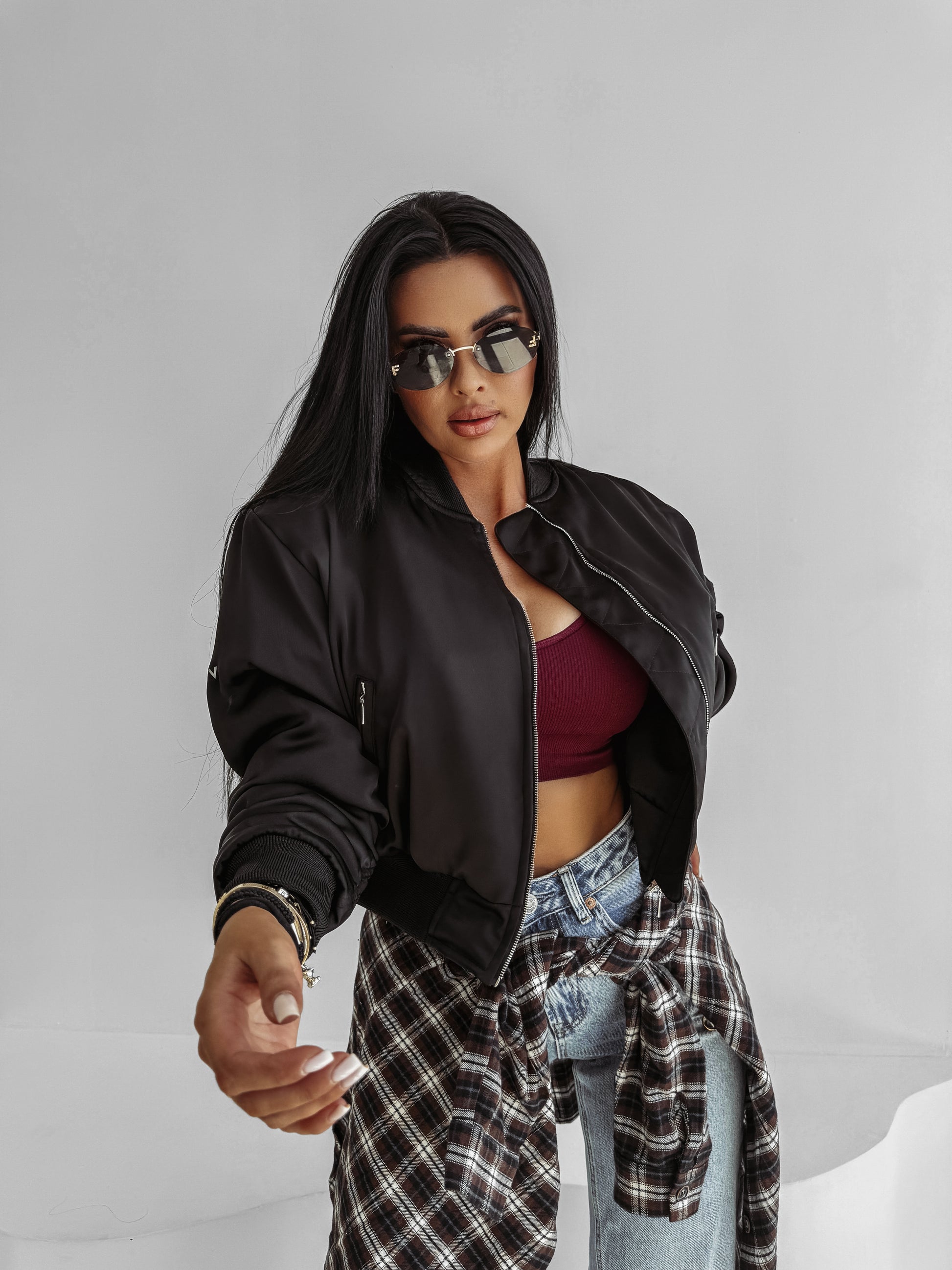 A cropped bomber jacket crafted from glossy, high-quality fabric.