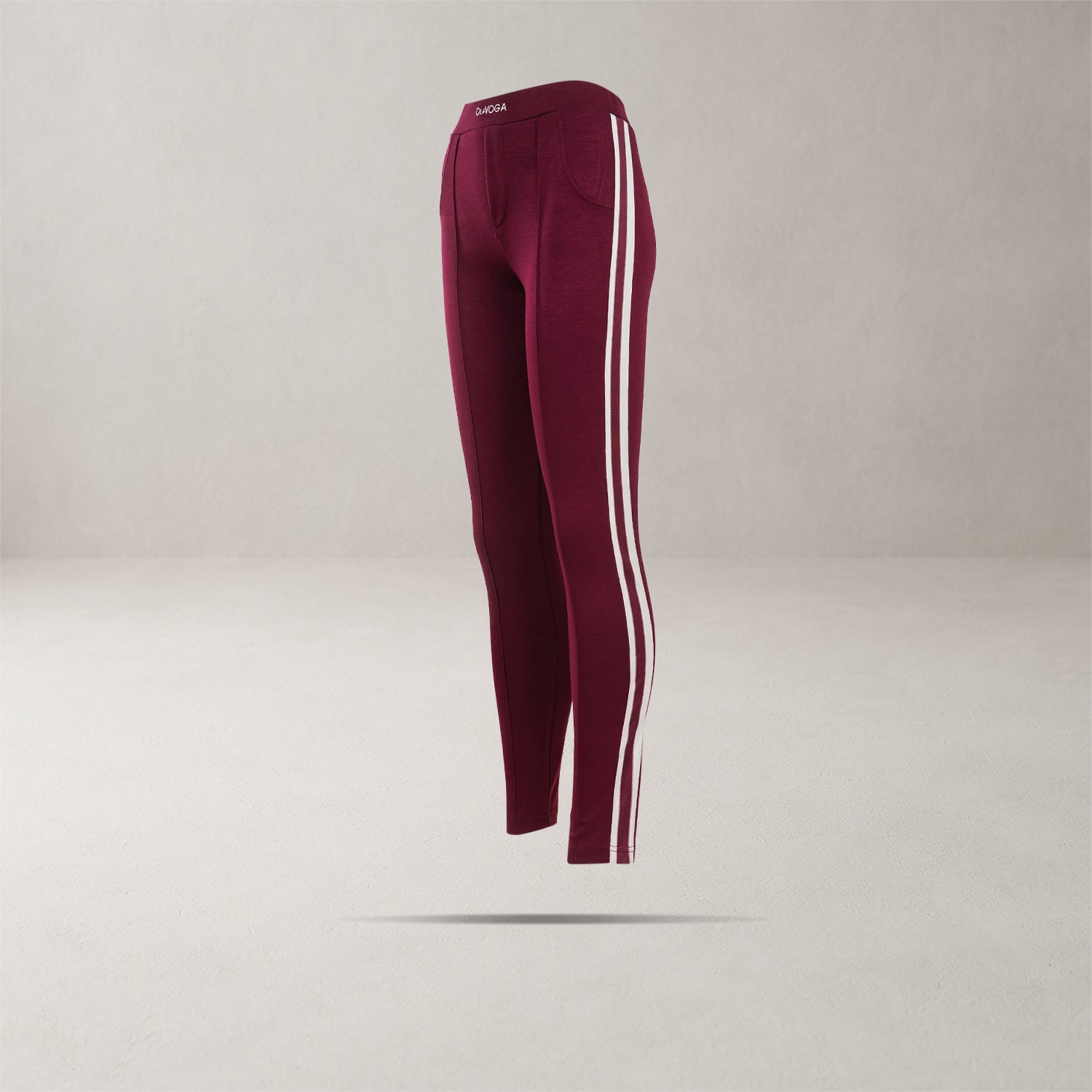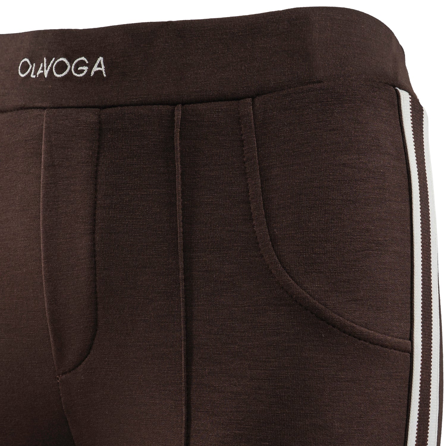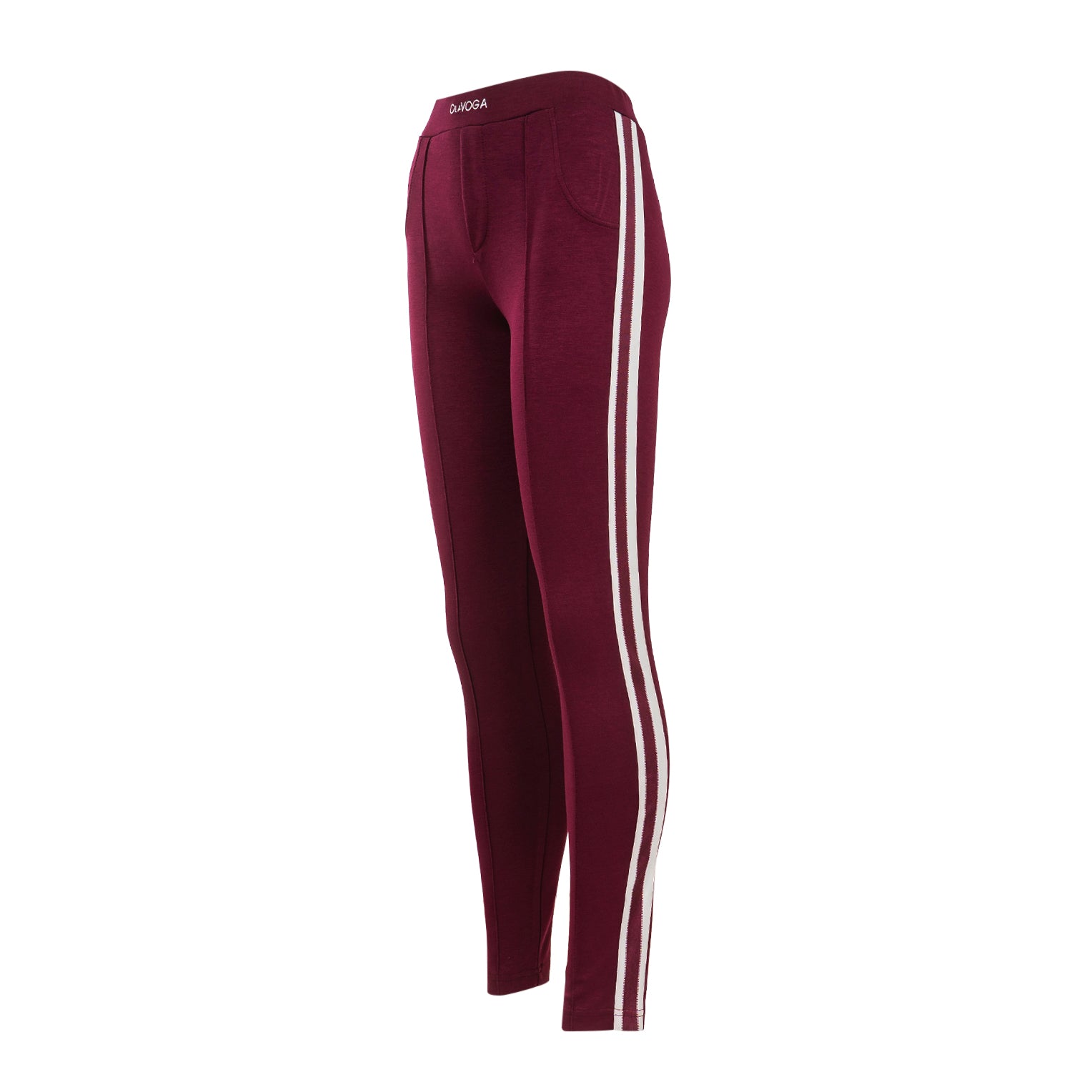 Fitted high-waisted leggings-style trousers made from premium, stretchy fabric that provides both comfort and a flattering silhouette. Feature contrasting side stripes, decorative stitching, and a subtle embroidered OLAVOGA logo on the waistband for an elegant finish.