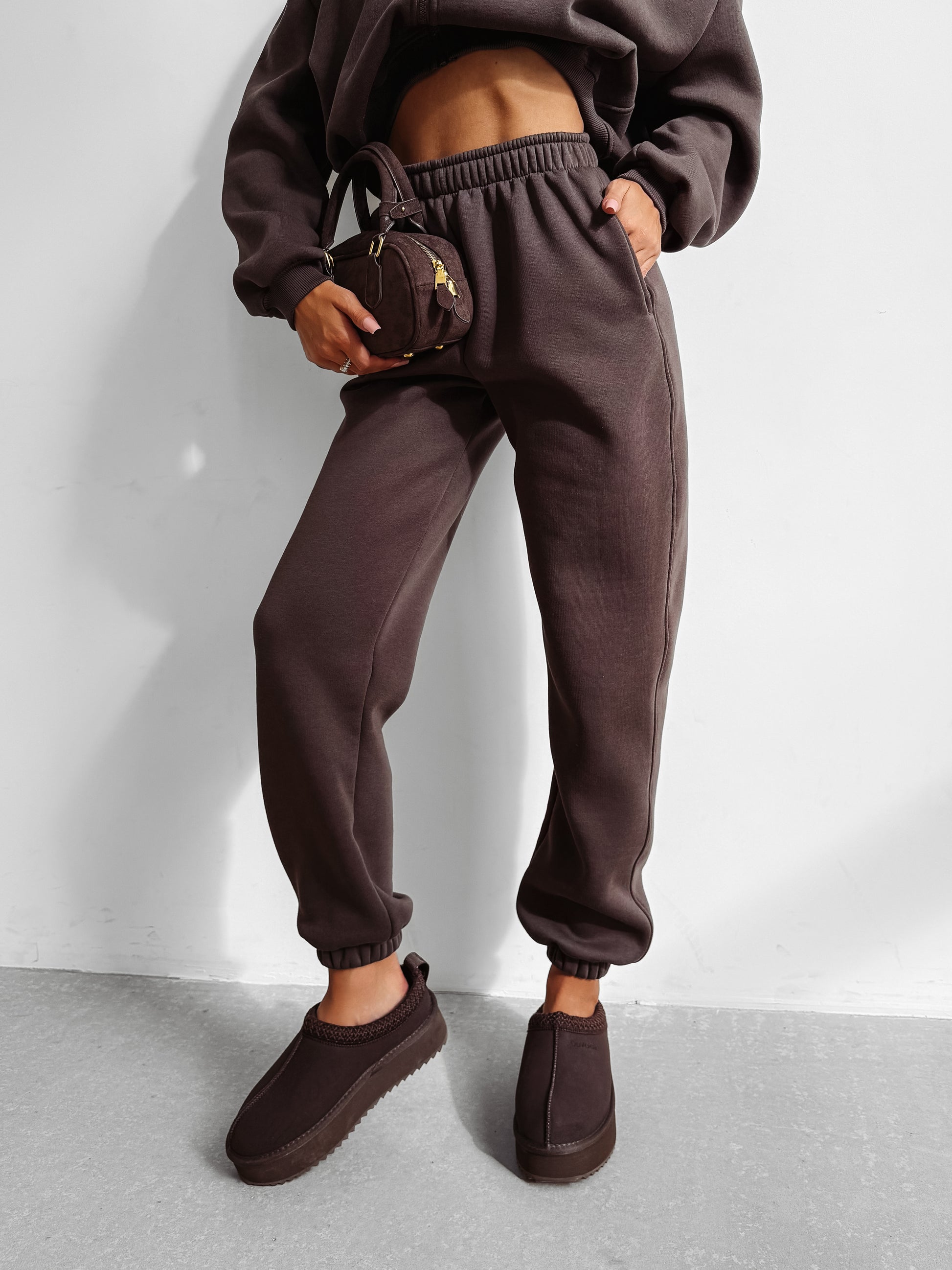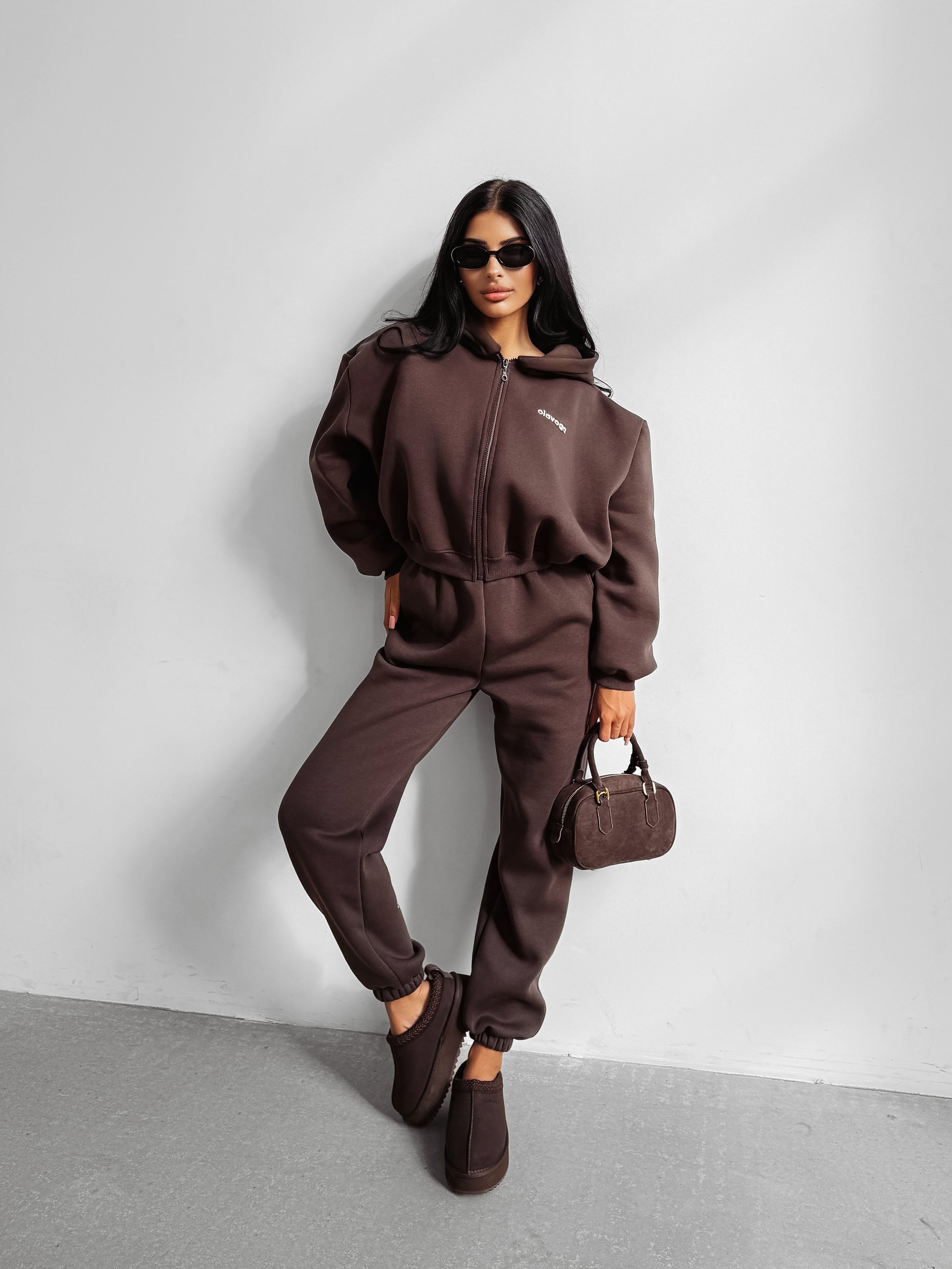 Bottoms: Sporty high-waisted joggers with elastic waistband and ribbed cuffs. Functional side pockets and a back pocket for a practical finish. Subtle OLAVOGA embroidery on the back of the legs completes the look.