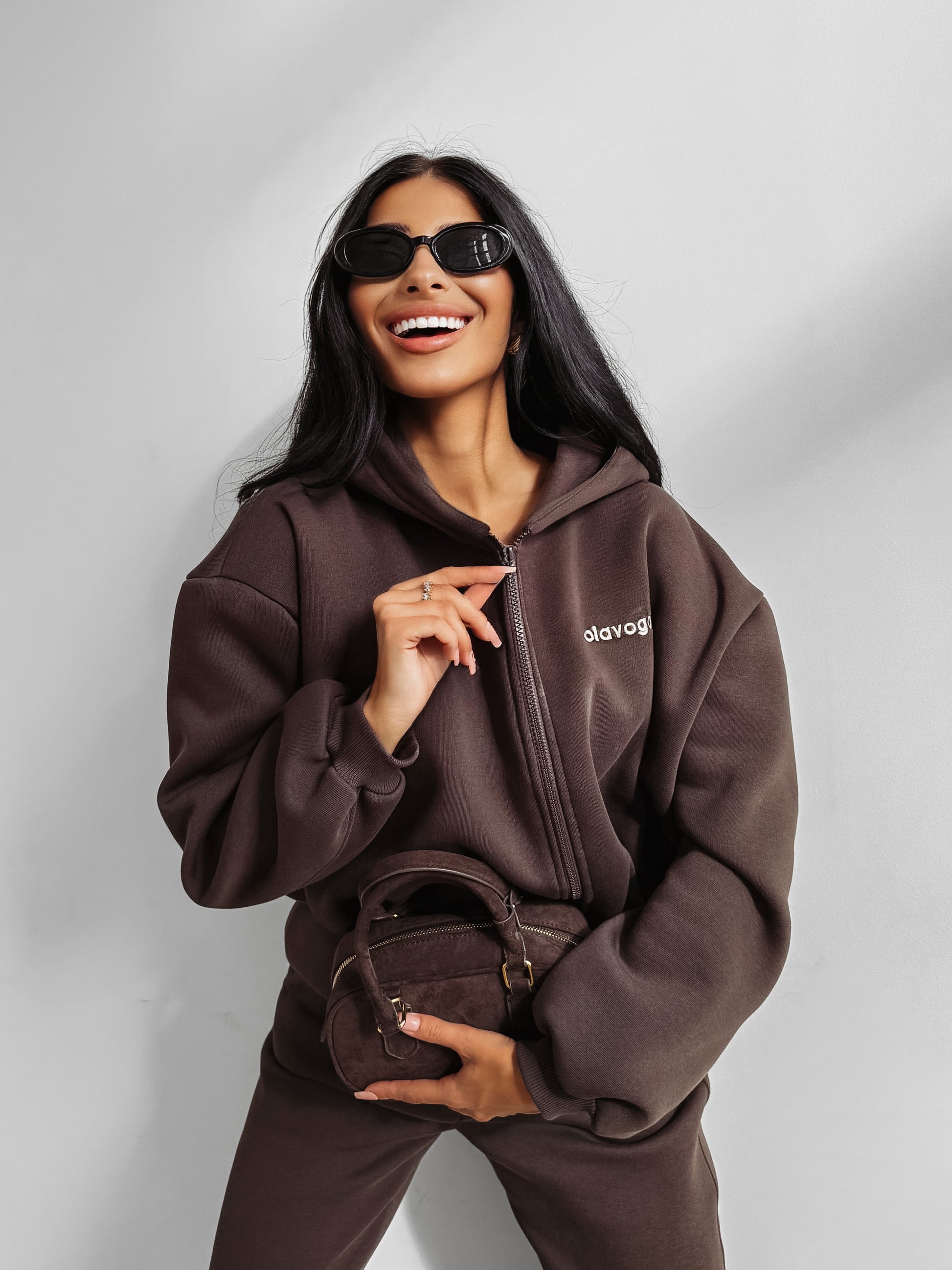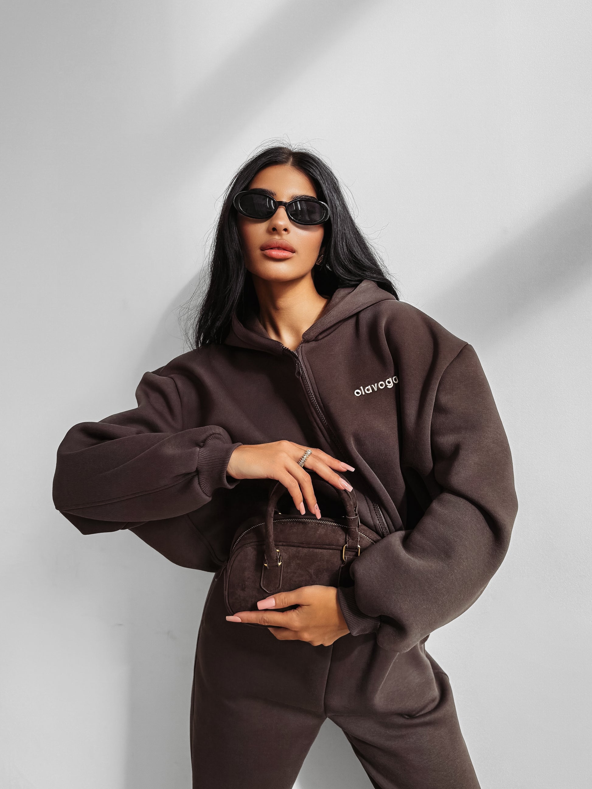 Top: Cropped zip-up hoodie with ribbed trims and the signature OLAVOGA logo embroidered on the front.
