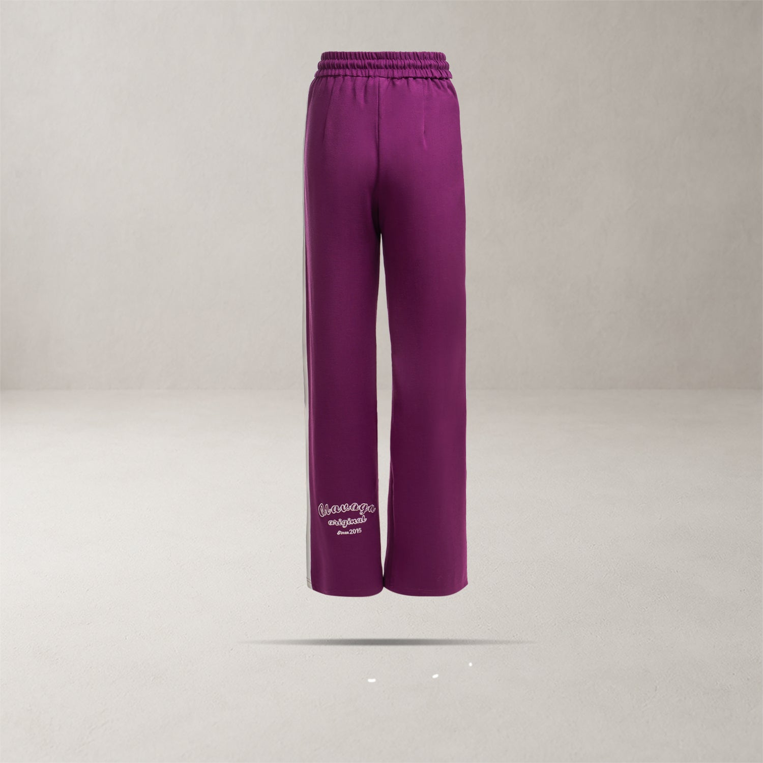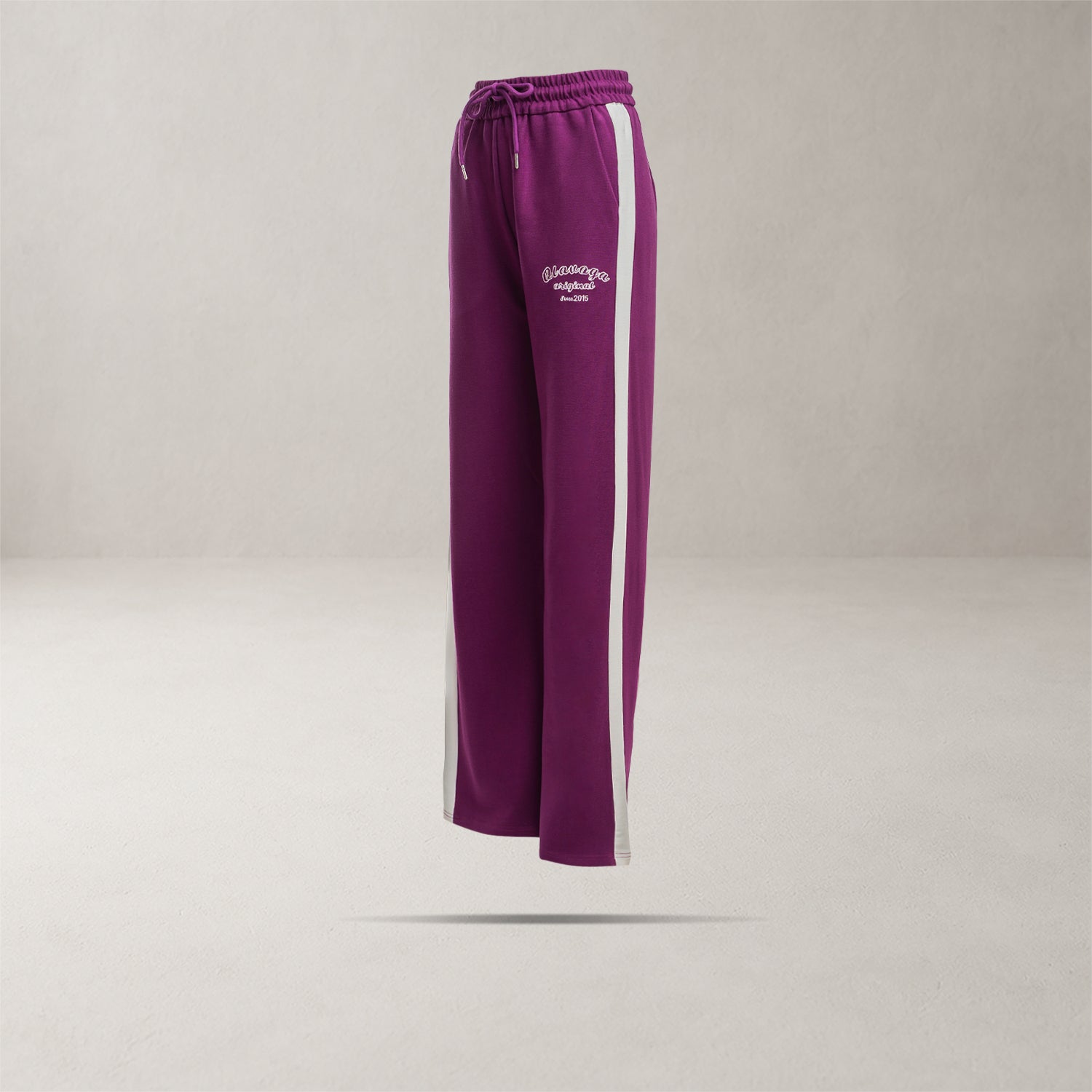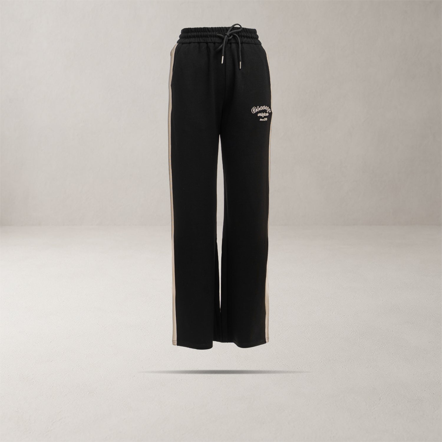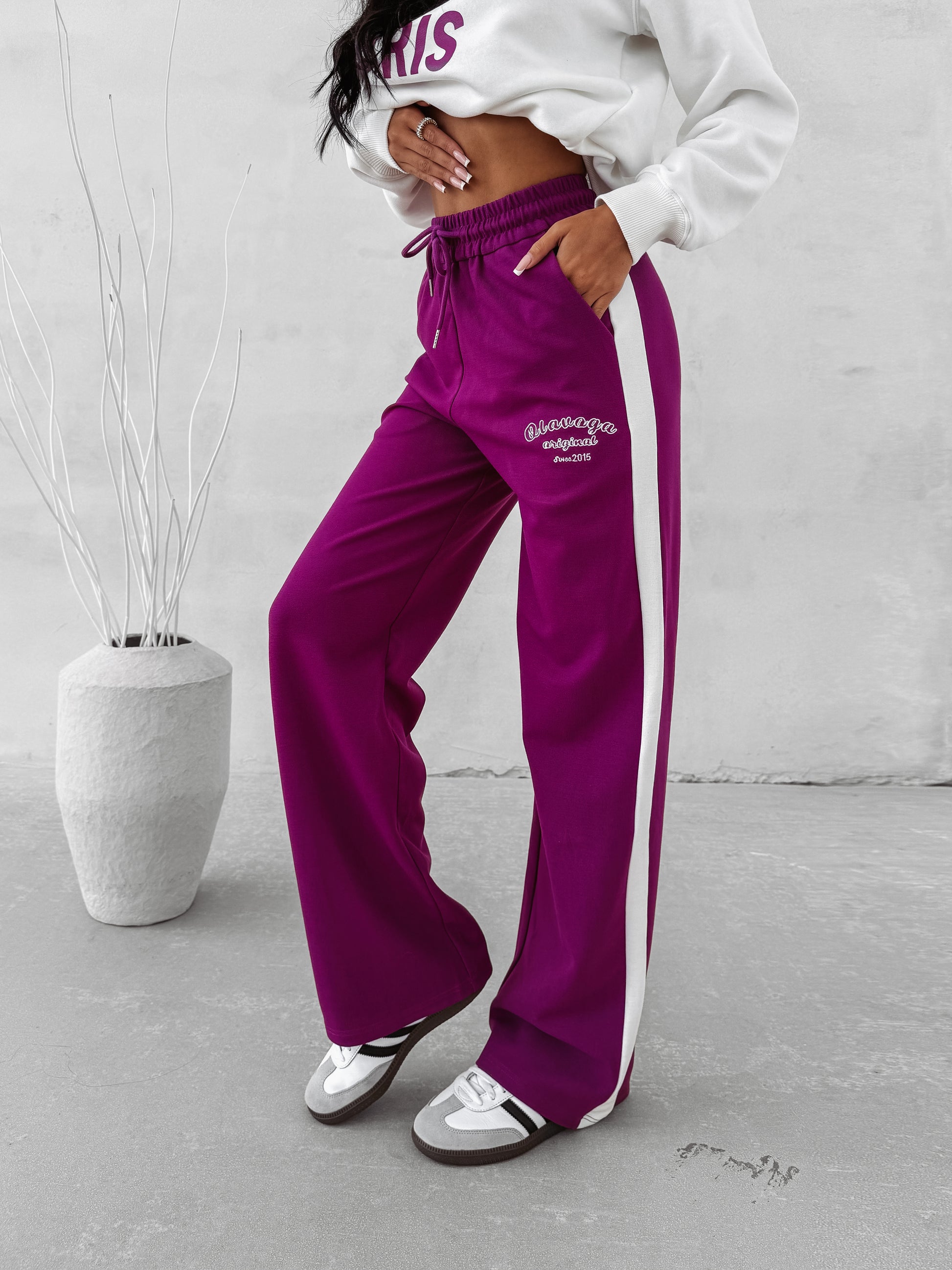 Sport-style trousers with a loose fit and high waist, made of high-quality elastic fabric. Flared leg design with drawstring waist adjustment. Embroidered OLAVOGA Original Since 2015 logo on the back of the leg and contrast side stripes. Branded detailing on the front. Pairs perfectly with the OLAVOGA Hoodie Charme 2025 for a coordinated set.