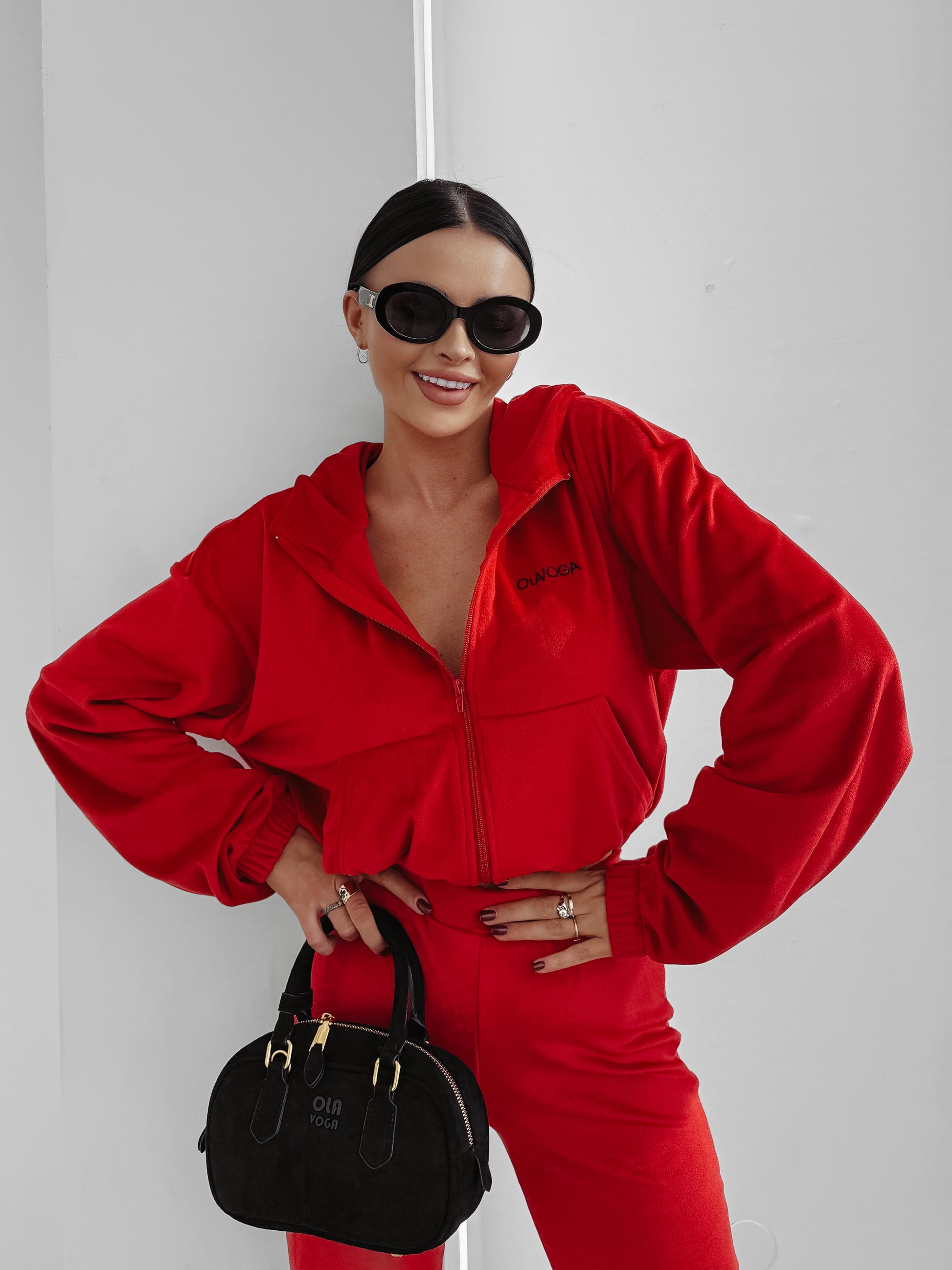 Top: Zip-up hoodie with a cropped fit. Side pockets. Delicate embroidered OLAVOGA logo on the front. Adjustable waist.