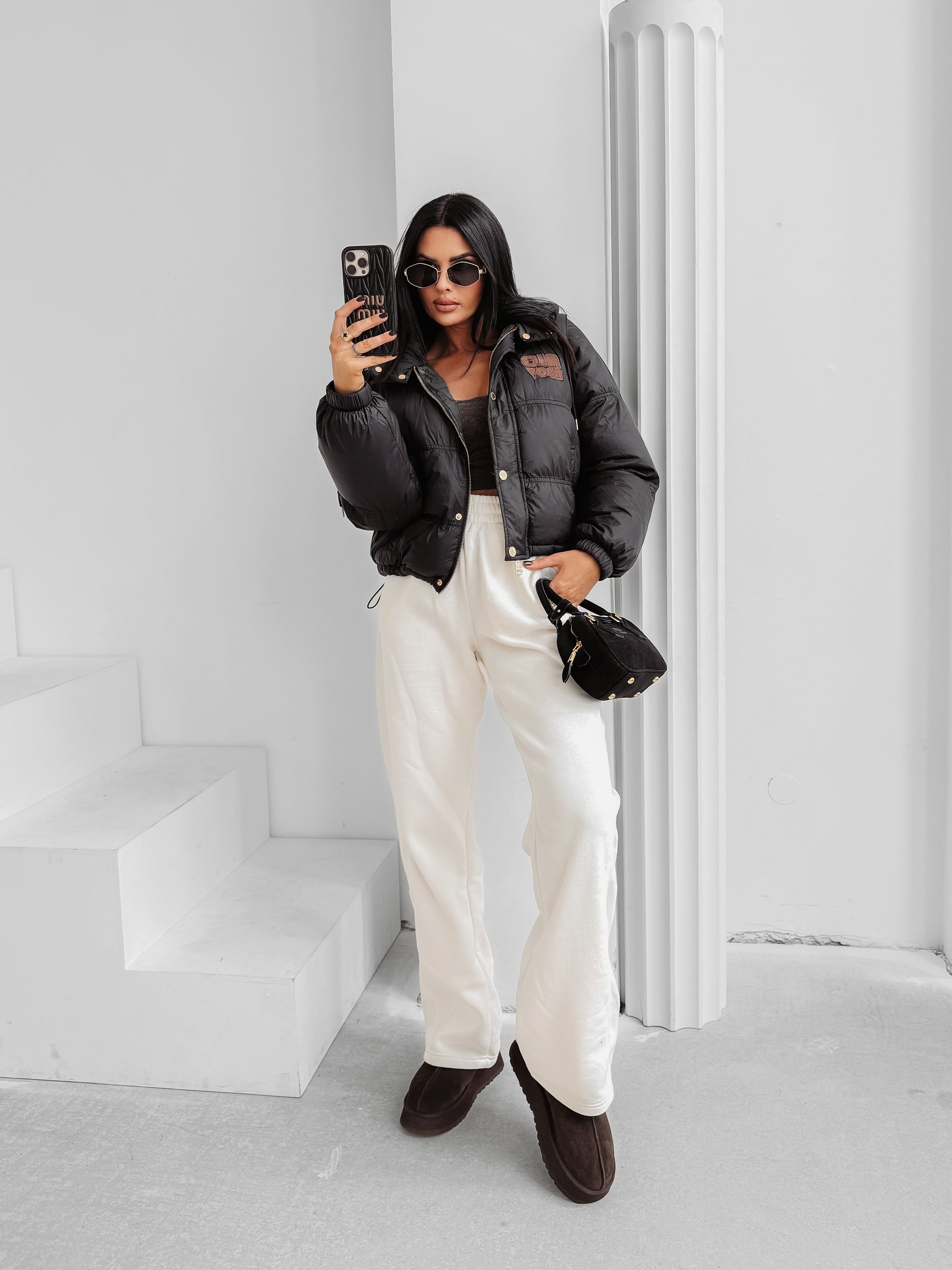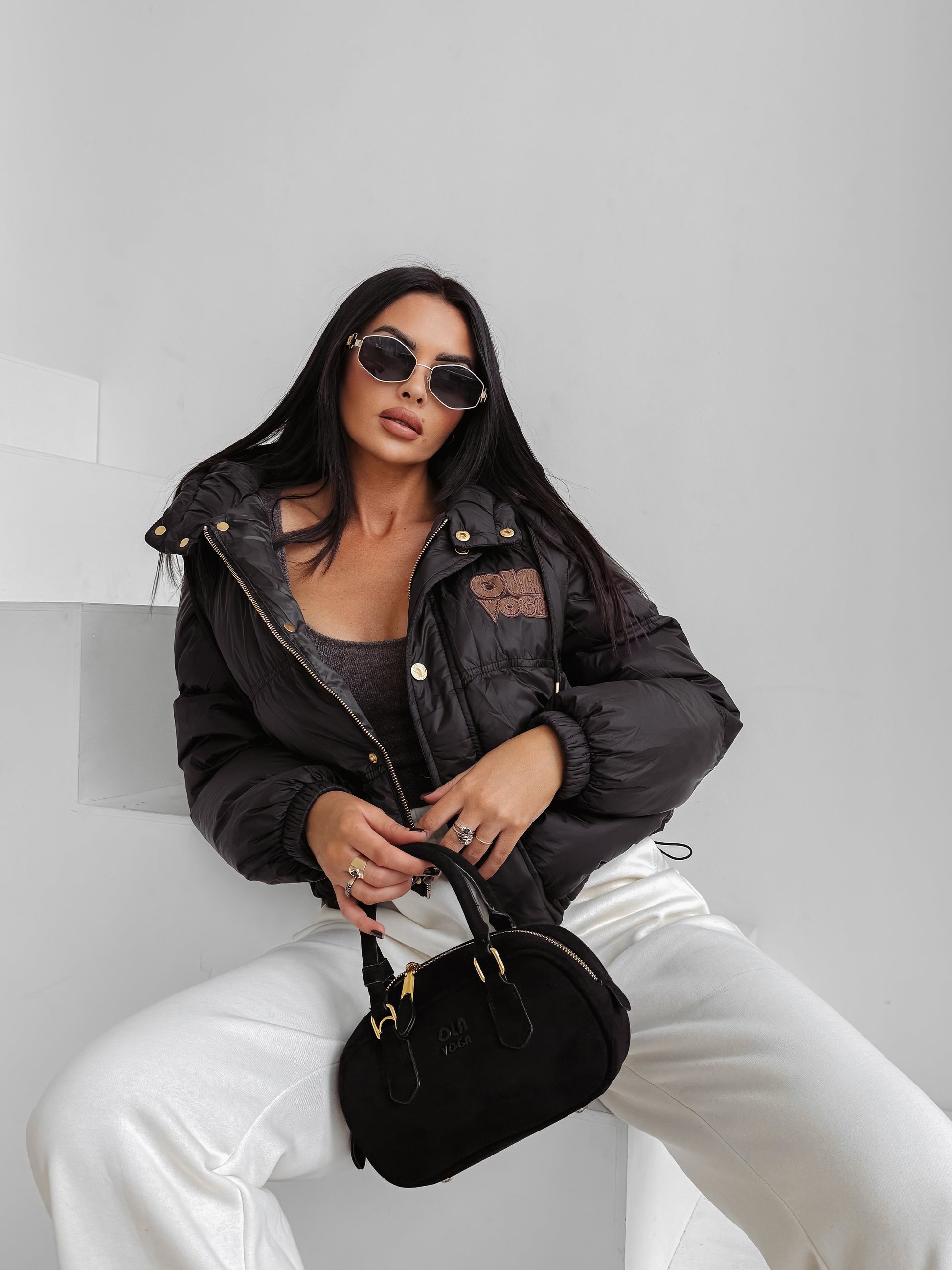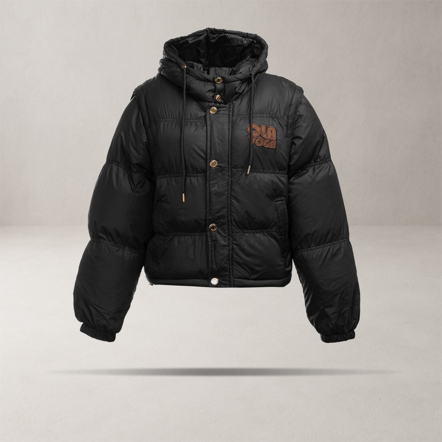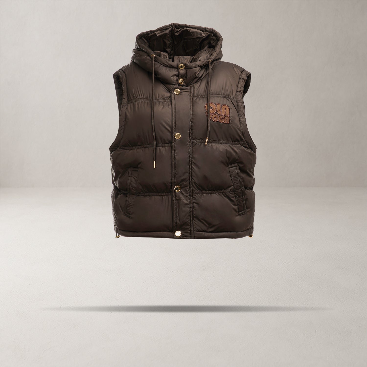 Casual quilted jacket-vest hybrid with a modern, practical design. Made of lightweight, soft-touch fabric with a subtle sheen. Features detachable sleeves, an oversized hood with adjustable drawstring, and a delicately embroidered OLAVOGA logo on the front.