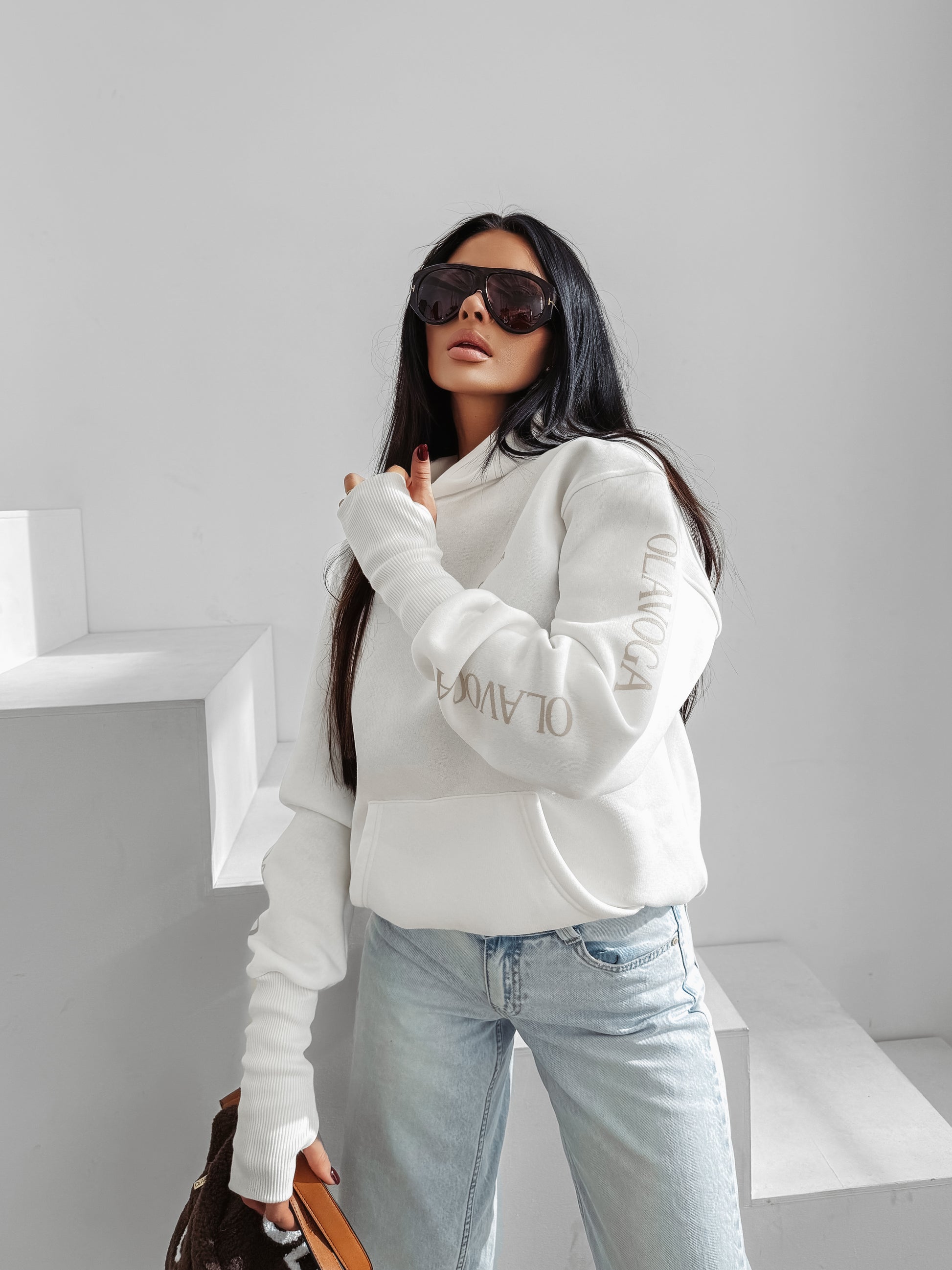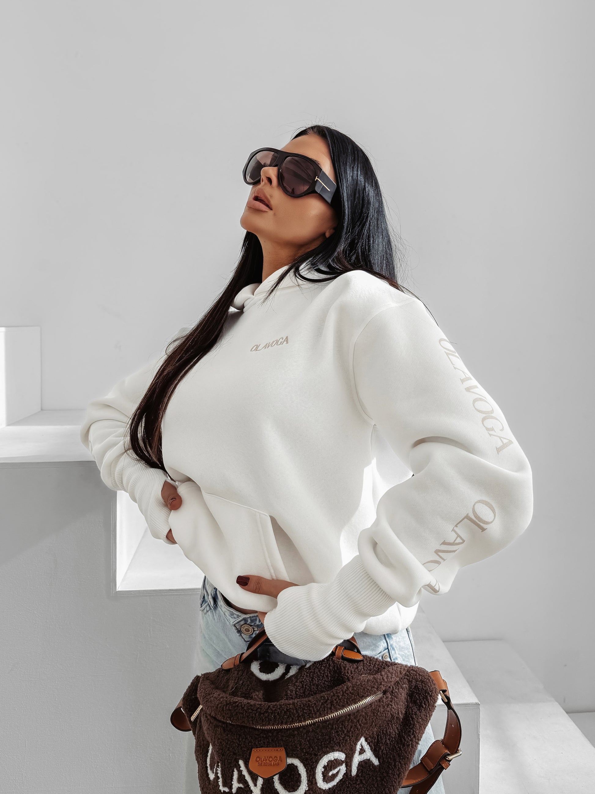 An oversized hoodie designed for effortless comfort and modern elegance. Made from soft, high-quality cotton blend fabric with a heavier weight for a premium feel. Features a large front pocket, ribbed cuffs, thumb-hole sleeves, and side logo tape details. The front is finished with an embroidered OLAVOGA logo, adding a subtle statement touch to this relaxed silhouette.